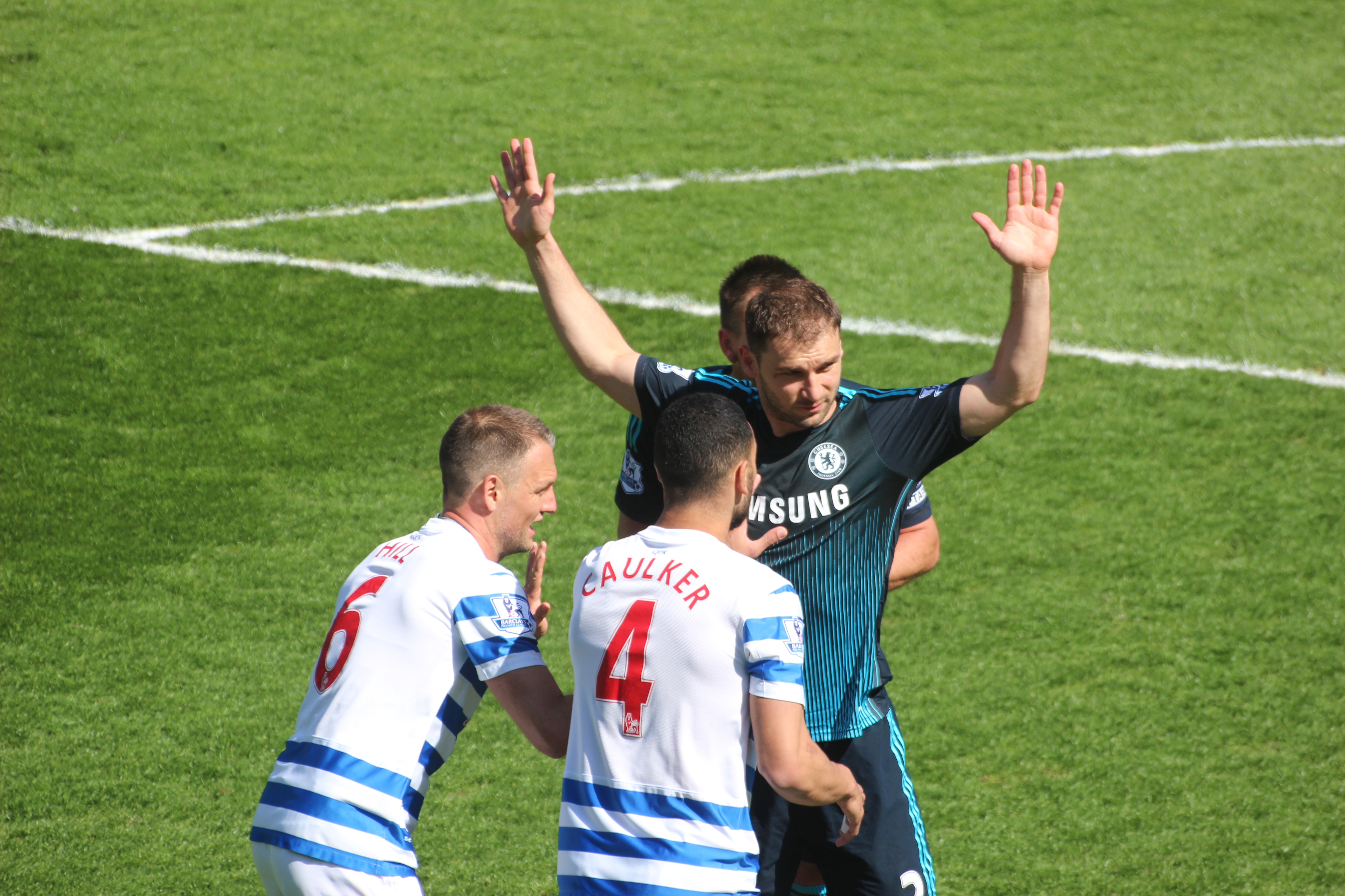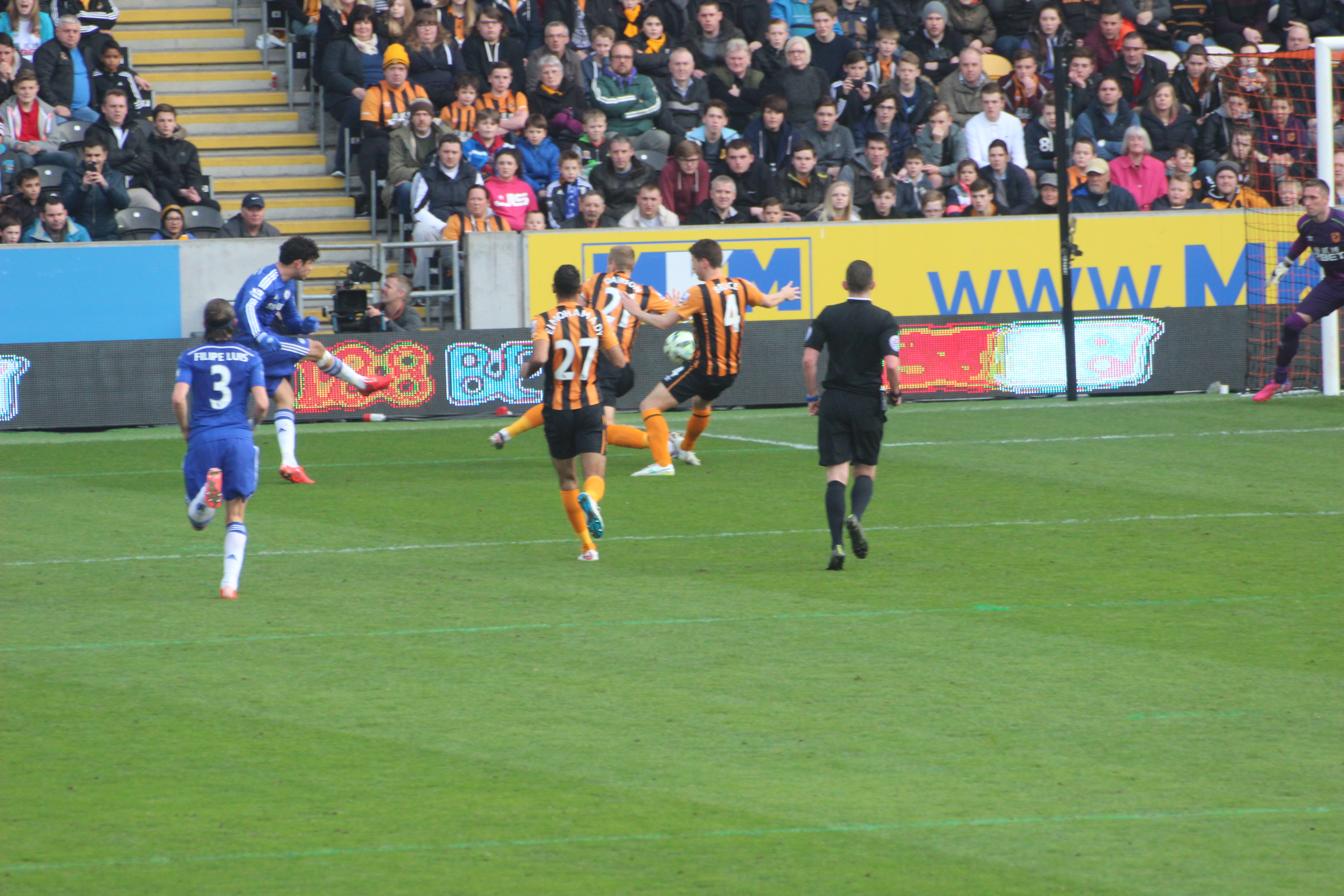 Ah, the game. Yet again, all of the various pre match chats had managed to avoid the game itself. The first big surprise was that Eden Hazard, rumoured to be out due to the lingering side-effects of a dental operation, was playing. We had learned that this would be Didier Drogba’s last ever game for us and he was playing from the start. Also in was Petr Cech; would this be his last game, too? The back line in front of Big Pete was the standard four of 2014/2015, but Jose Mourinho chose Jon Obi Mikel – maybe his last game too? – alongside Nemanja Matic. The attacking three were Hazard, Willian and Cuadrado.