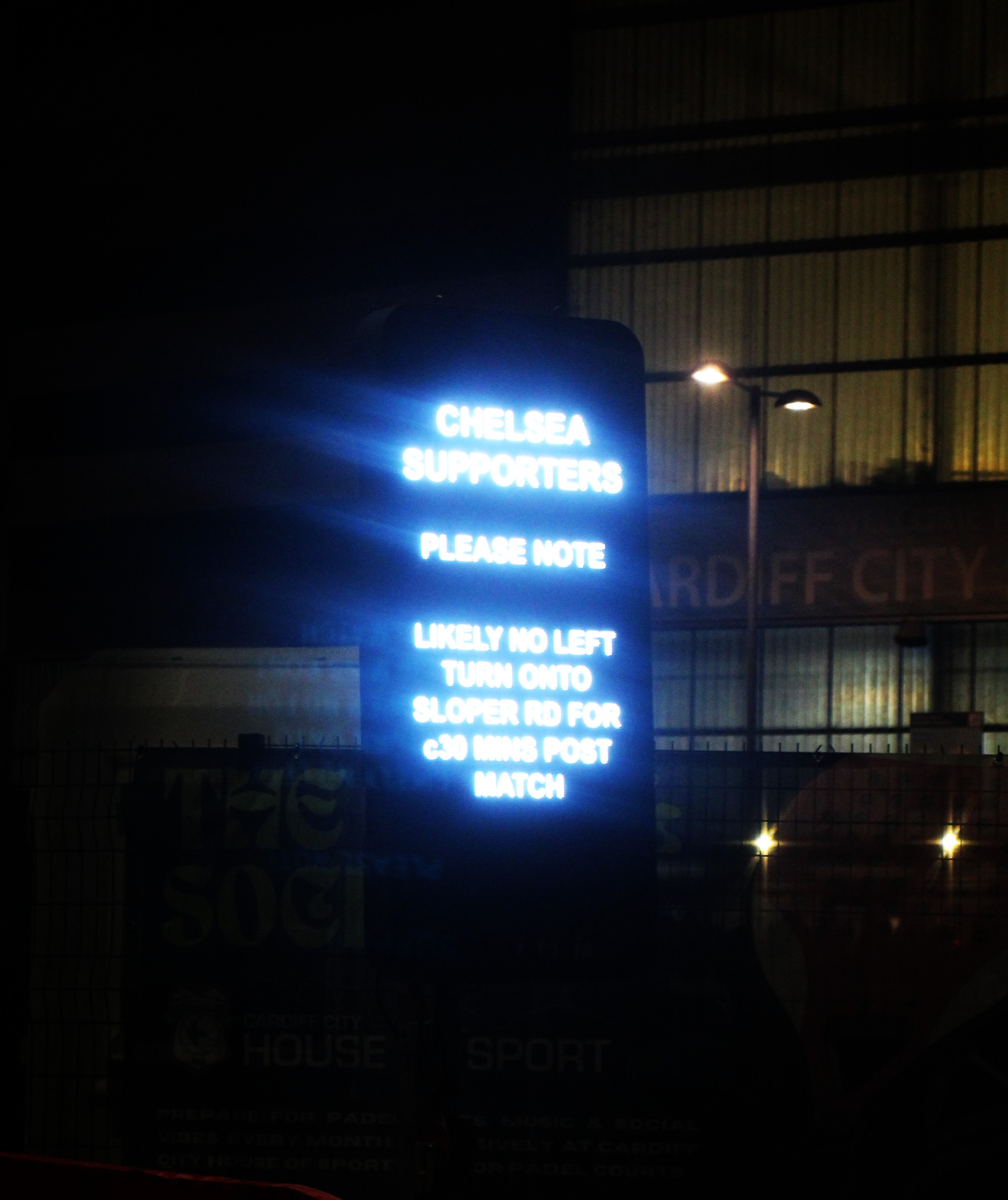 For the game at Cardiff, I worked 8am to 4pm, and I collected PD and Parky at the latter’s house in Holt at 4.15pm. I envisaged reaching my pre-paid parking spot on Sloper Road, right opposite the away entrance, at around 6pm, but hideously slow-moving traffic in Cardiff itself meant that I wasn’t parked up until 7pm.