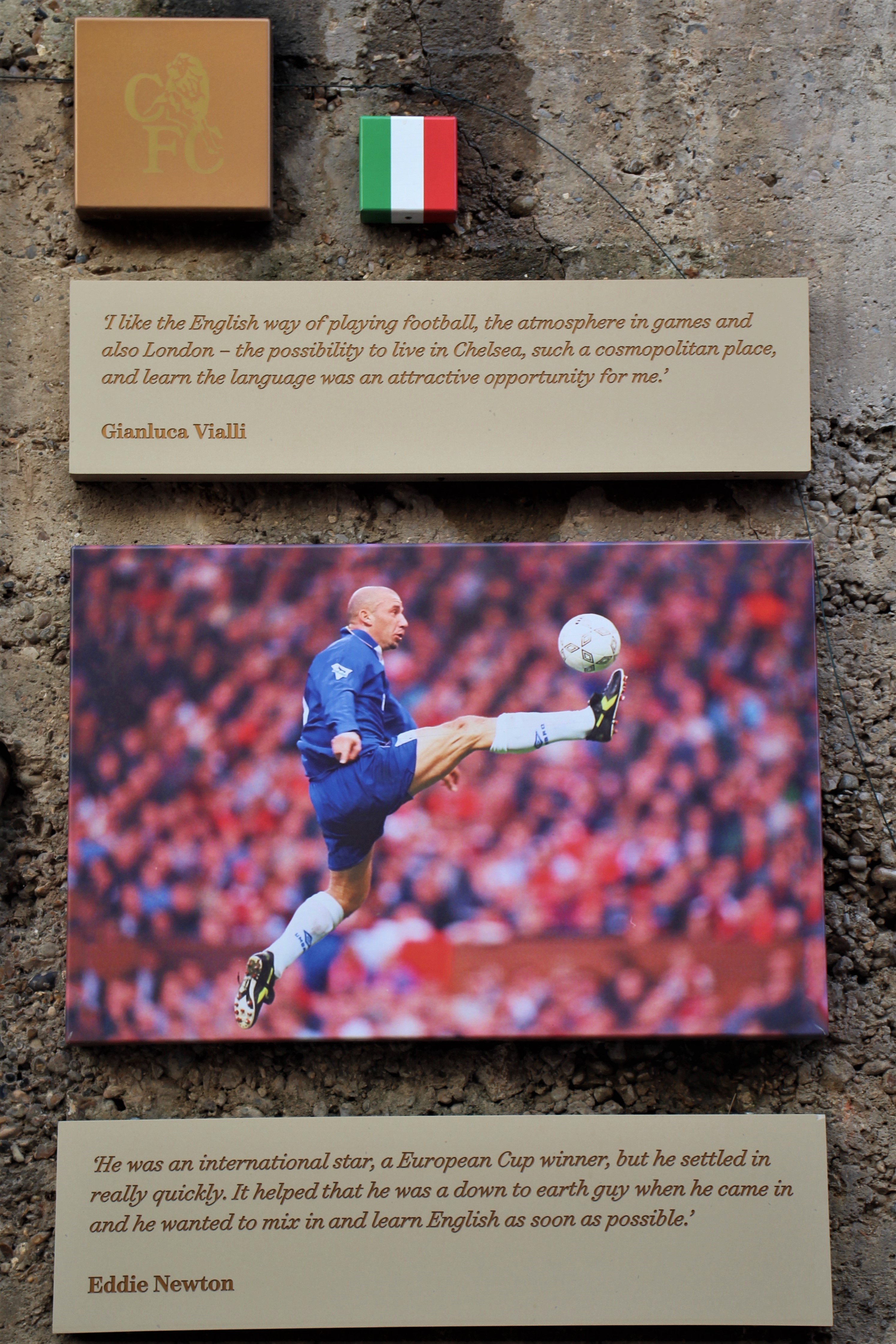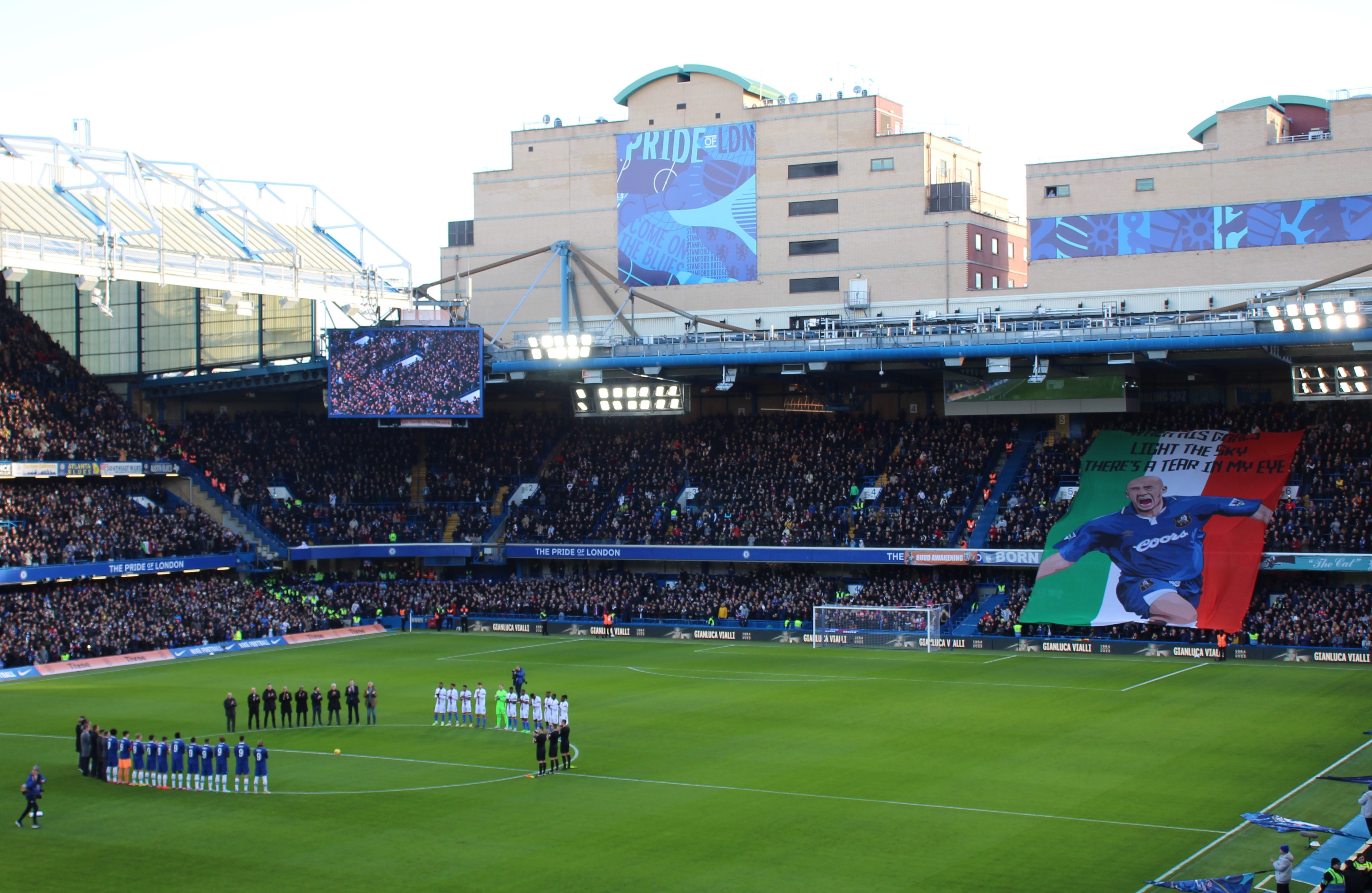 Just before the teams came onto the pitch, Joe Cole and Rio Ferdinand, on “Sky TV” duty, walked behind the goal from a previous position and headed right past me and into the guts of the Clock End using the exit tunnel. Joe Cole was serenaded by us all and he reciprocated by hugging a couple of Chelsea supporters. The Arsenal match mascot – Gunnersaurus – appeared fleetingly too, disappearing into the same void as the former players.