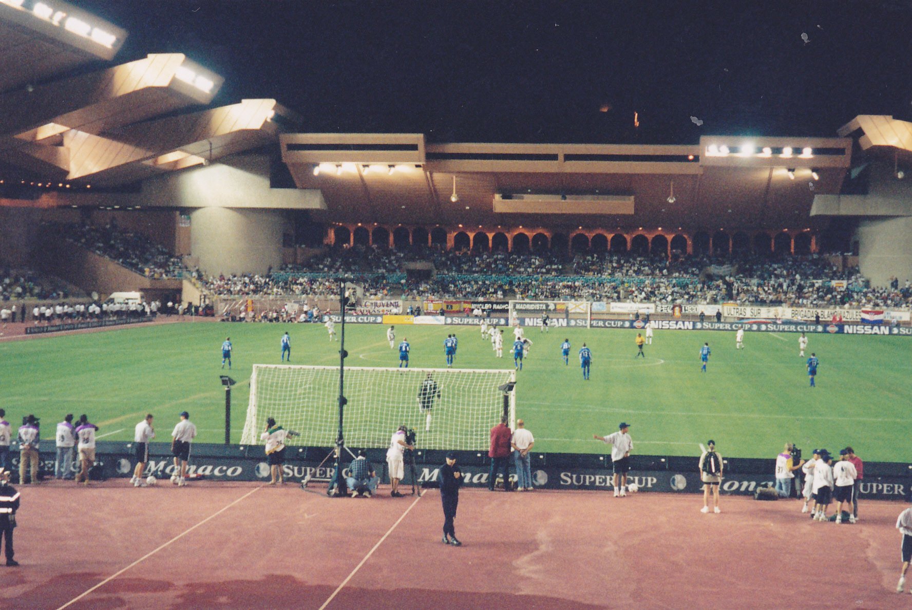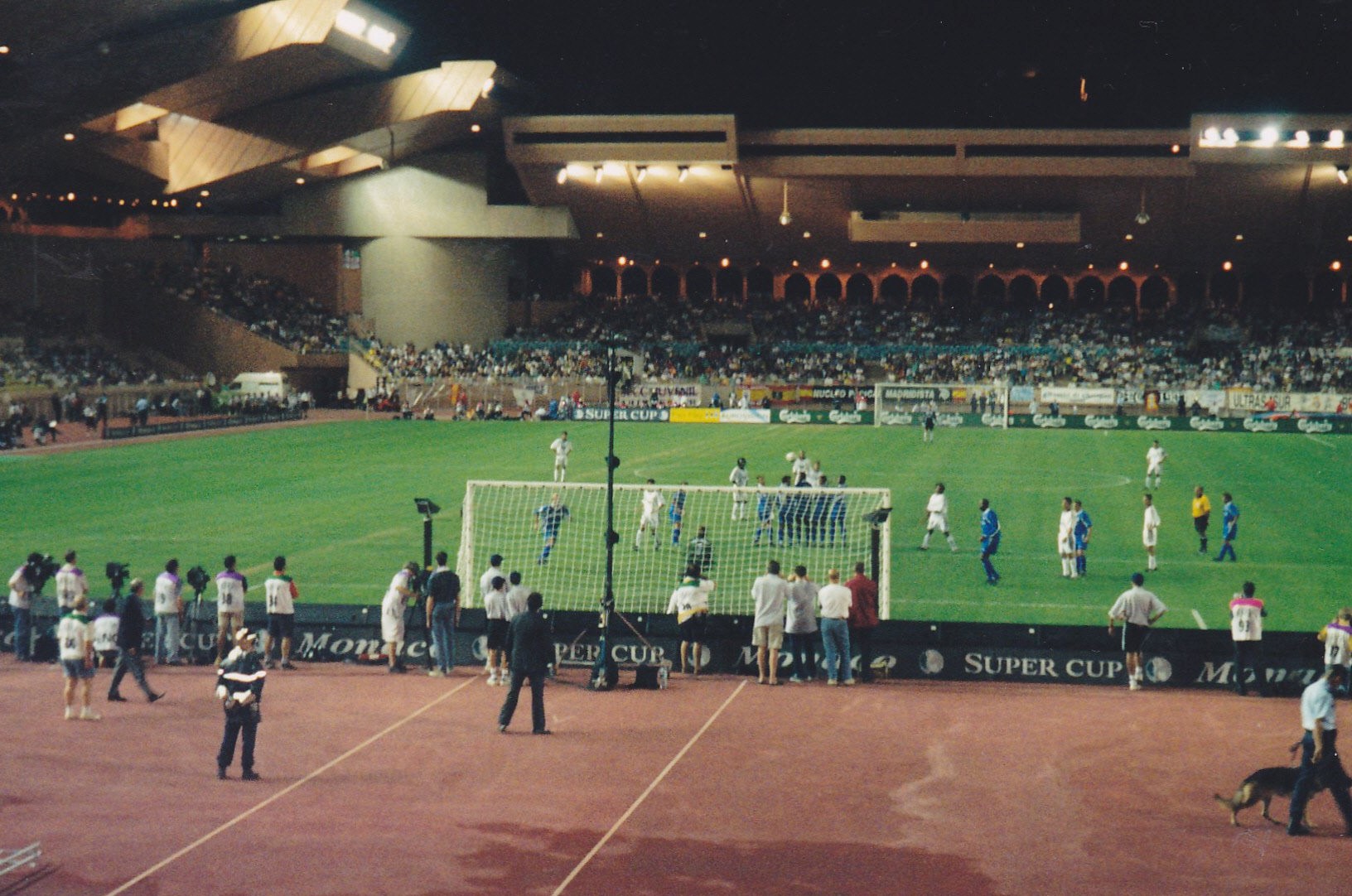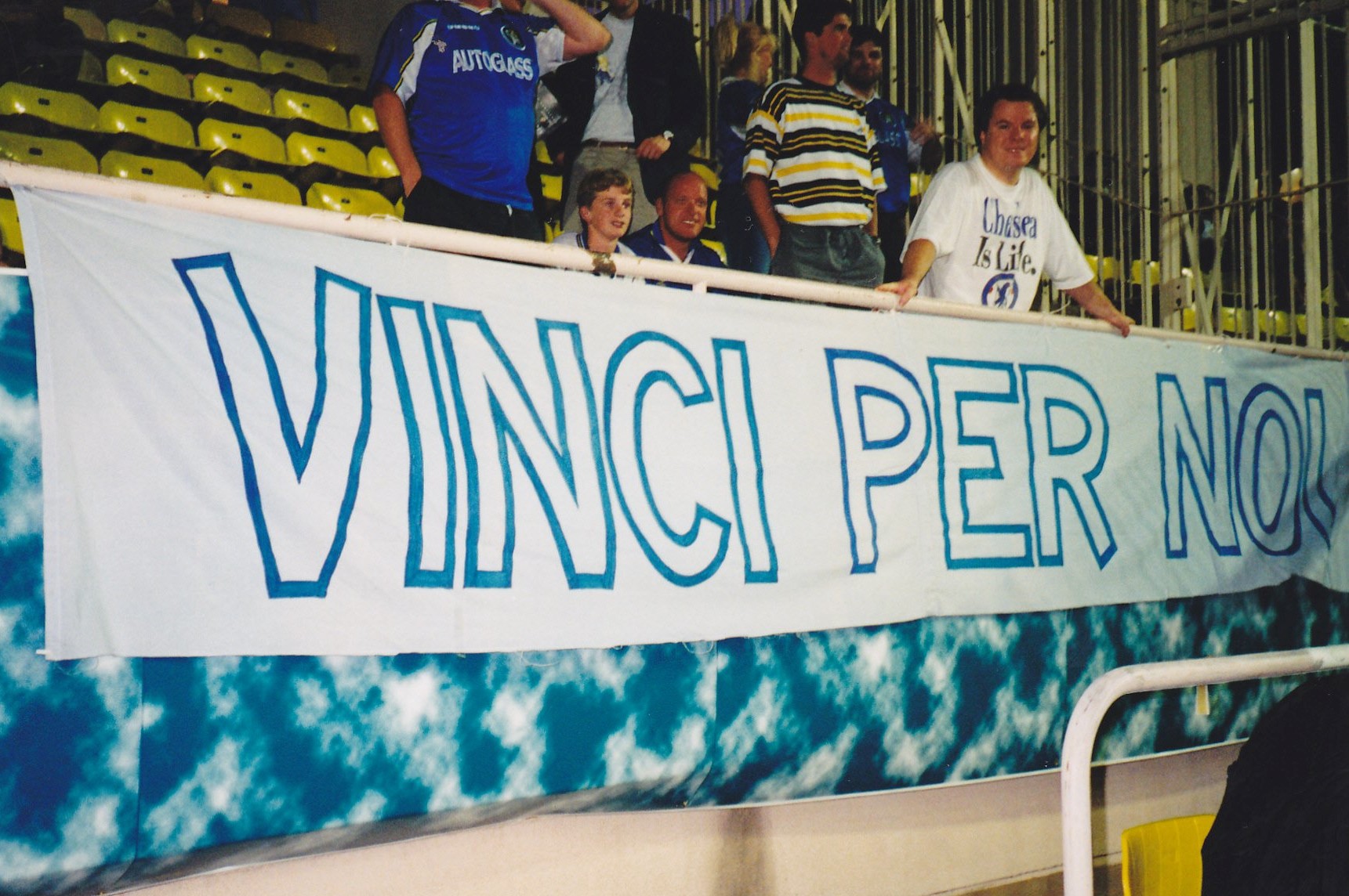 We were deposited in the away end of the rather dusty away end very early ahead of the game that only began at 9.30pm. I hoisted my “VINCI PER NOI” flag and we waited for others to join us. Back in those days, our travelling away support was fearsome, and dominated by geezers in their thirties. We had a big mob in the seats to our left, plus a few thousand in the single-tiered away end. The gate that night was 31,000 and I suspect we had around 3,500 there.