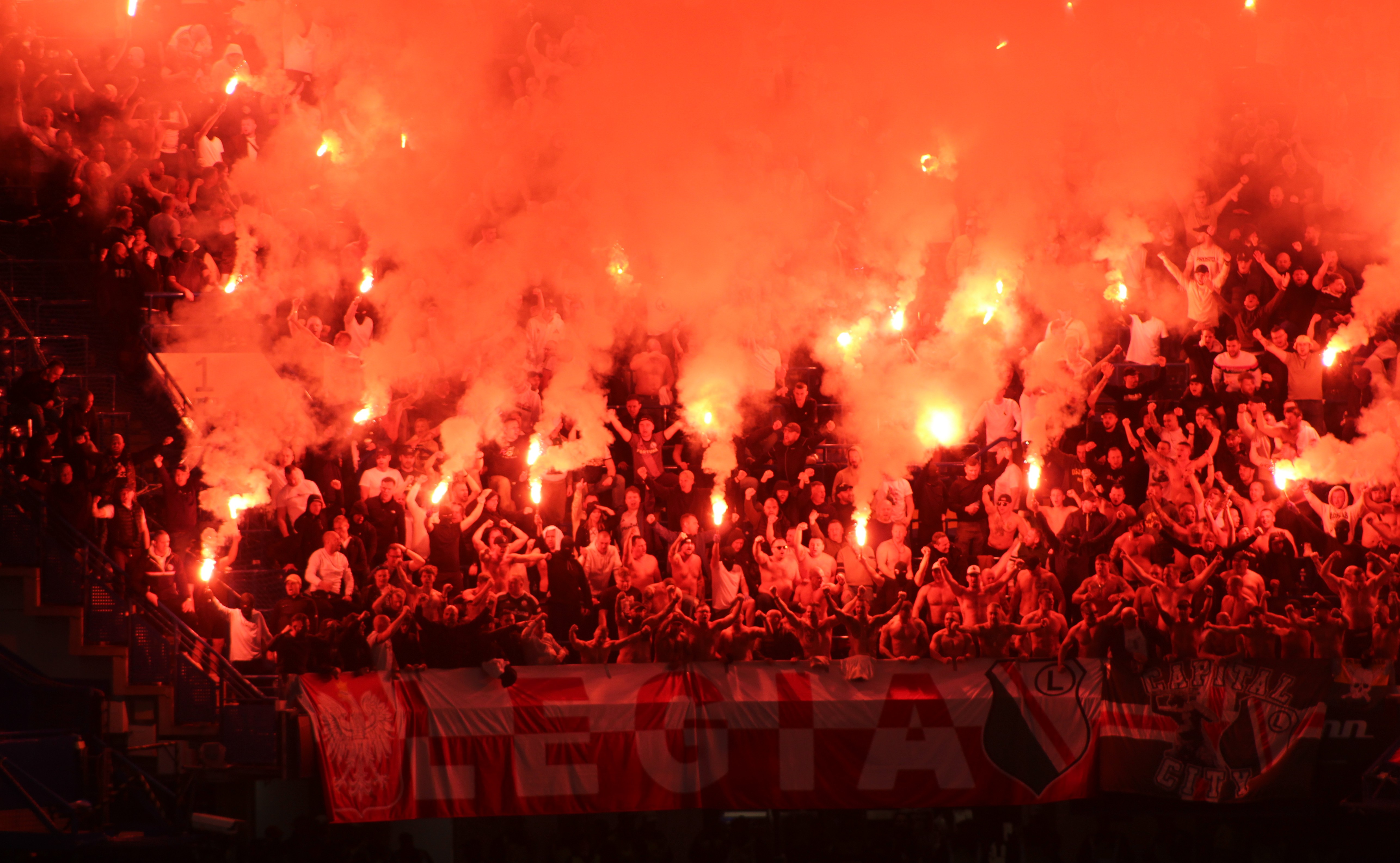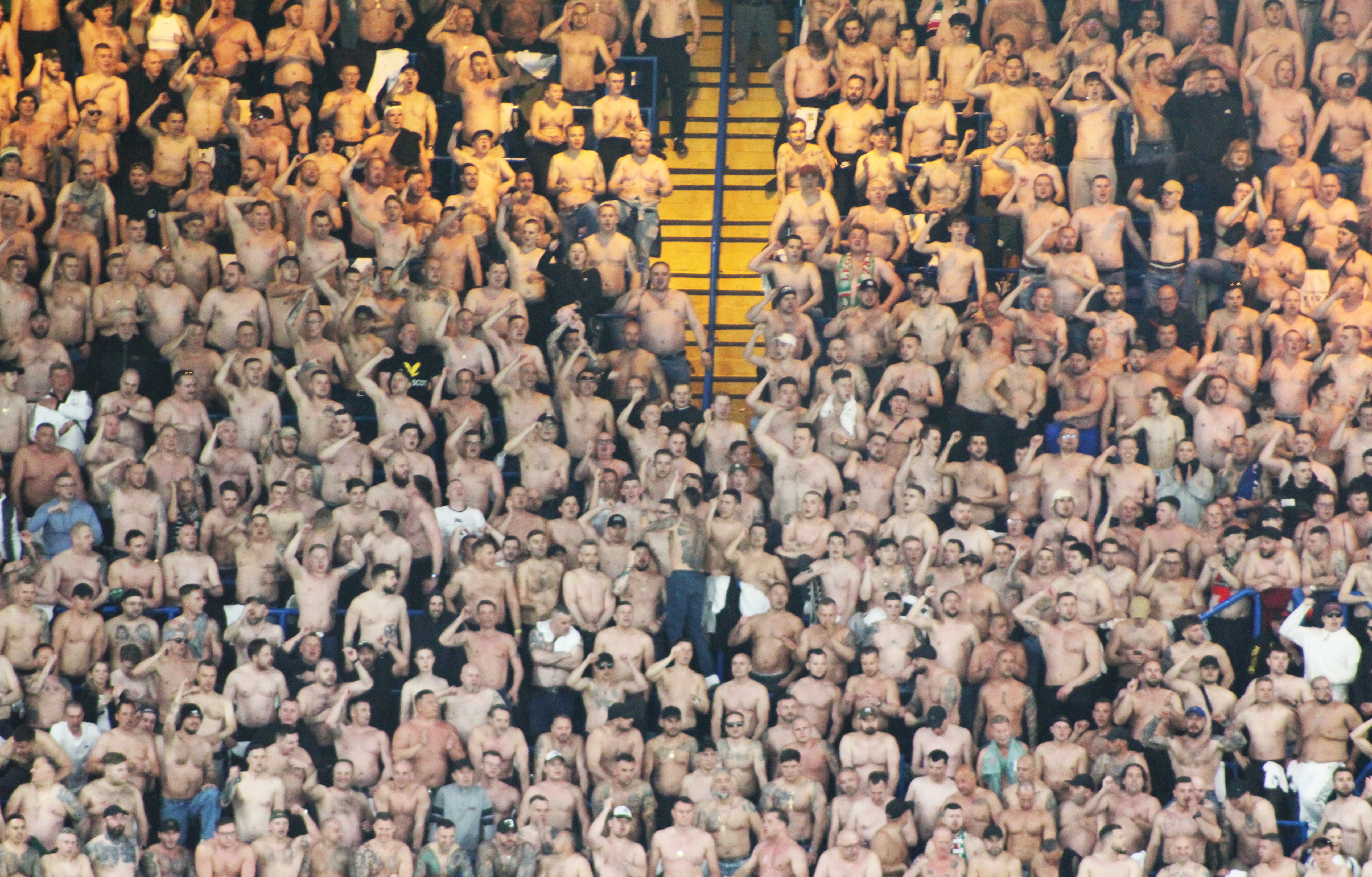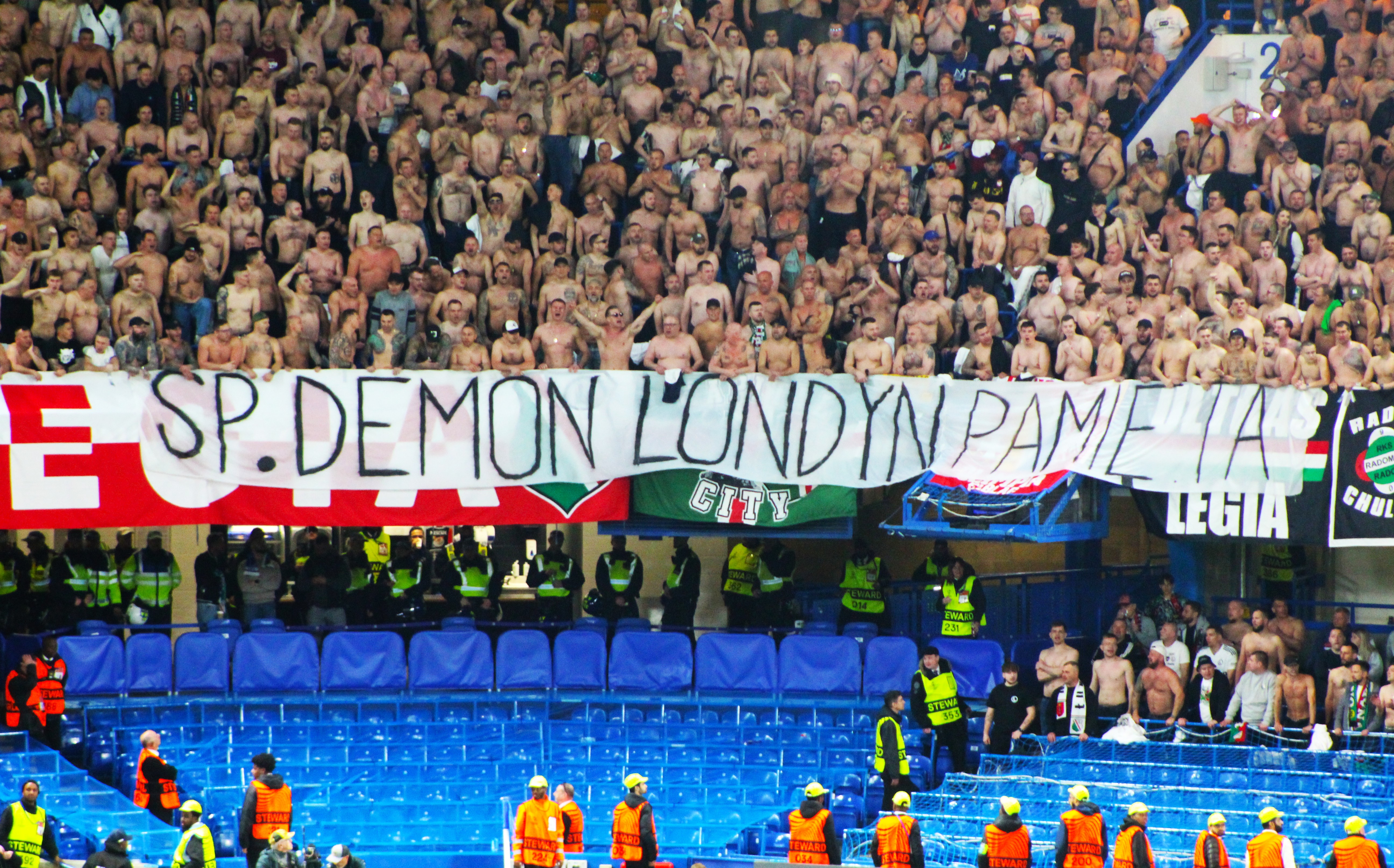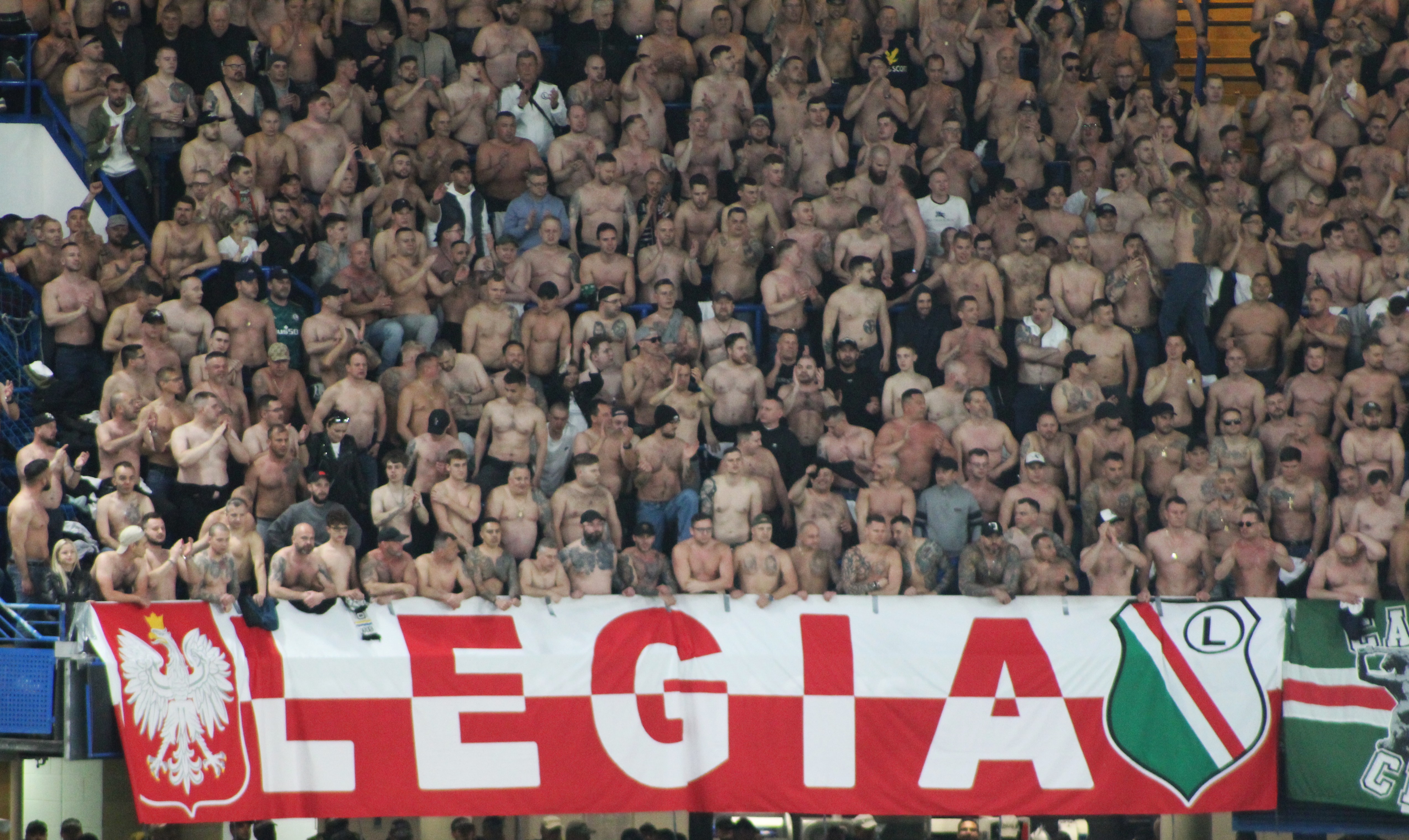 After the goal celebrations had ended, virtually all of the Legia fans – supporters, ultras, call them what you will – took their shirts off. Soon, the whole away section had turned pink, coloured with occasional deep blue ink.