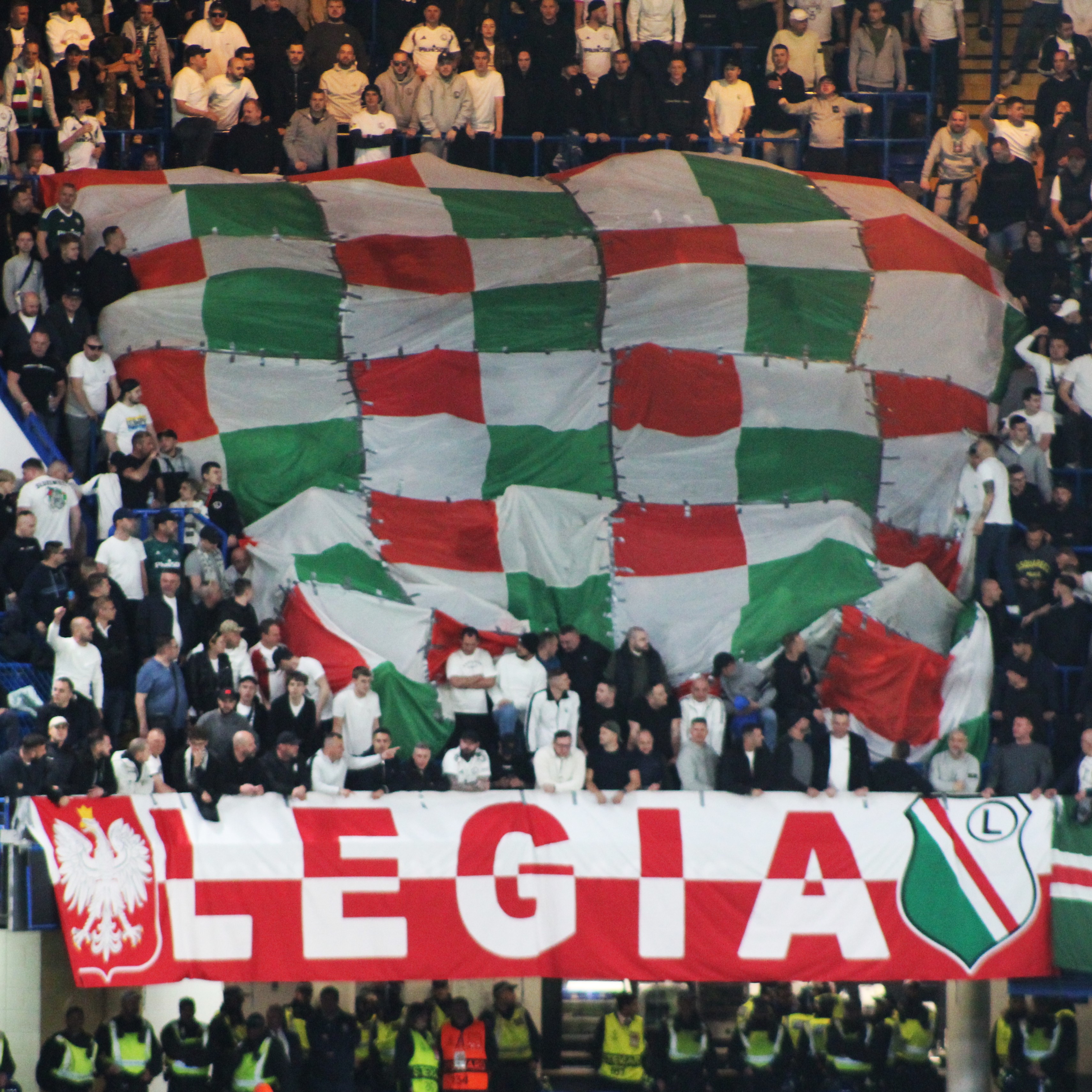 A white, red and green chequered flag was floated over a section of Legia fans in the far corner.