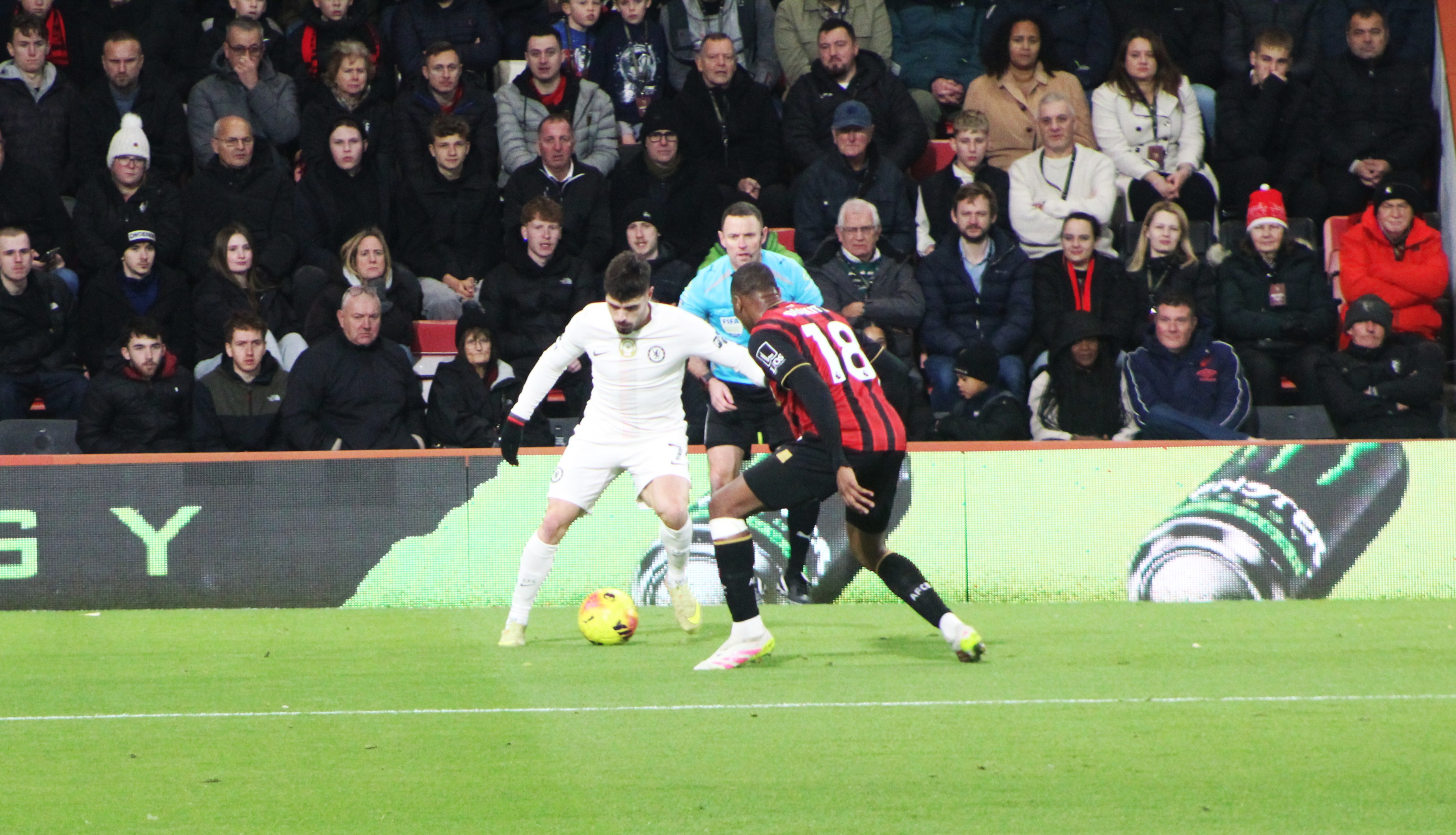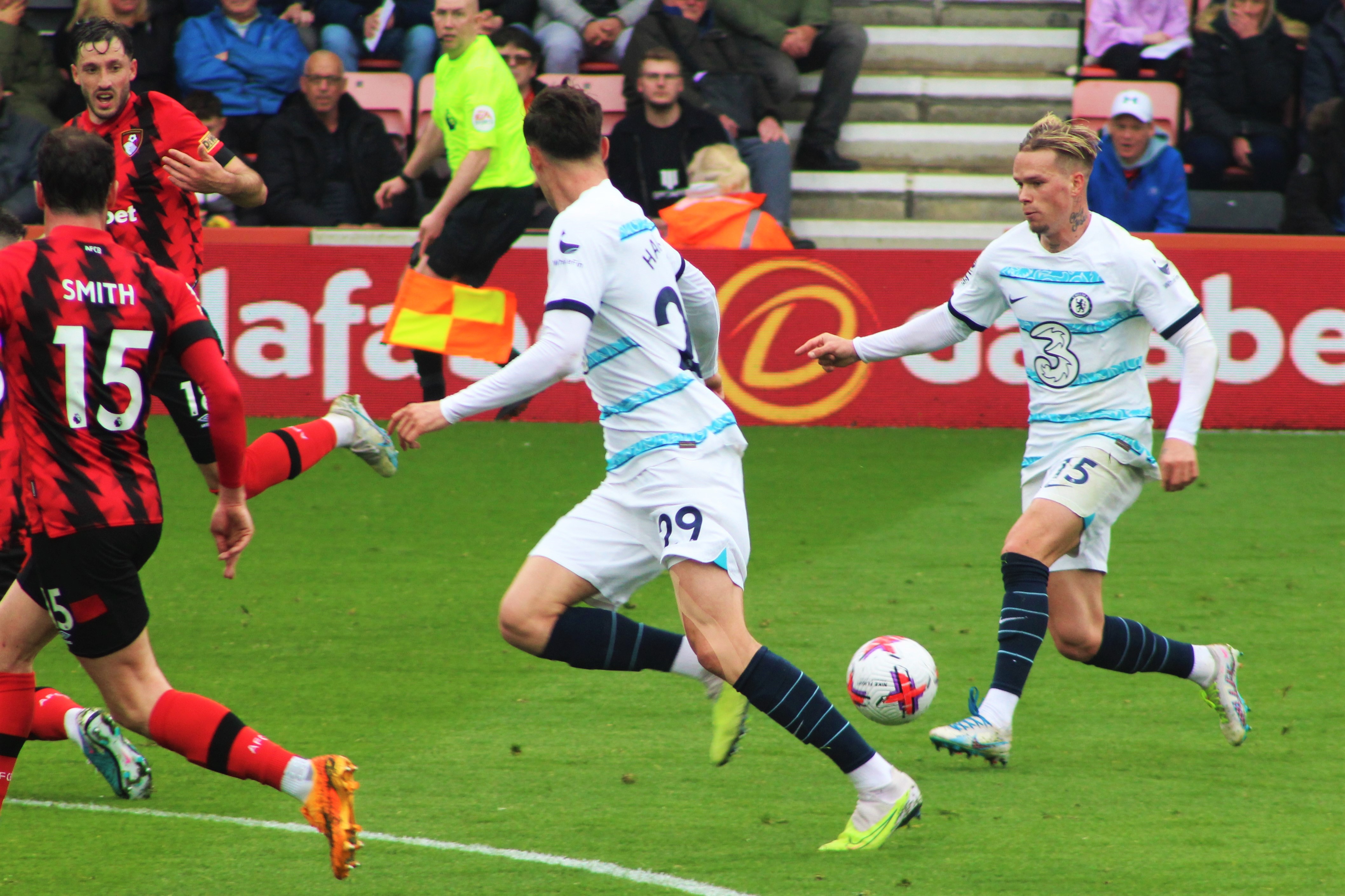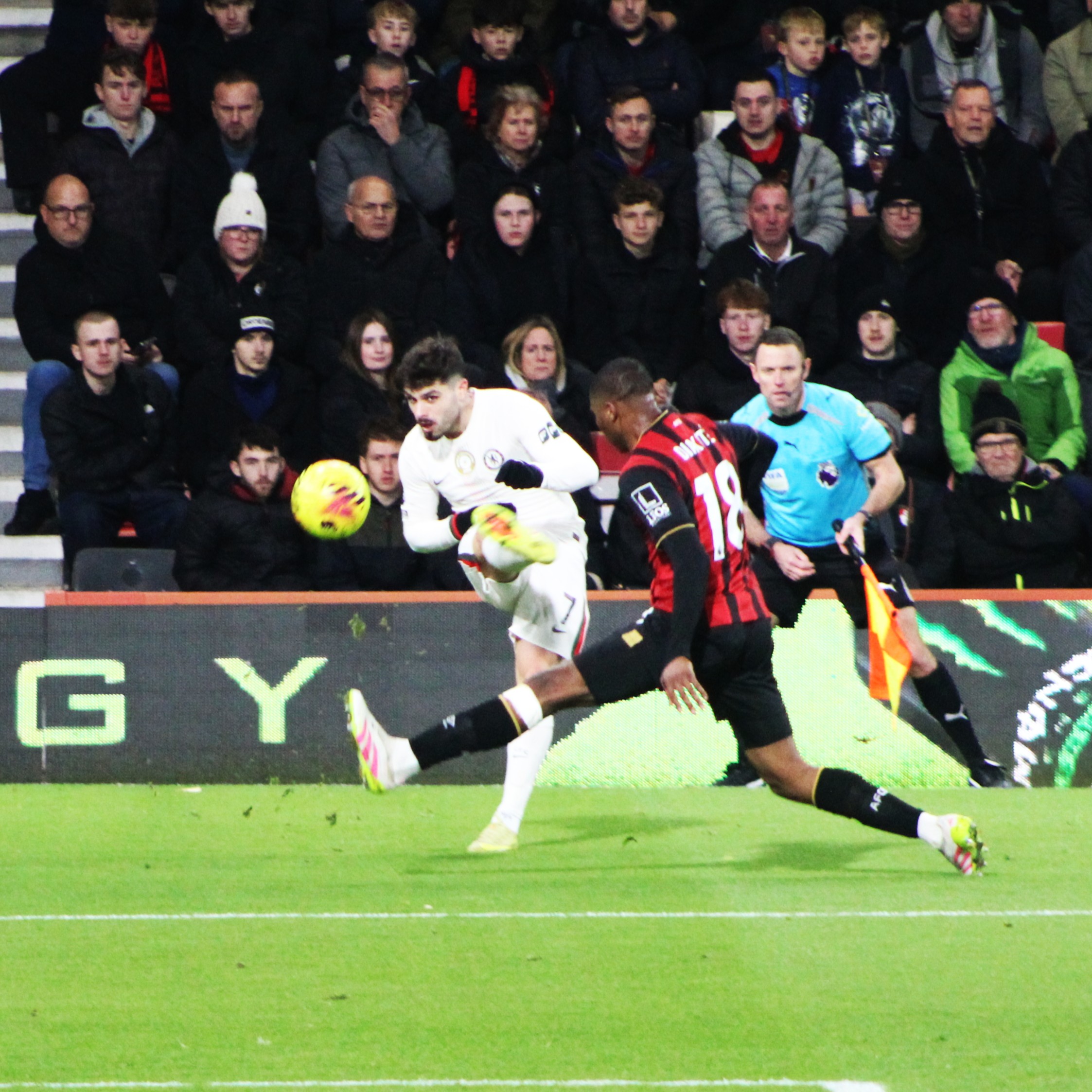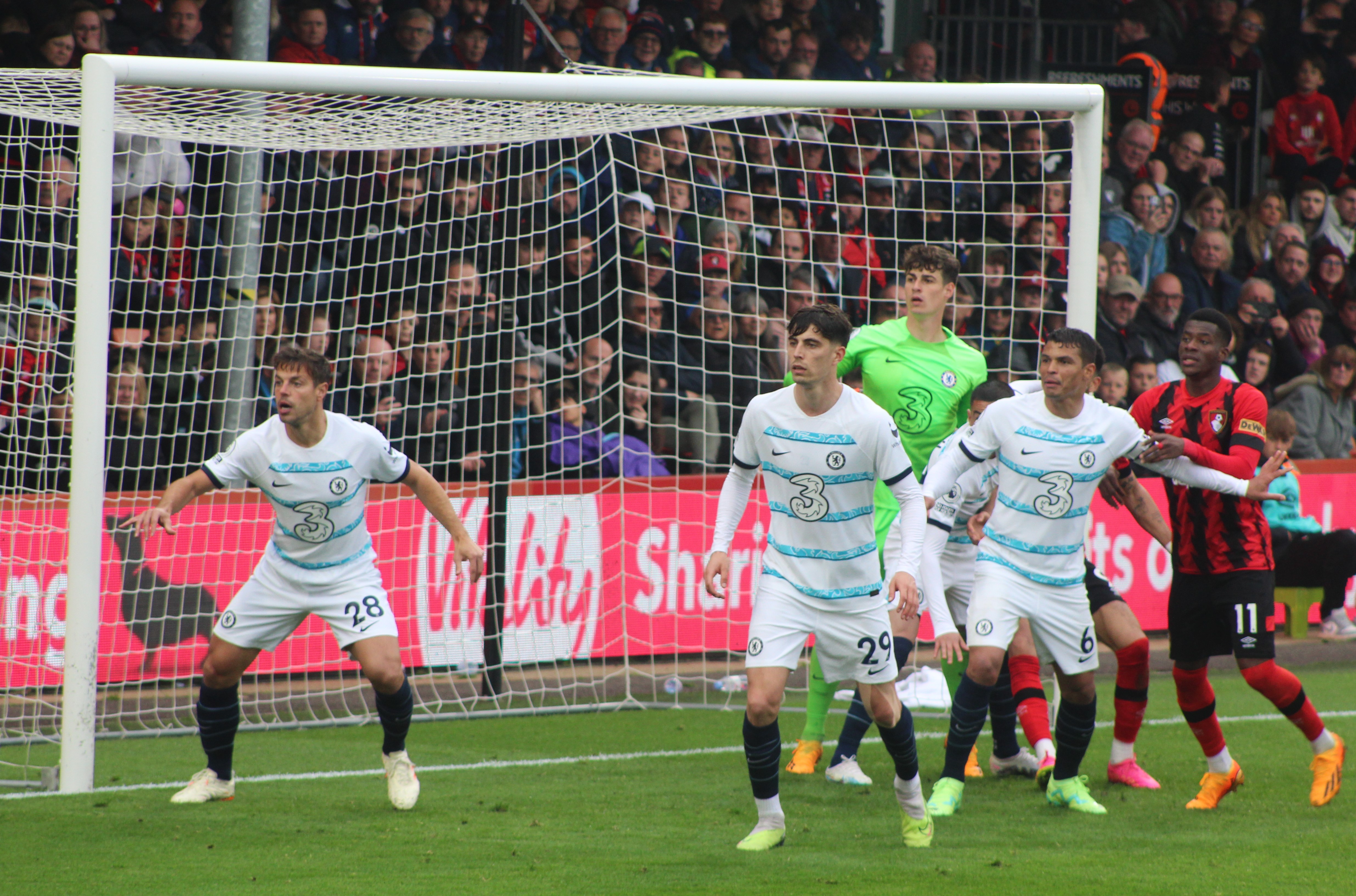 Fraser on the Bournemouth left immediately made an impression and looked the liveliest of the away team. But we were soon on the attack, and a sublime ball from deep from Jorginho found the advanced run of Mount. From an angle, it was always going to be a tough ask, and his shot drew a save from Ramsdale in the Bournemouth goal.