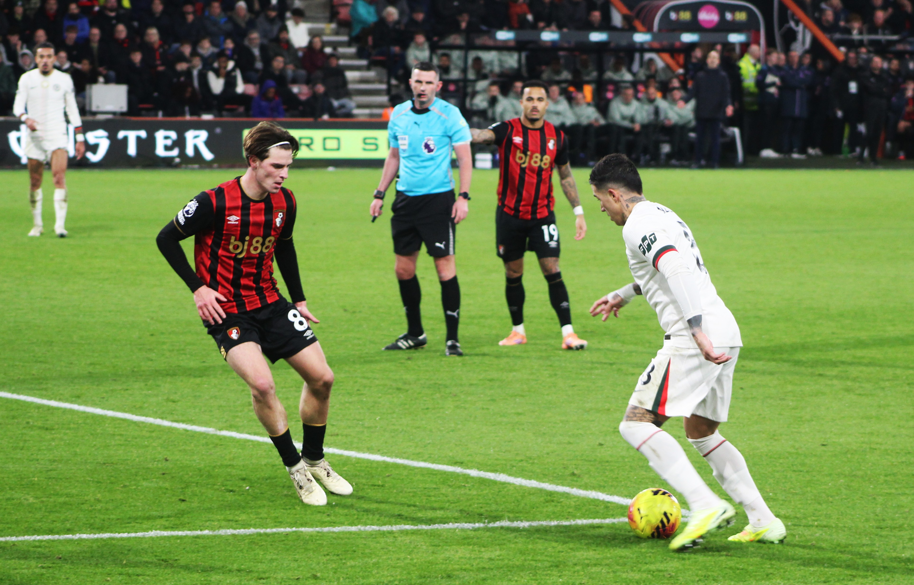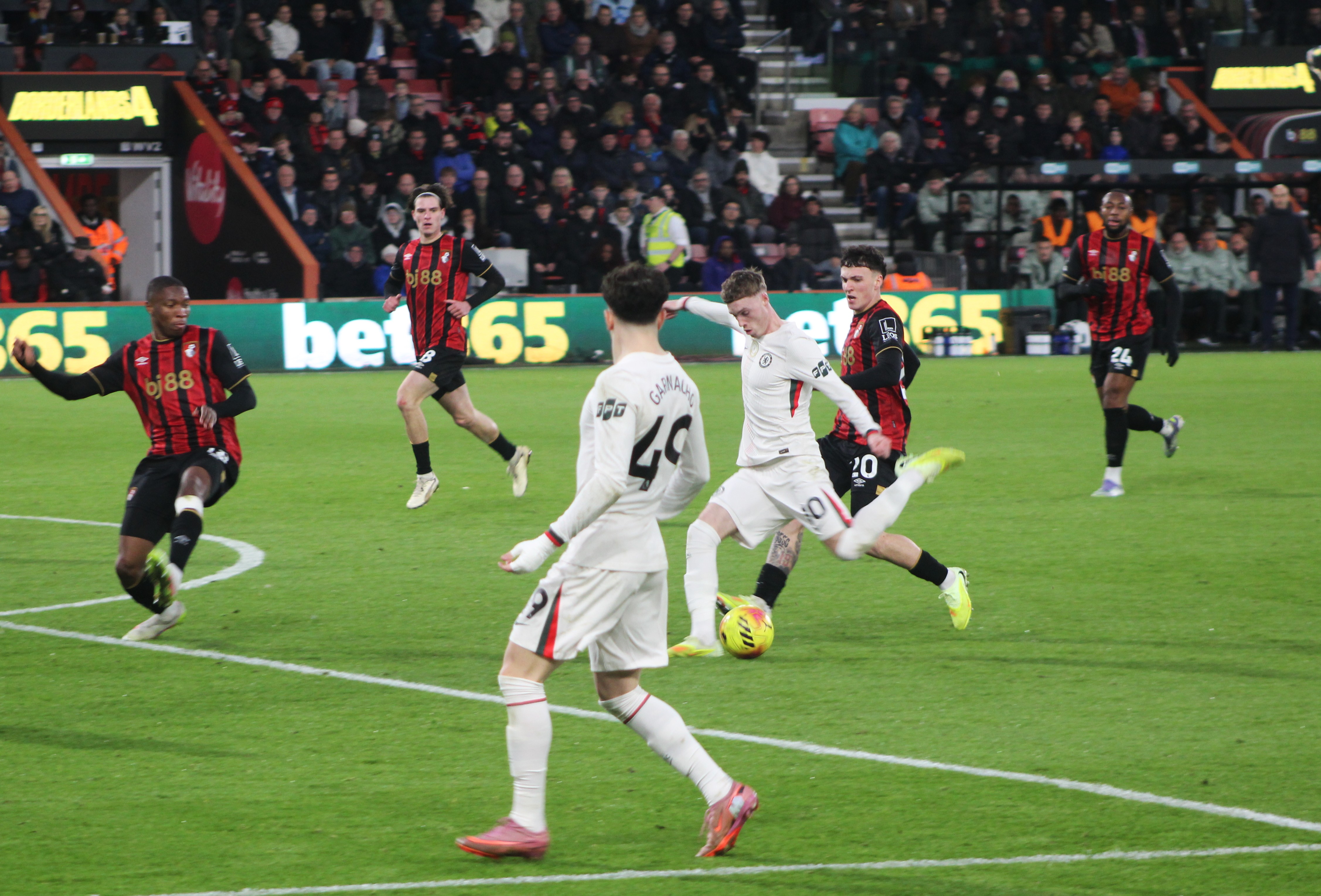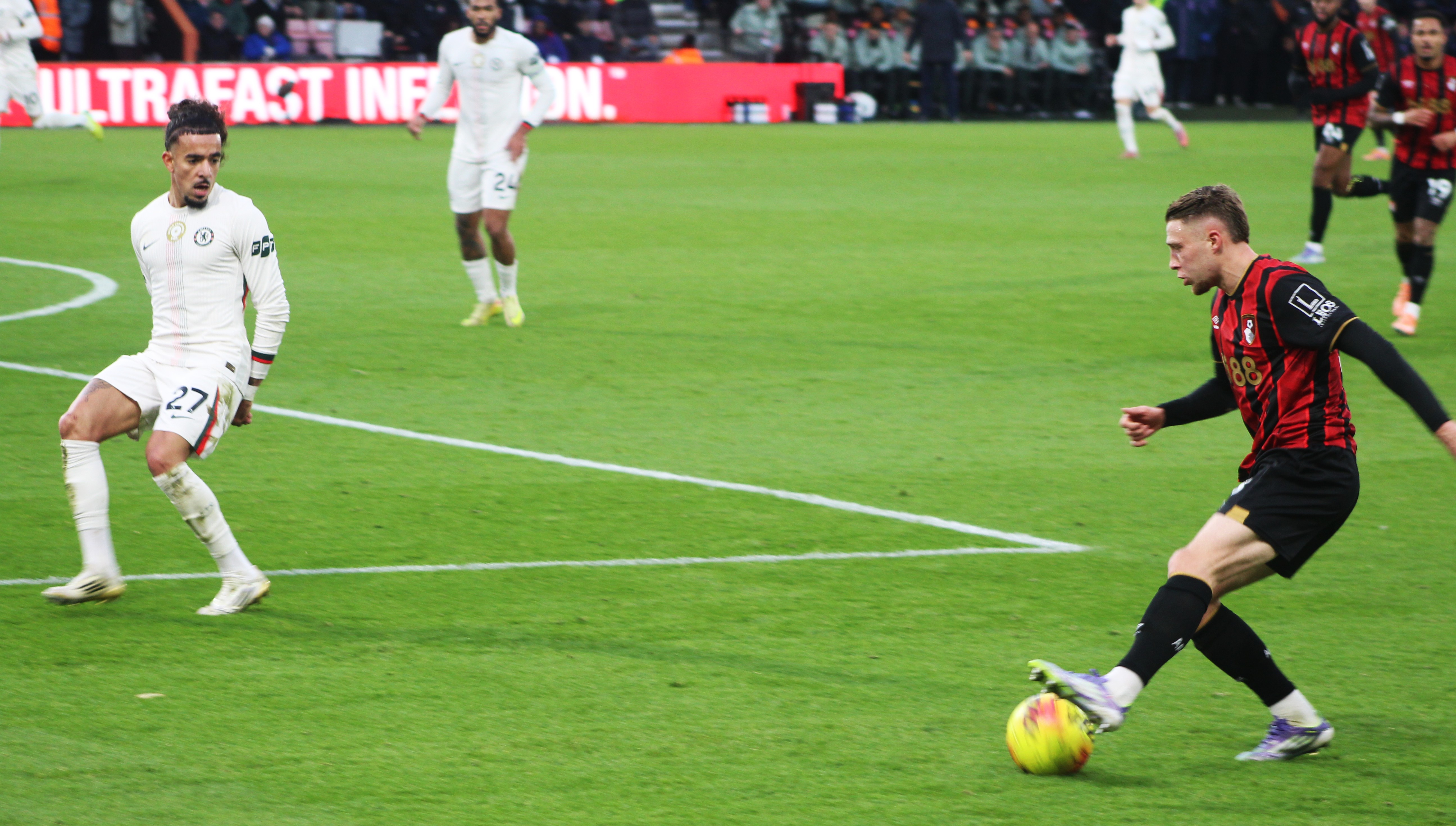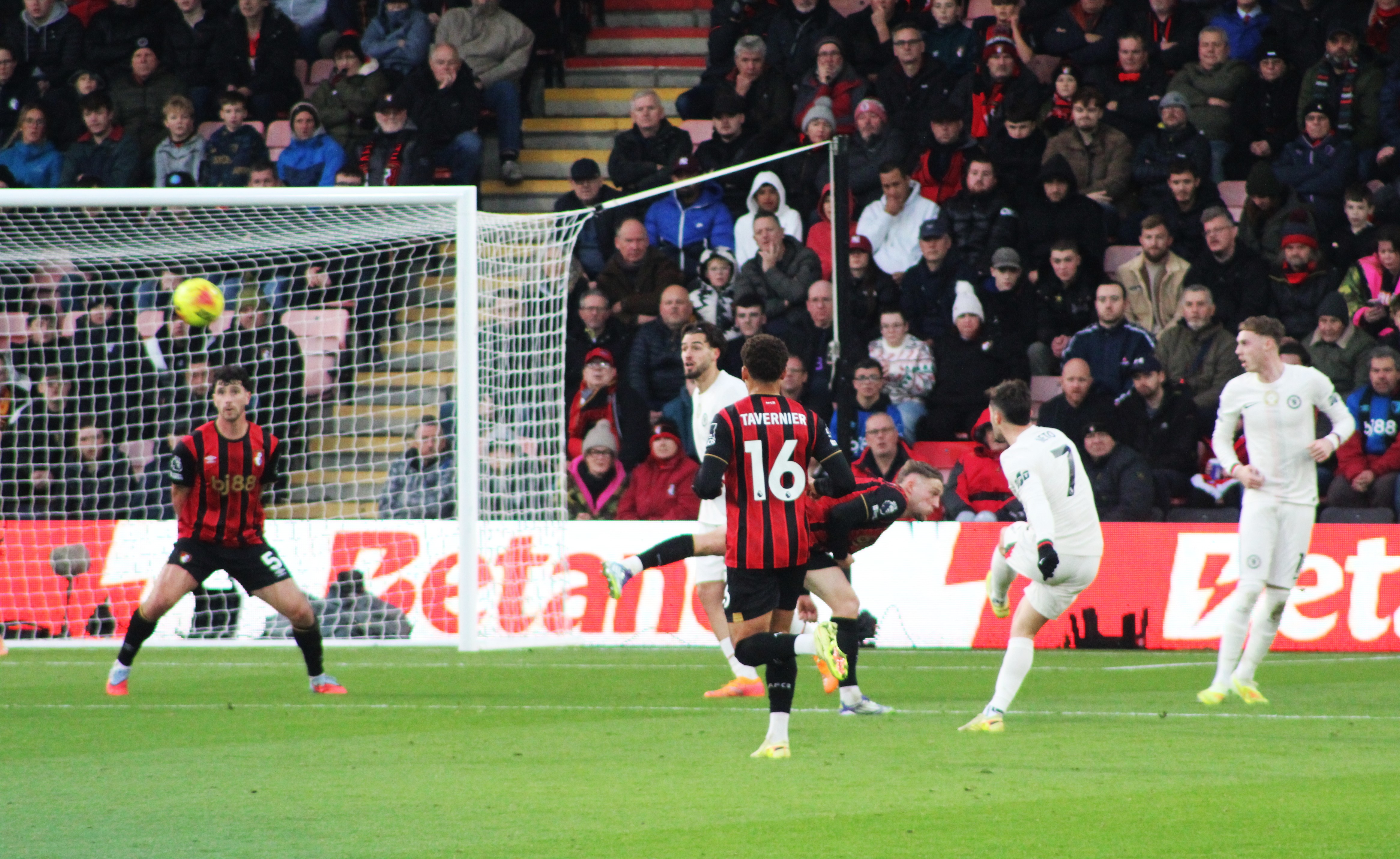 Fraser on the Bournemouth left immediately made an impression and looked the liveliest of the away team. But we were soon on the attack, and a sublime ball from deep from Jorginho found the advanced run of Mount. From an angle, it was always going to be a tough ask, and his shot drew a save from Ramsdale in the Bournemouth goal.