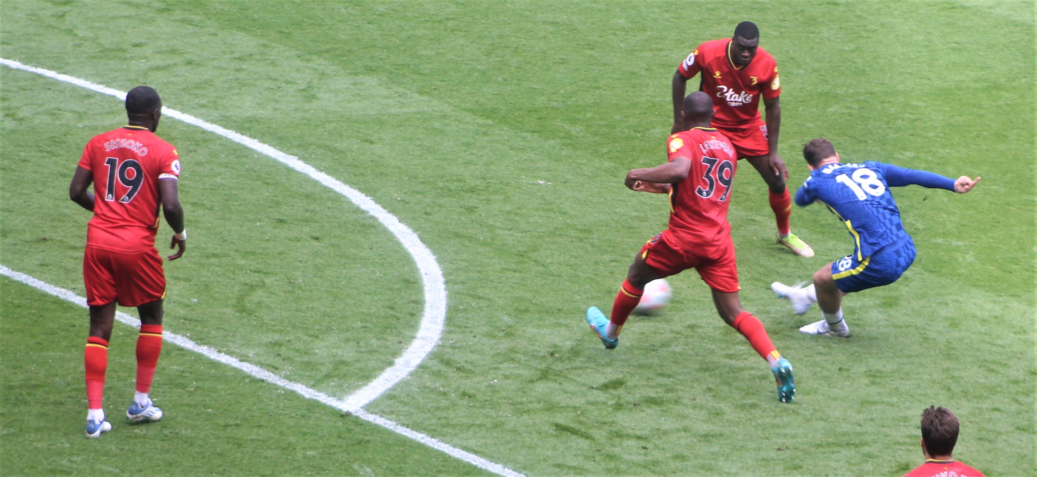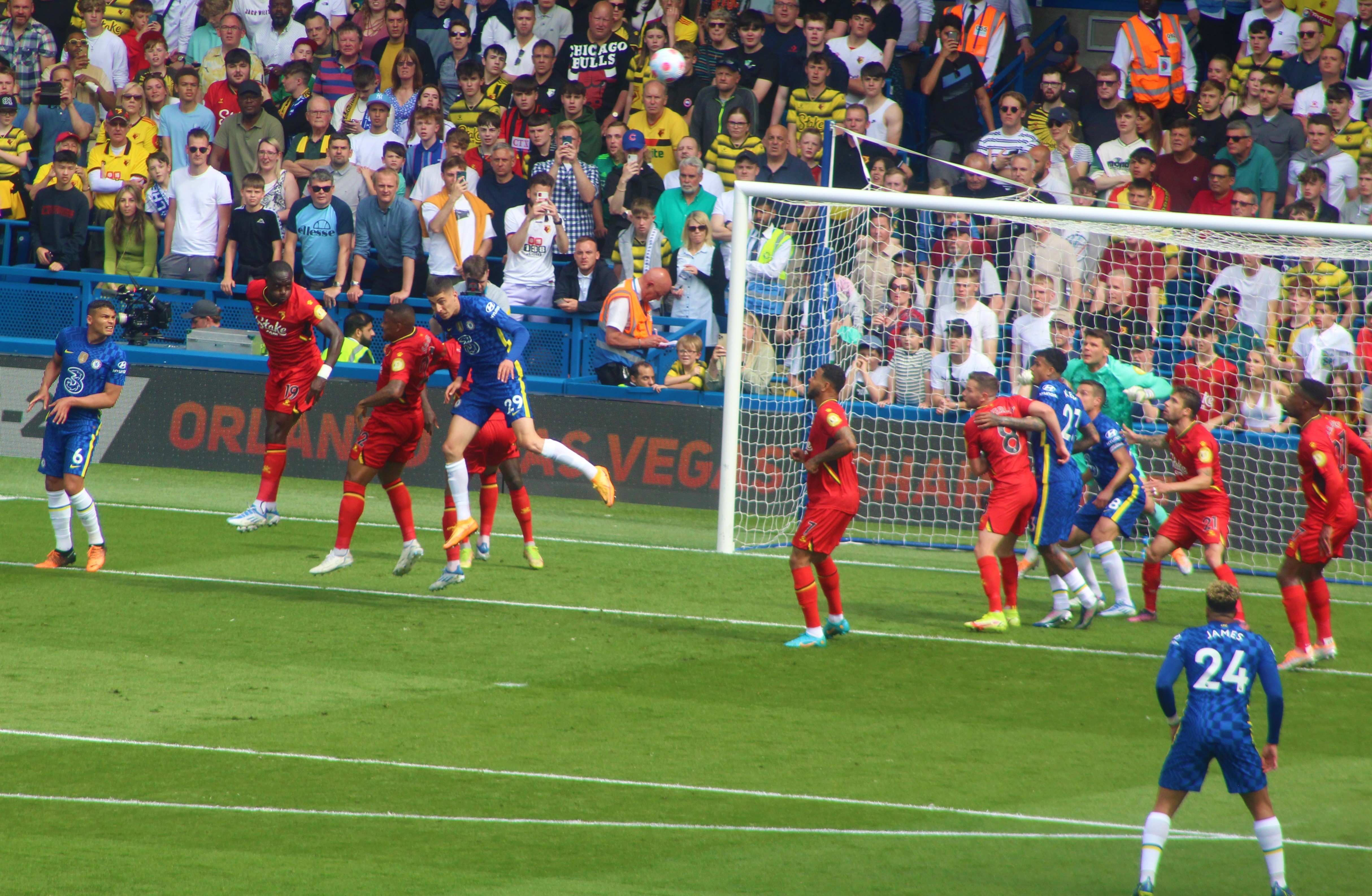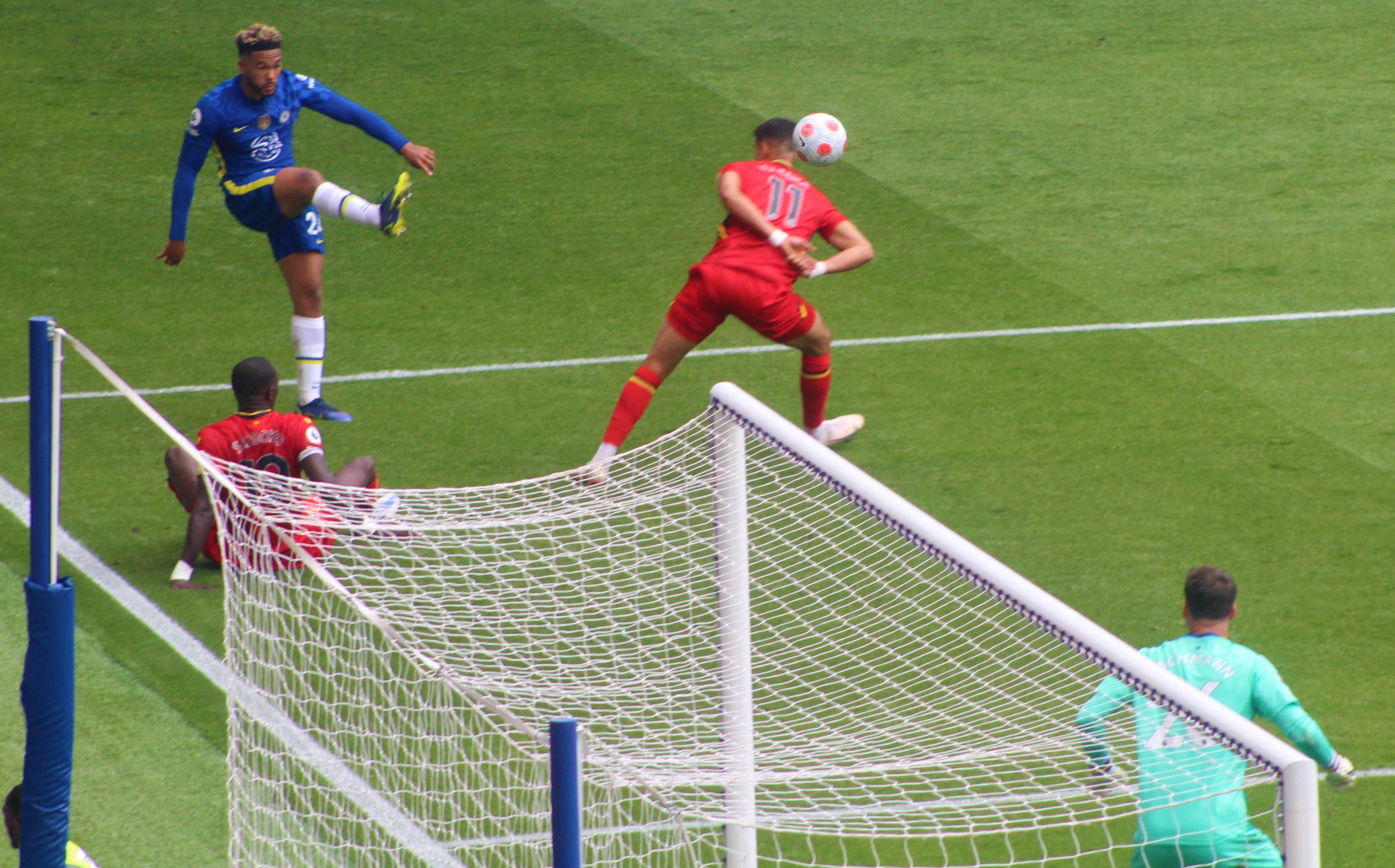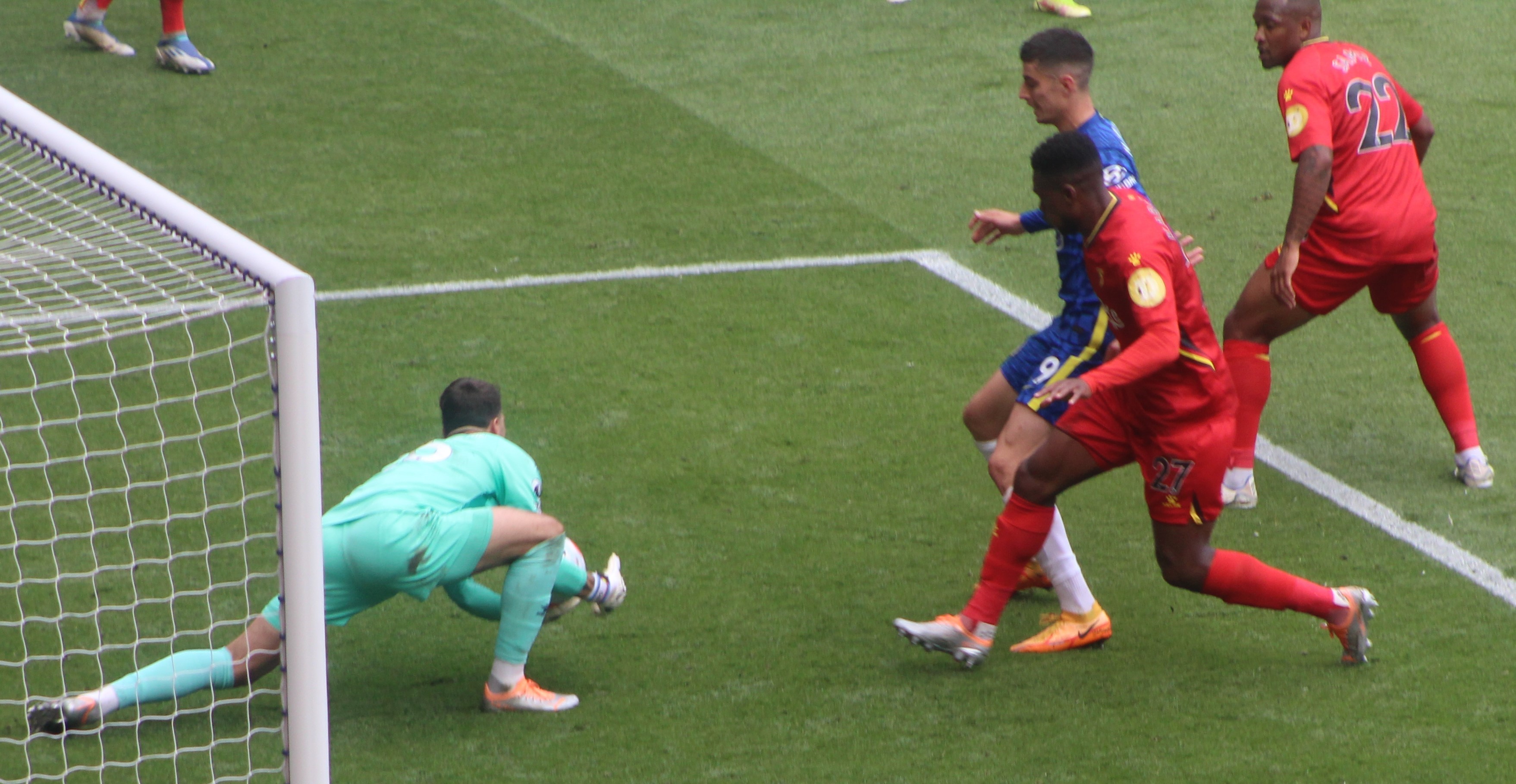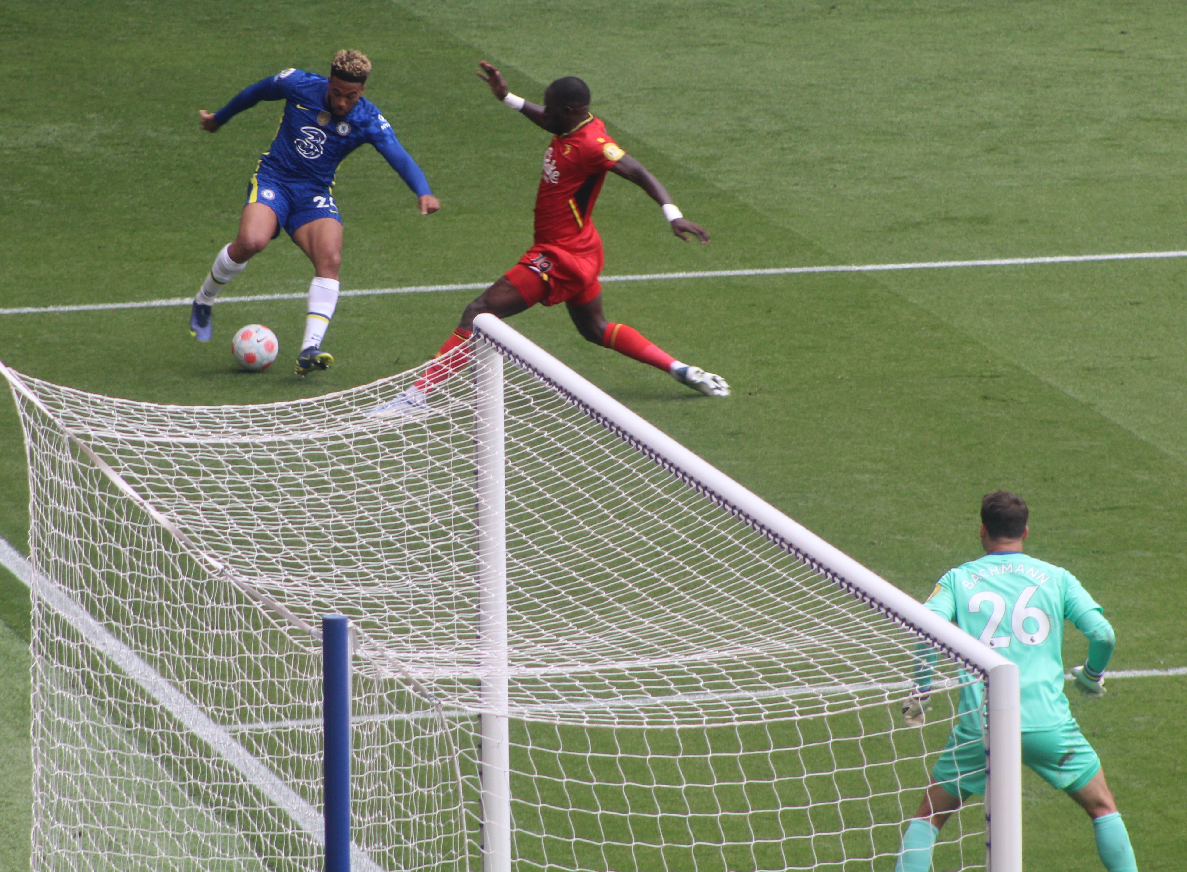 Kante was strangely finding himself engaged as a supplier of crosses and one such ball was met by Chilwell but his strong downward header, coming straight towards me, was palmed on to his post by a diving Schemichel.