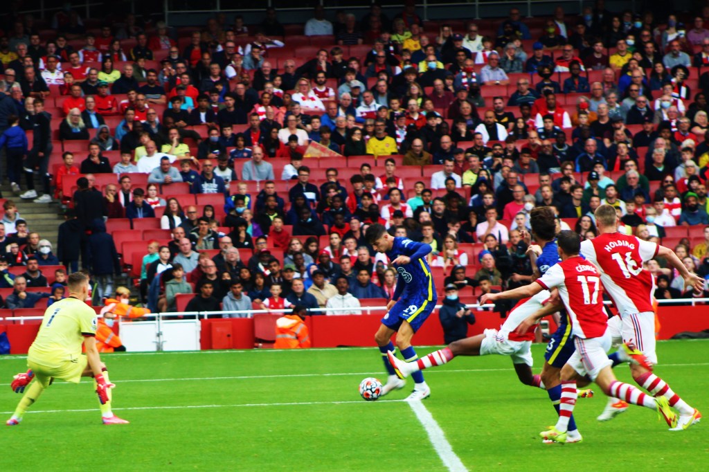 Soon into the second period, Kai Havertz broke away down in front of us and kept running. He drew the ‘keeper and chipped the ball over him from inside the six-yard box. It clipped the post.