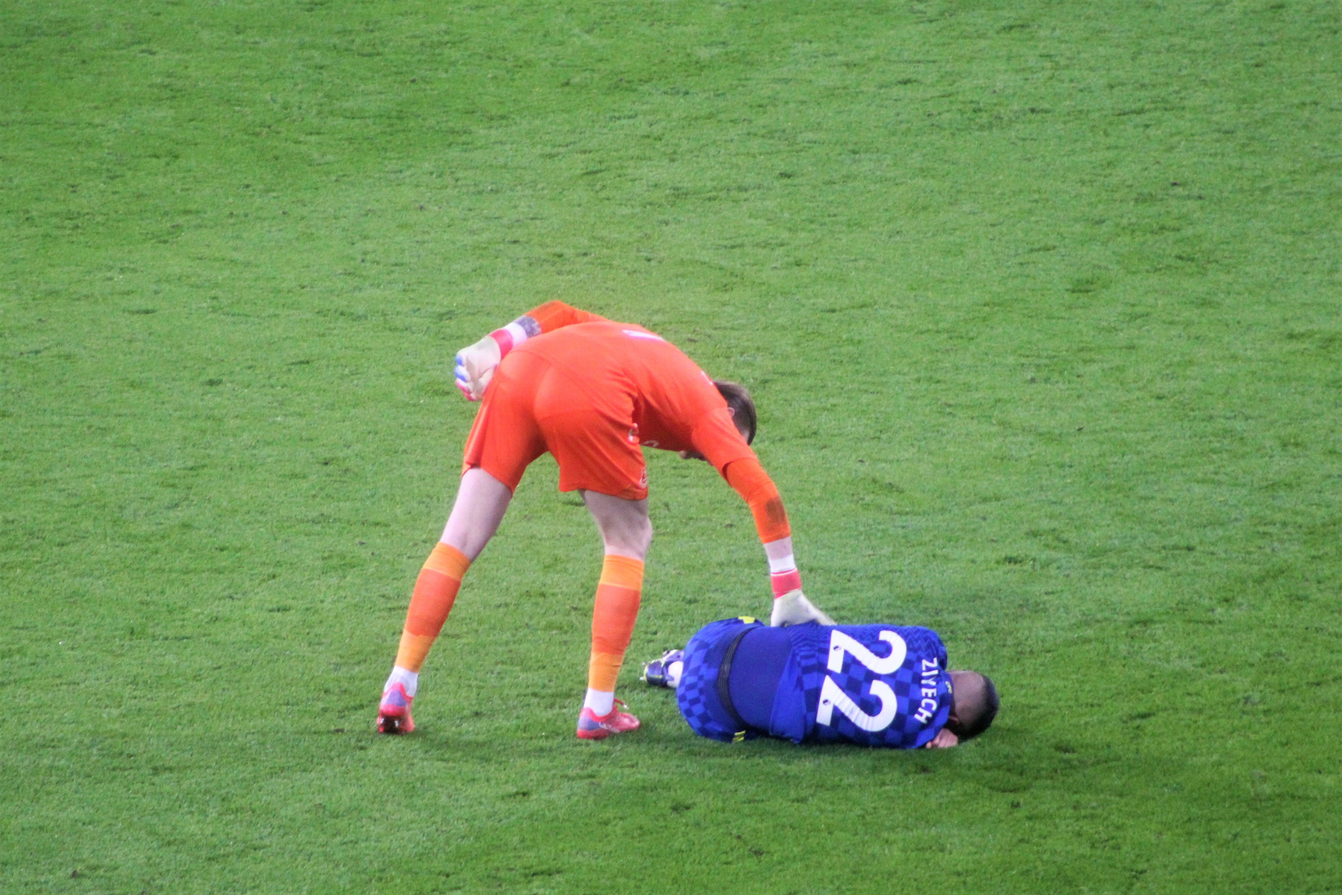 Kante was strangely finding himself engaged as a supplier of crosses and one such ball was met by Chilwell but his strong downward header, coming straight towards me, was palmed on to his post by a diving Schemichel.