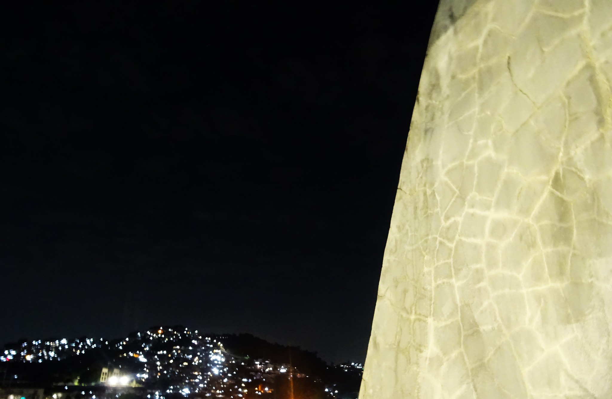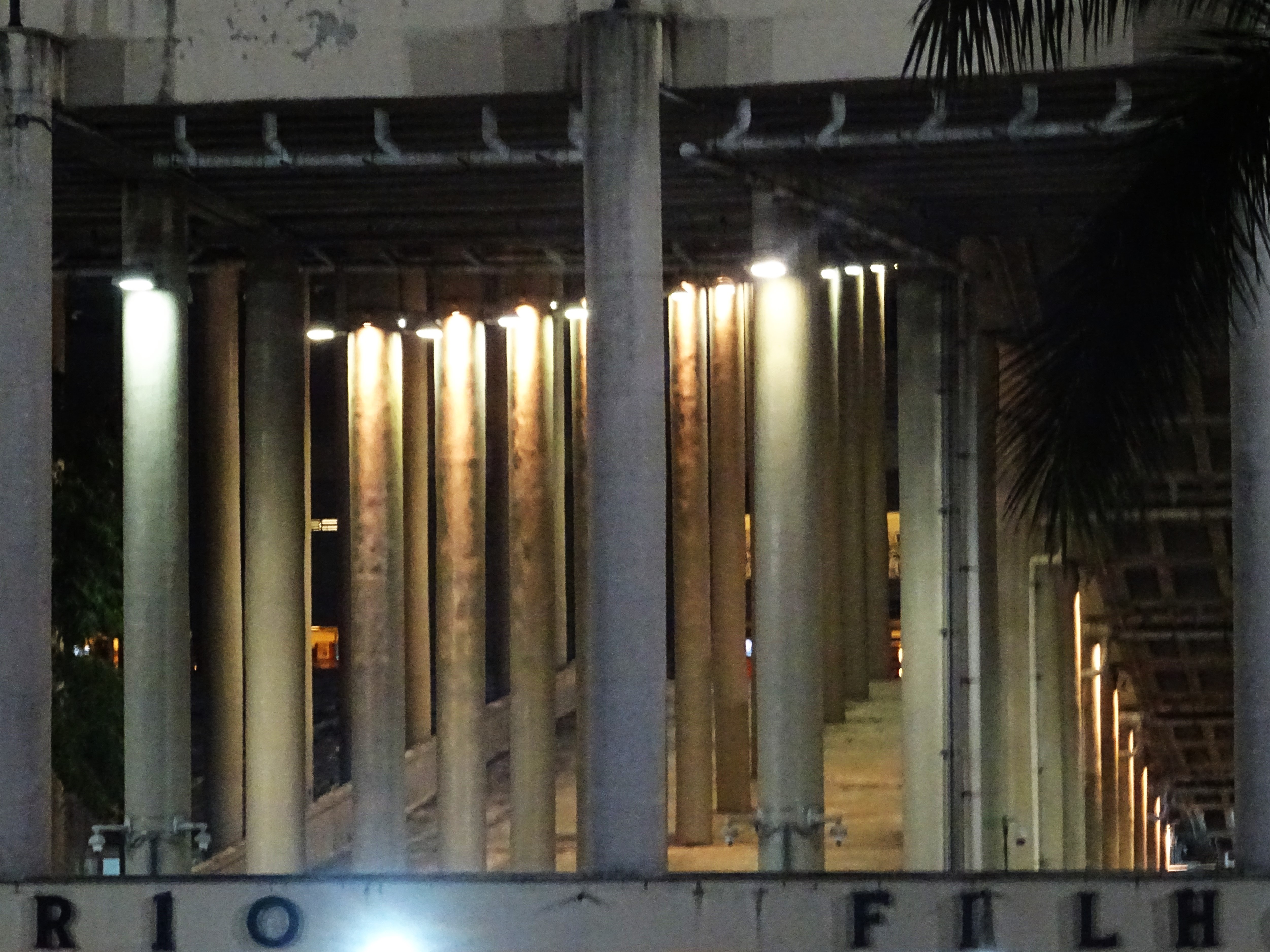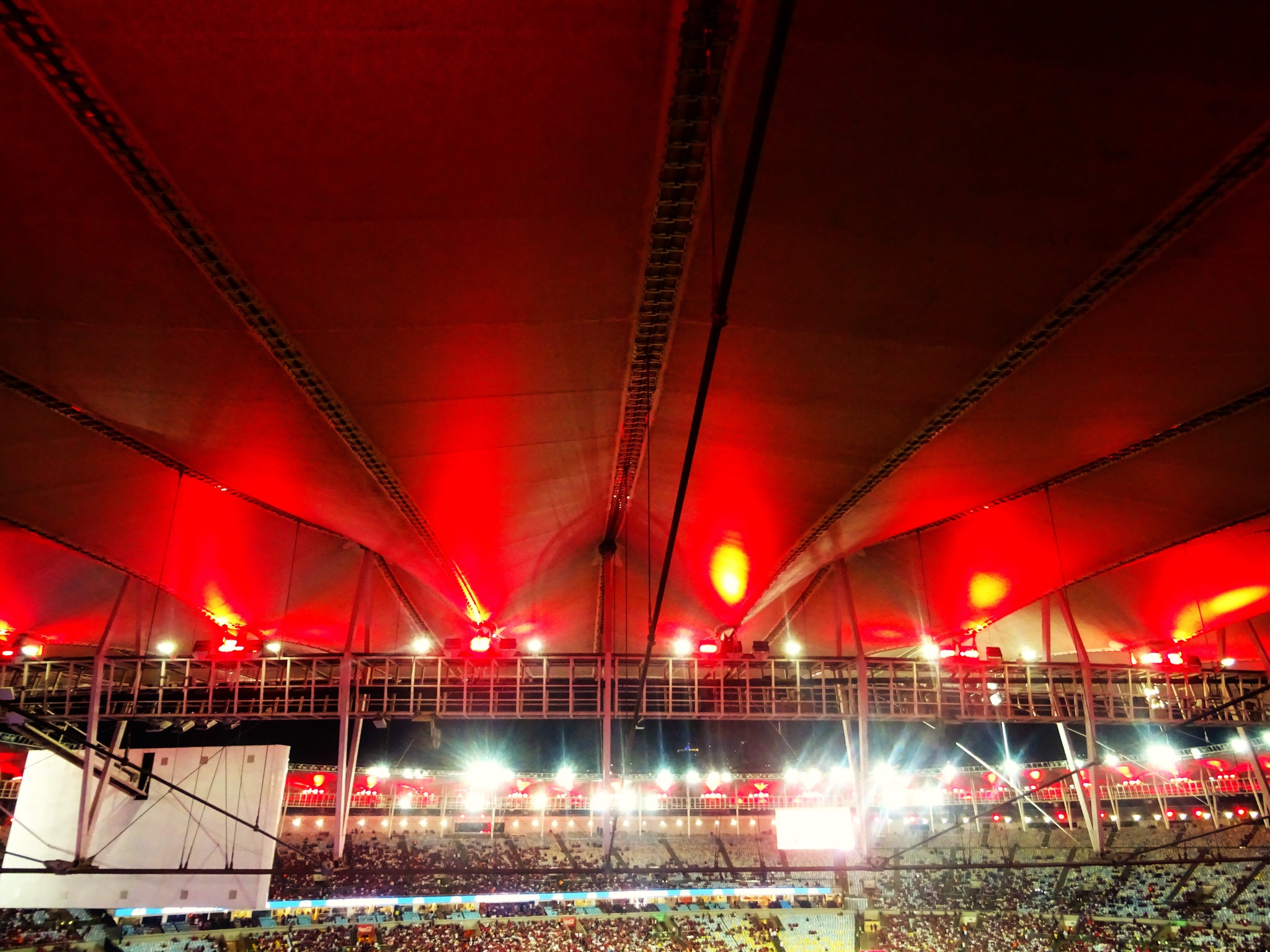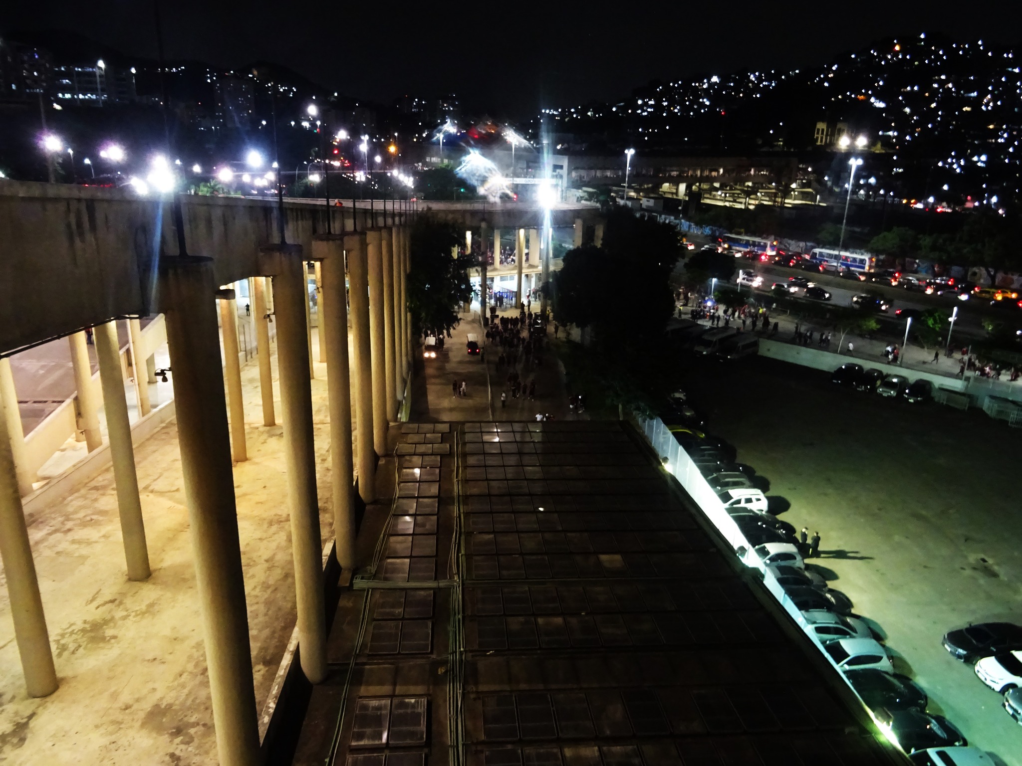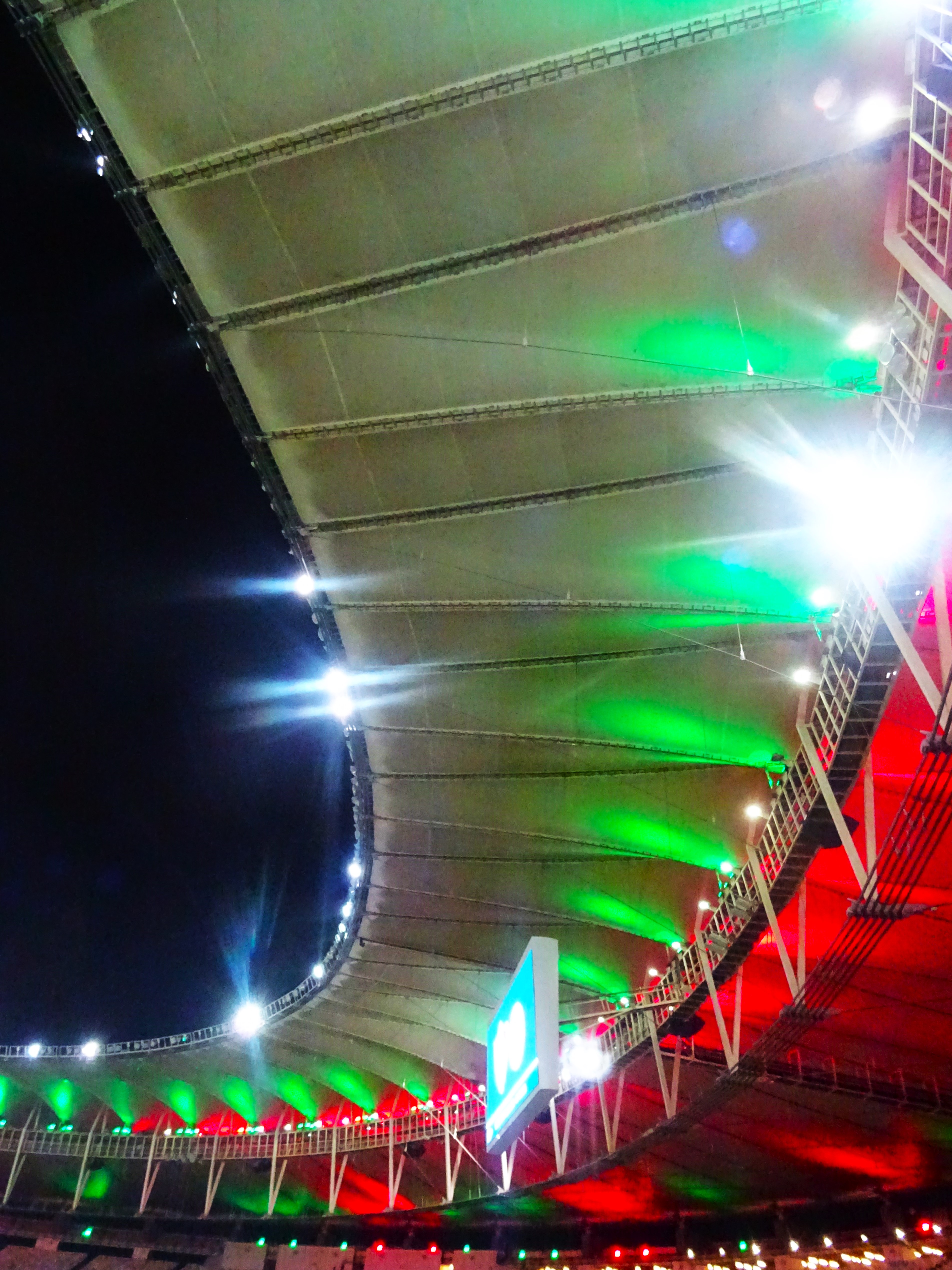 At half-time, I trotted out to the balcony that overlooked the city. I took a photo of a section of the Maracana roof support, pocked and cracked through time, and contrasted it with the lights shining on a nearby hill. Rio is surrounded by huge rising pillars of black rock. And here I was inside the city’s mammoth concrete cathedral.