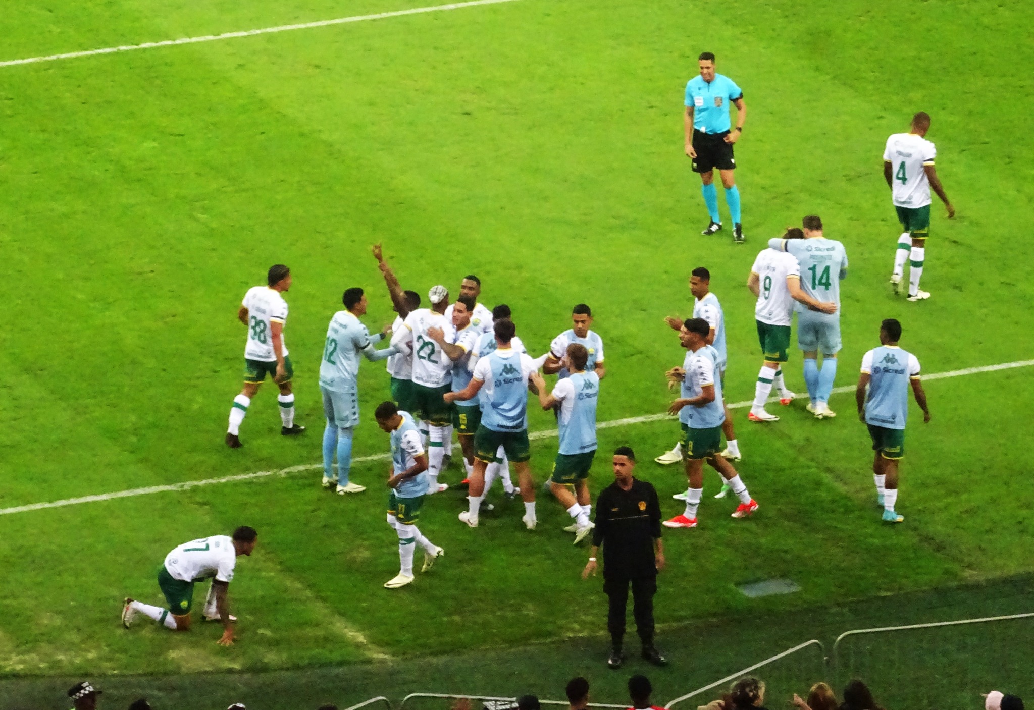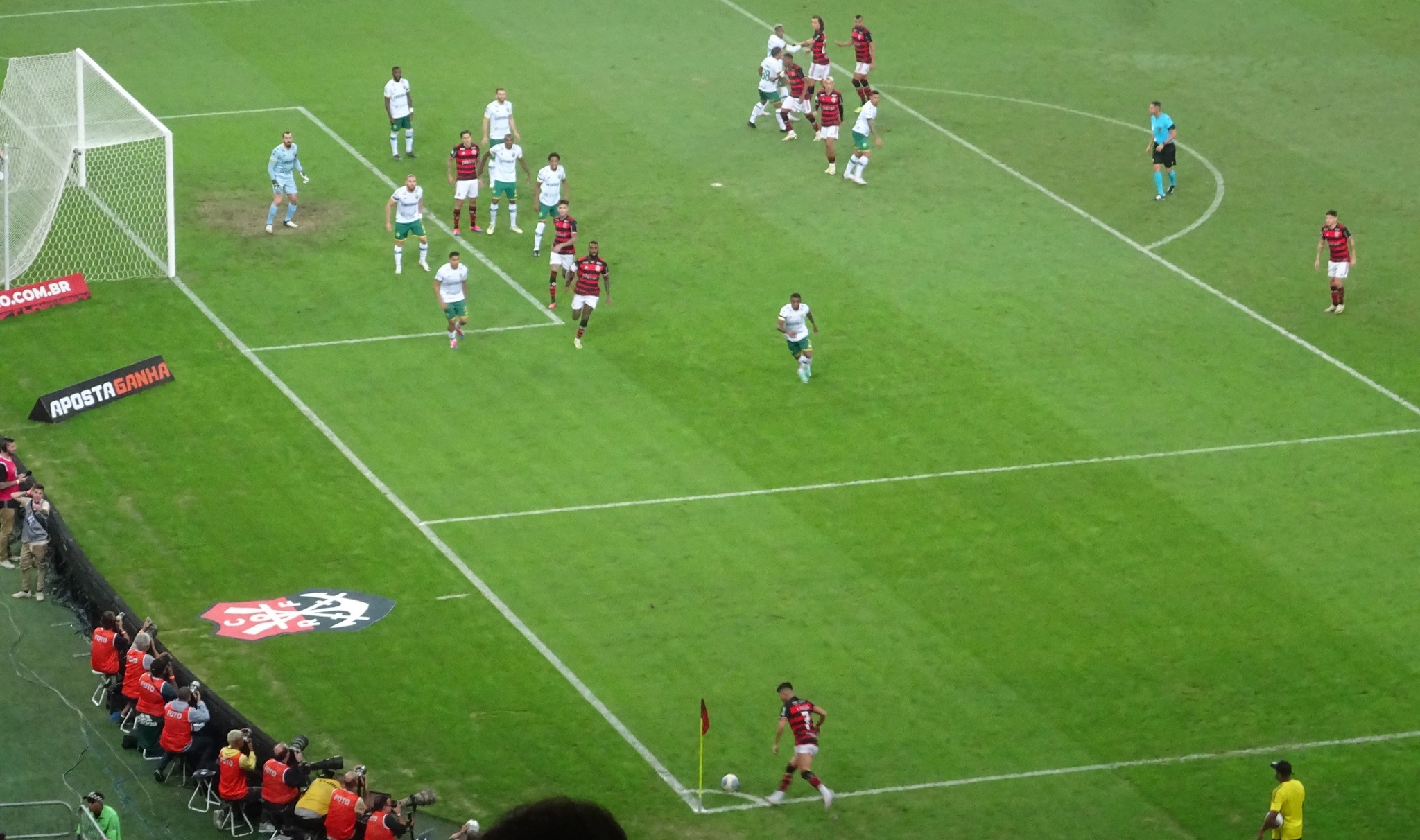 The Flamengo players raced away to the same corner, again their keeper Rossi, all in yellow, raced up field with arms outstretched and it made me squirm.