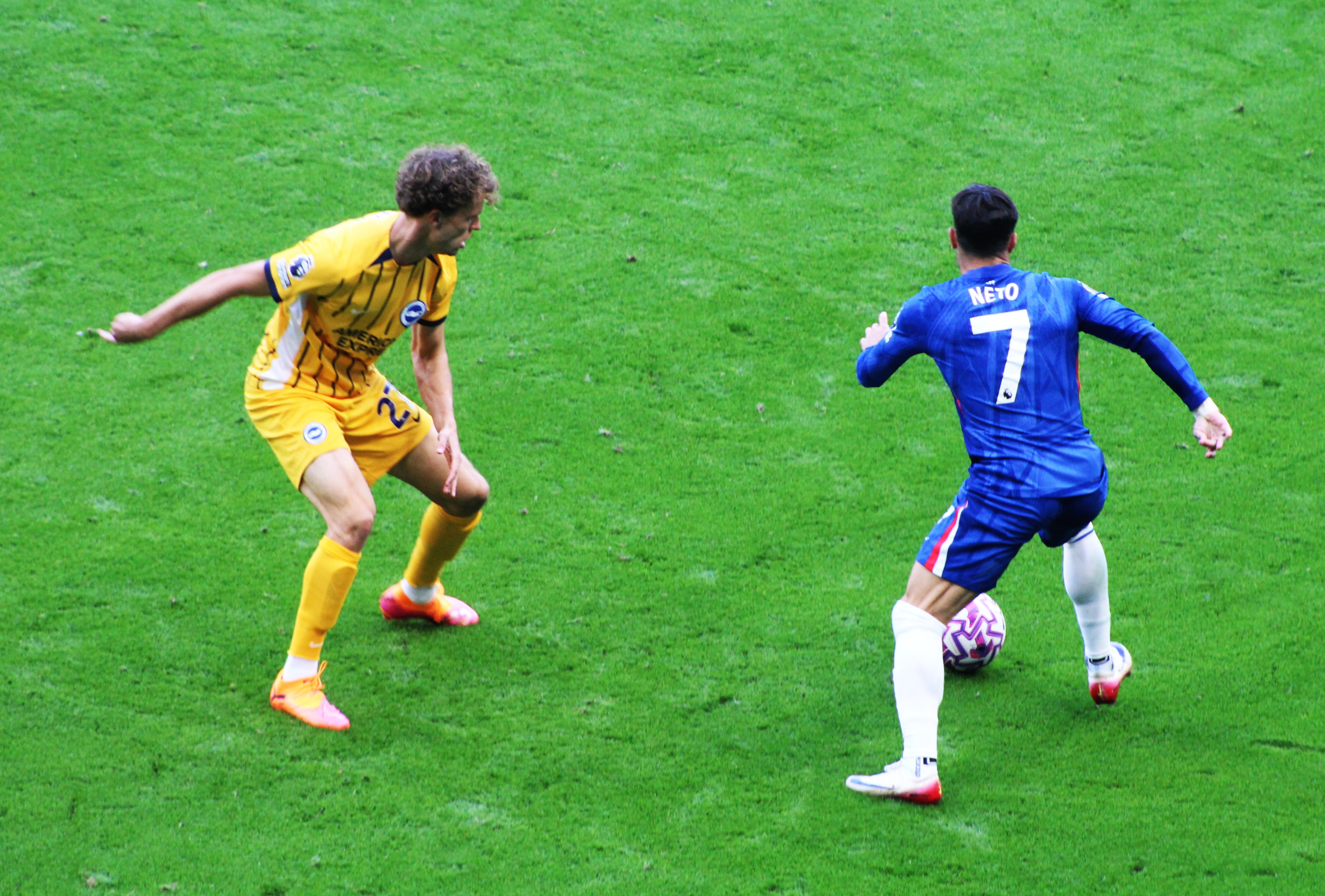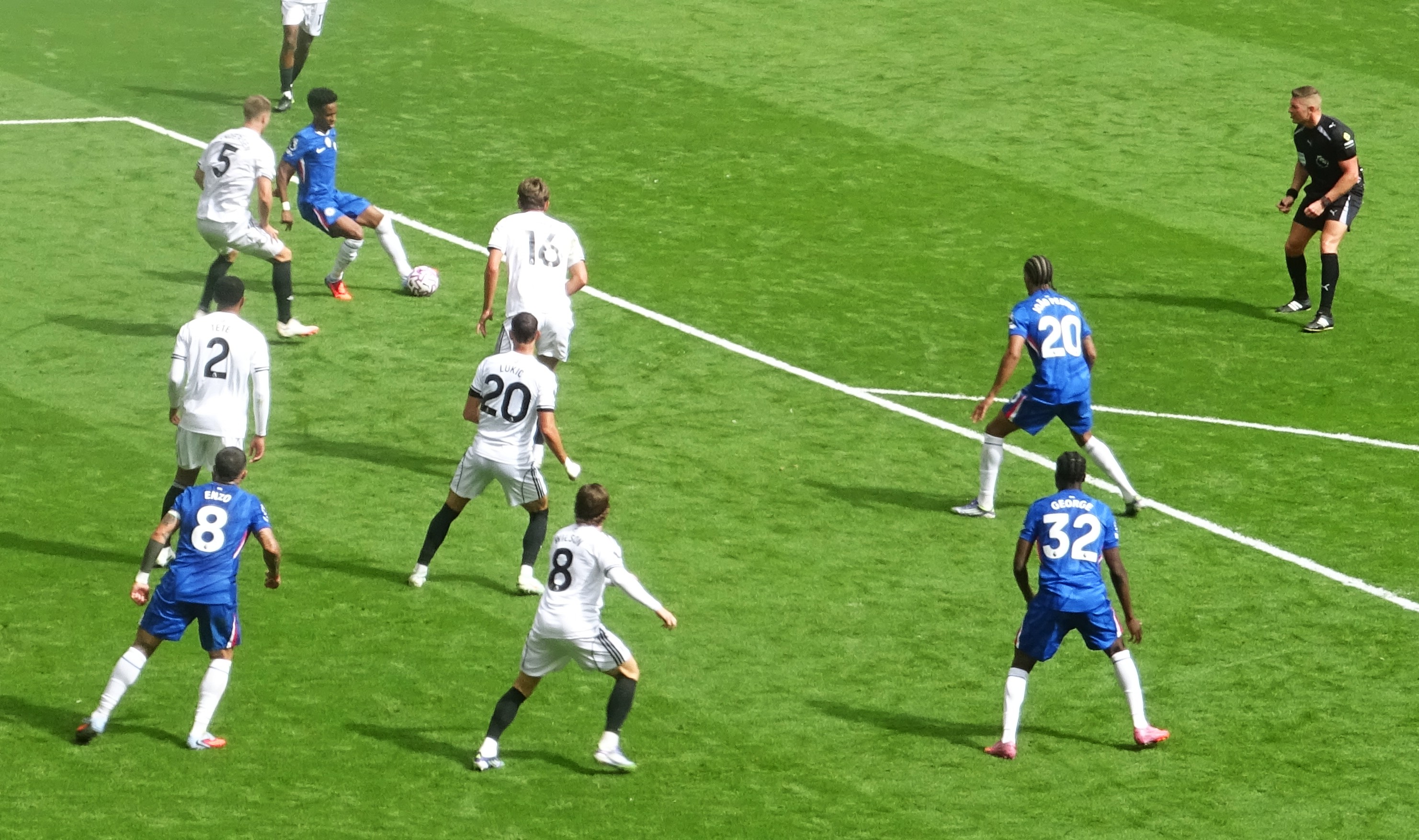 Then, on thirty-eight minutes, the best move of the match. A break from the always effervescent Marc Cucuralla on the left who pushed the ball on to Jamie Gittens. From out wide, a deep cross towards the far post and a Chelsea player rose to head it back across the goal and into the net. We saw Pedro Neto reel away to celebrate.