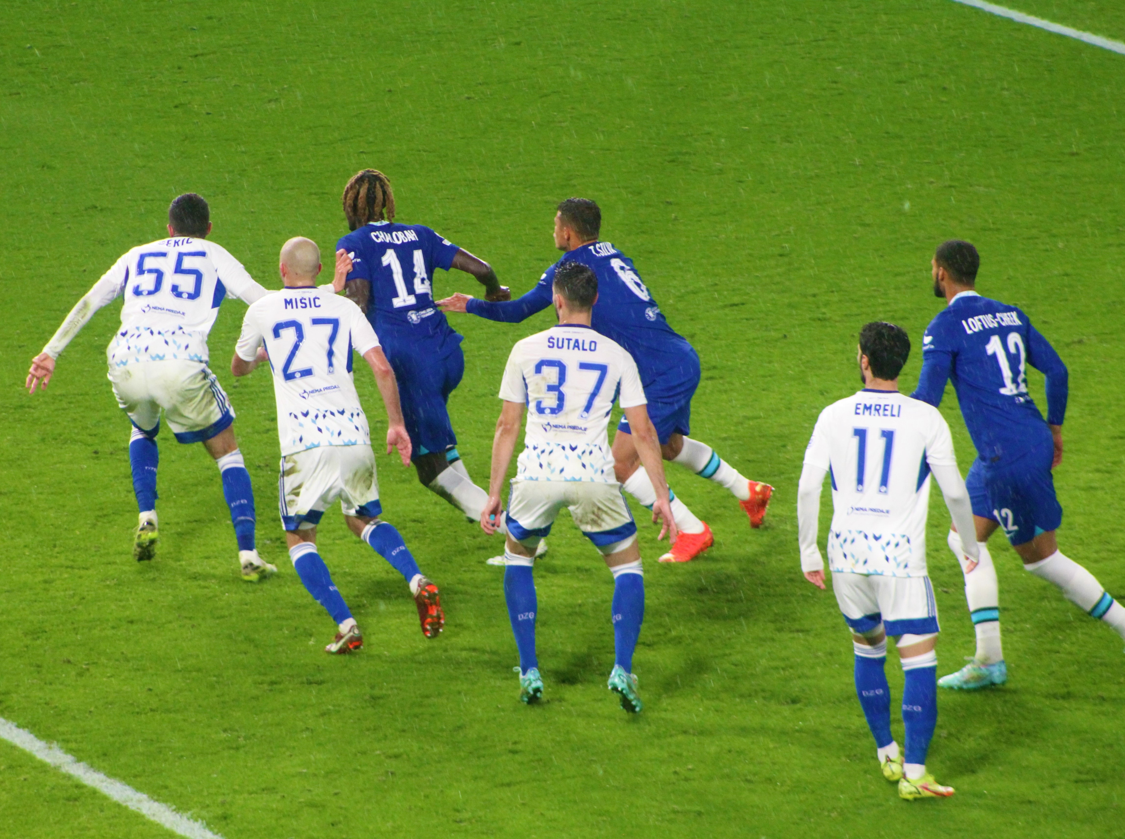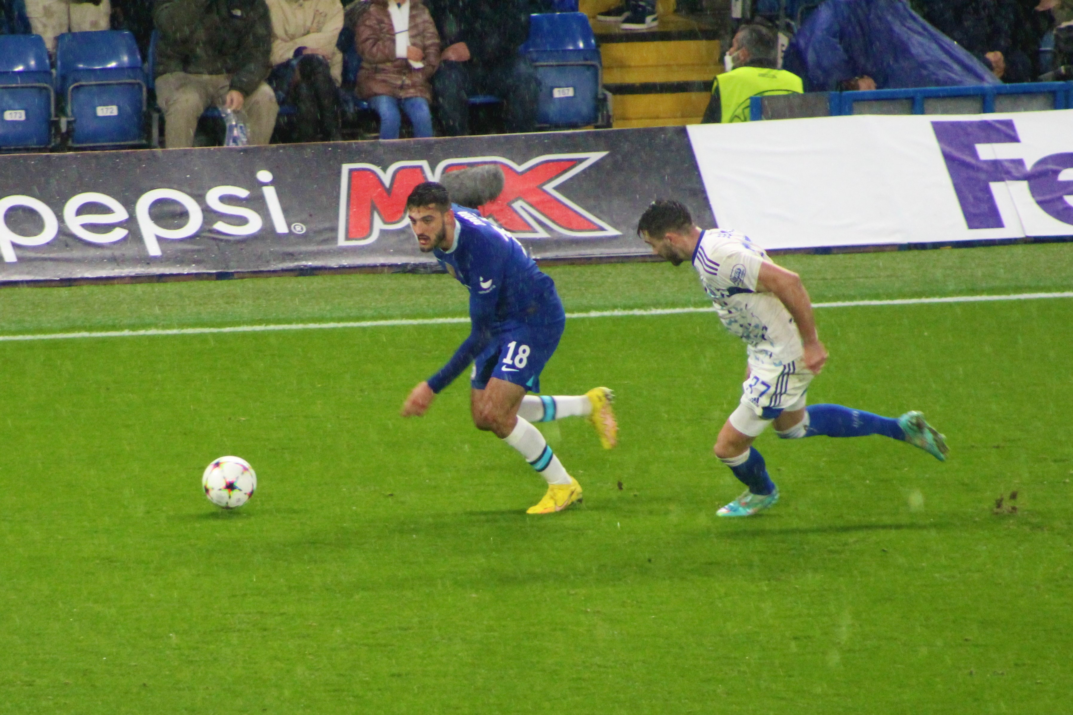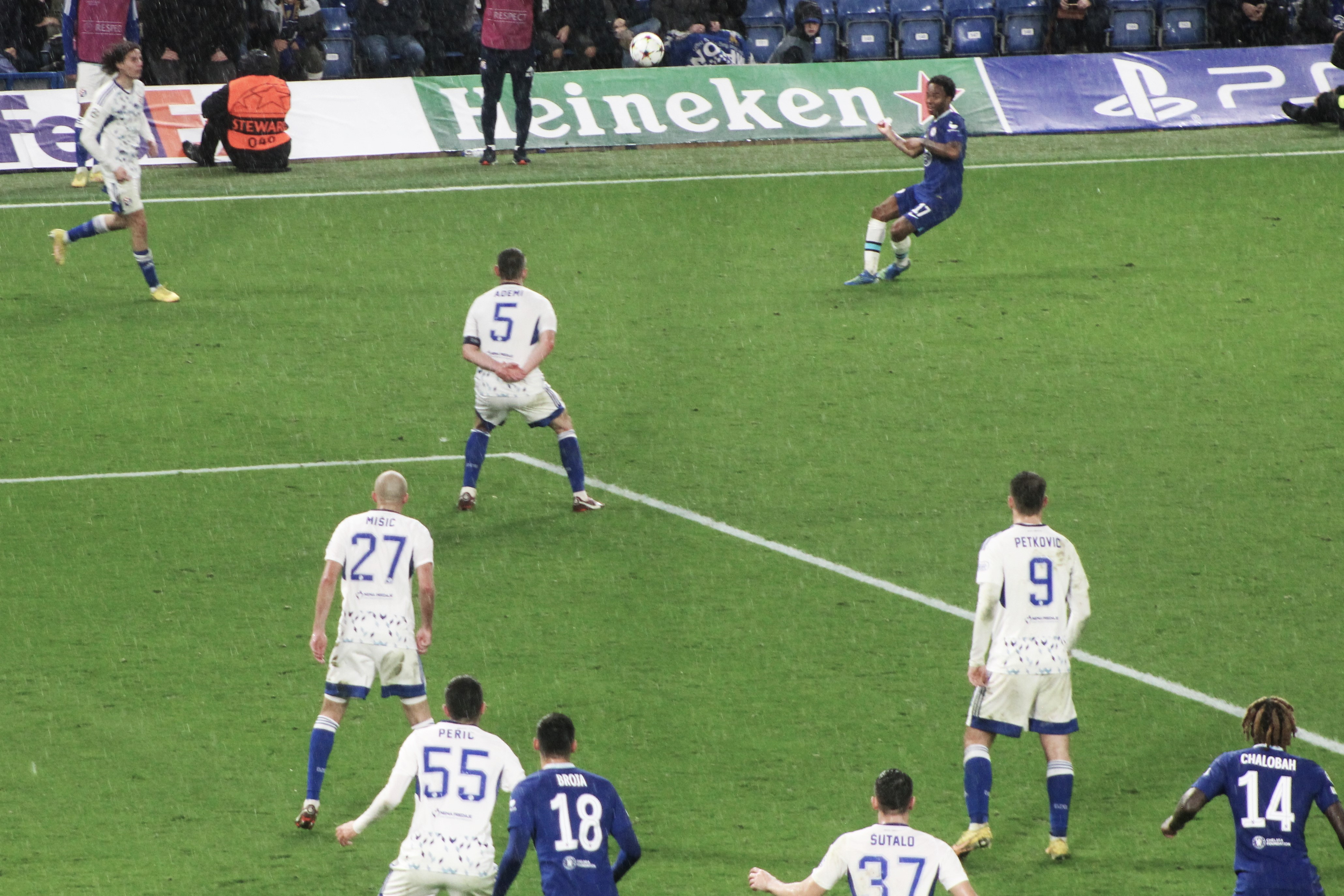The game began and we edged the opening spell quite easily with Mason Mount busy and involved. A couple of very early attacks down the right amounted to nothing. The rain was just about staying off.