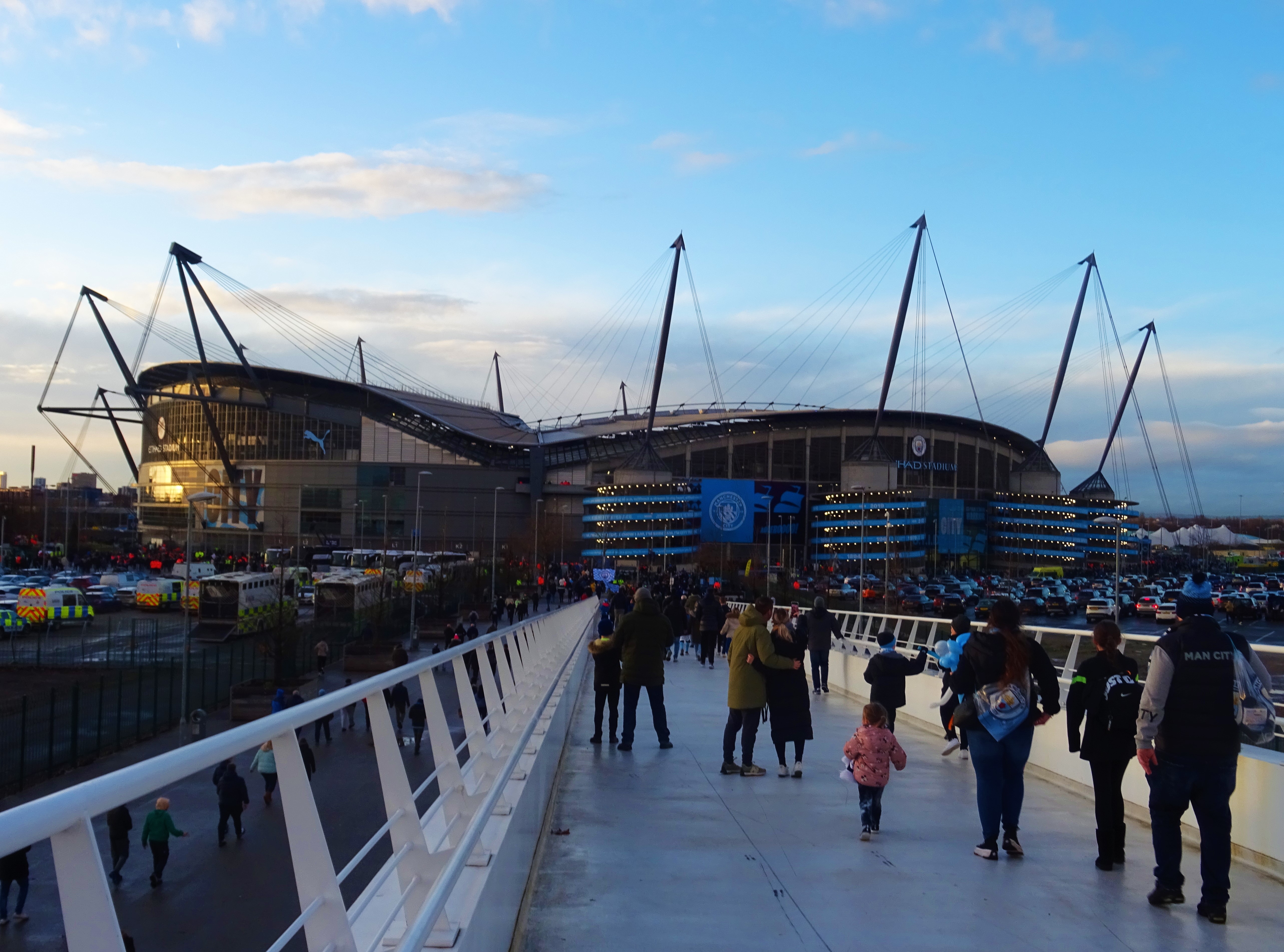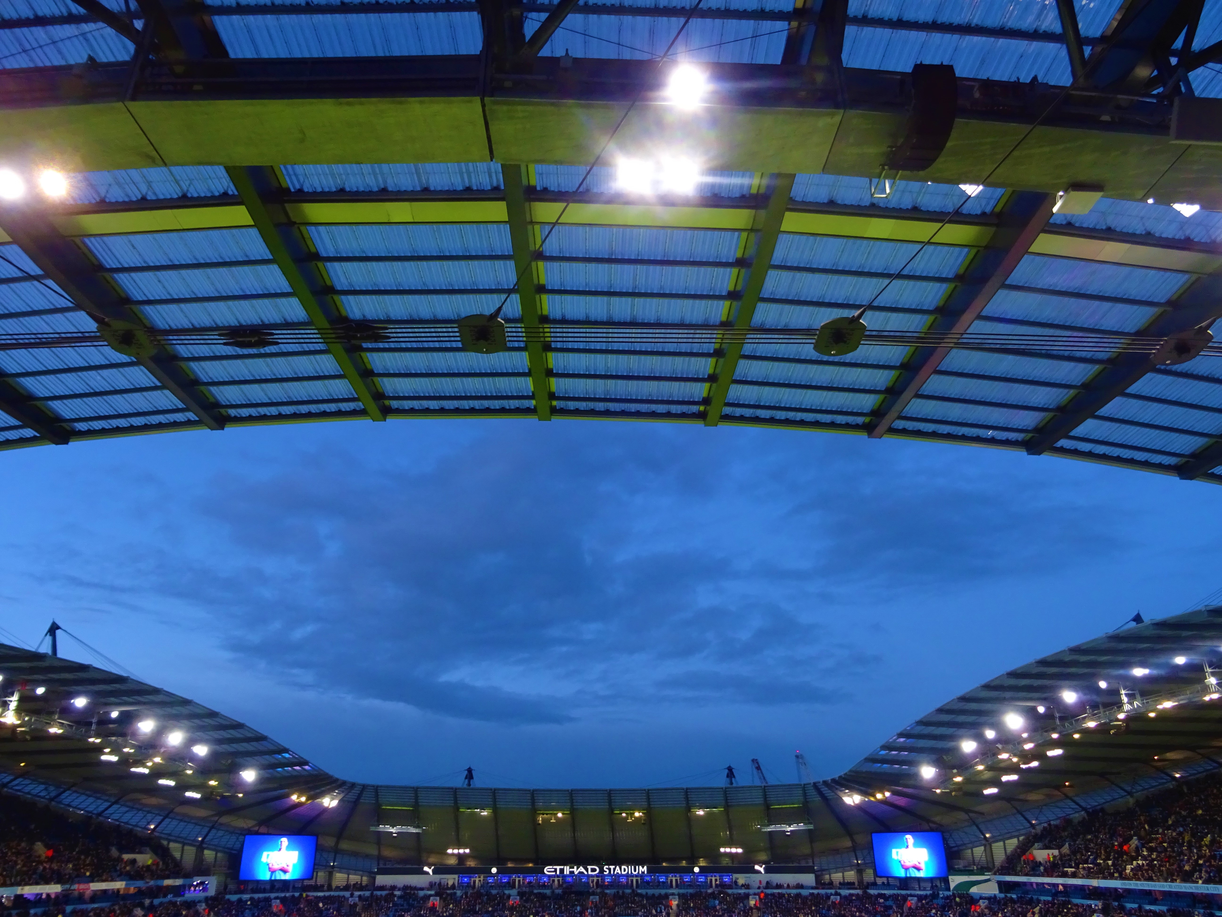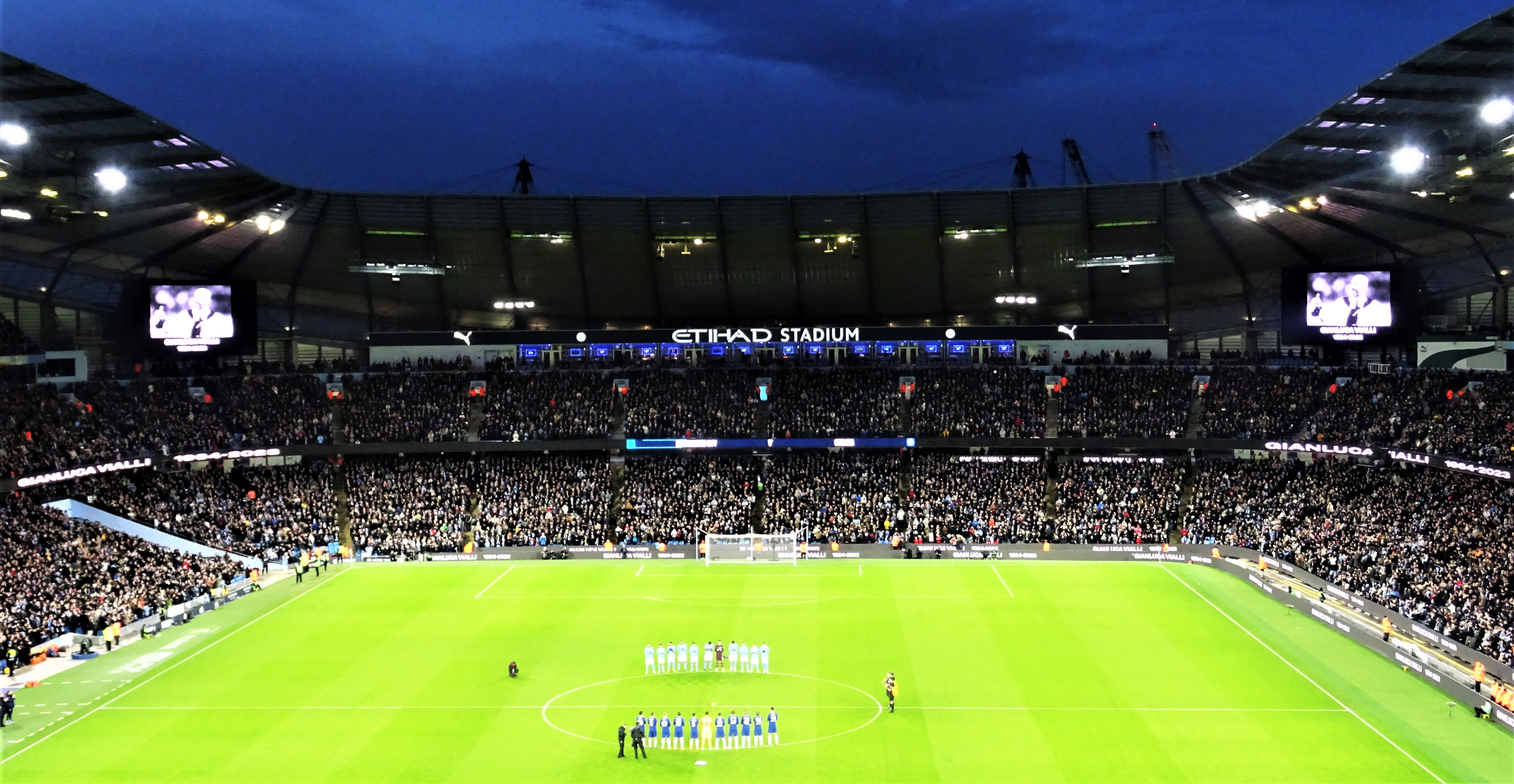 I wondered if City were stickering up that end in preparation for the United fans who would be occupying the same seats on the Sunday. There were inflatable bananas, how 1989, bouncing around in City’s lower tier. There were empty seats in both ends but many more in the City end.