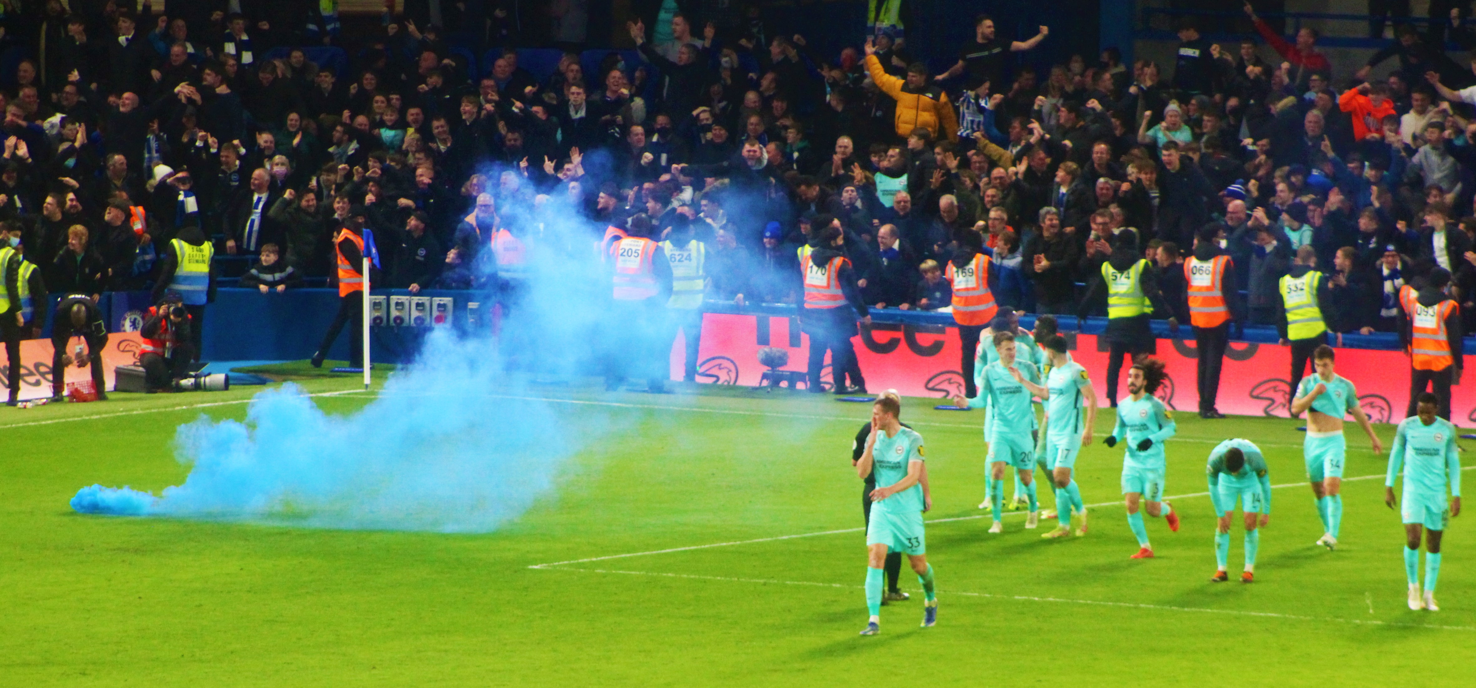 Liverpool came again, with a few efforts on our goal. We had Petrovic to thank once more. His had been a fine performance. There was a hugely impressive “Allez Allez Allez” from the red corner to my left. It was the loudest noise of the entire match. I looked over at the blue corner to my right. I heard nothing. I just saw a few blue flags being waved in the far corner. As far as responses go, it was almost fucking laughable.
