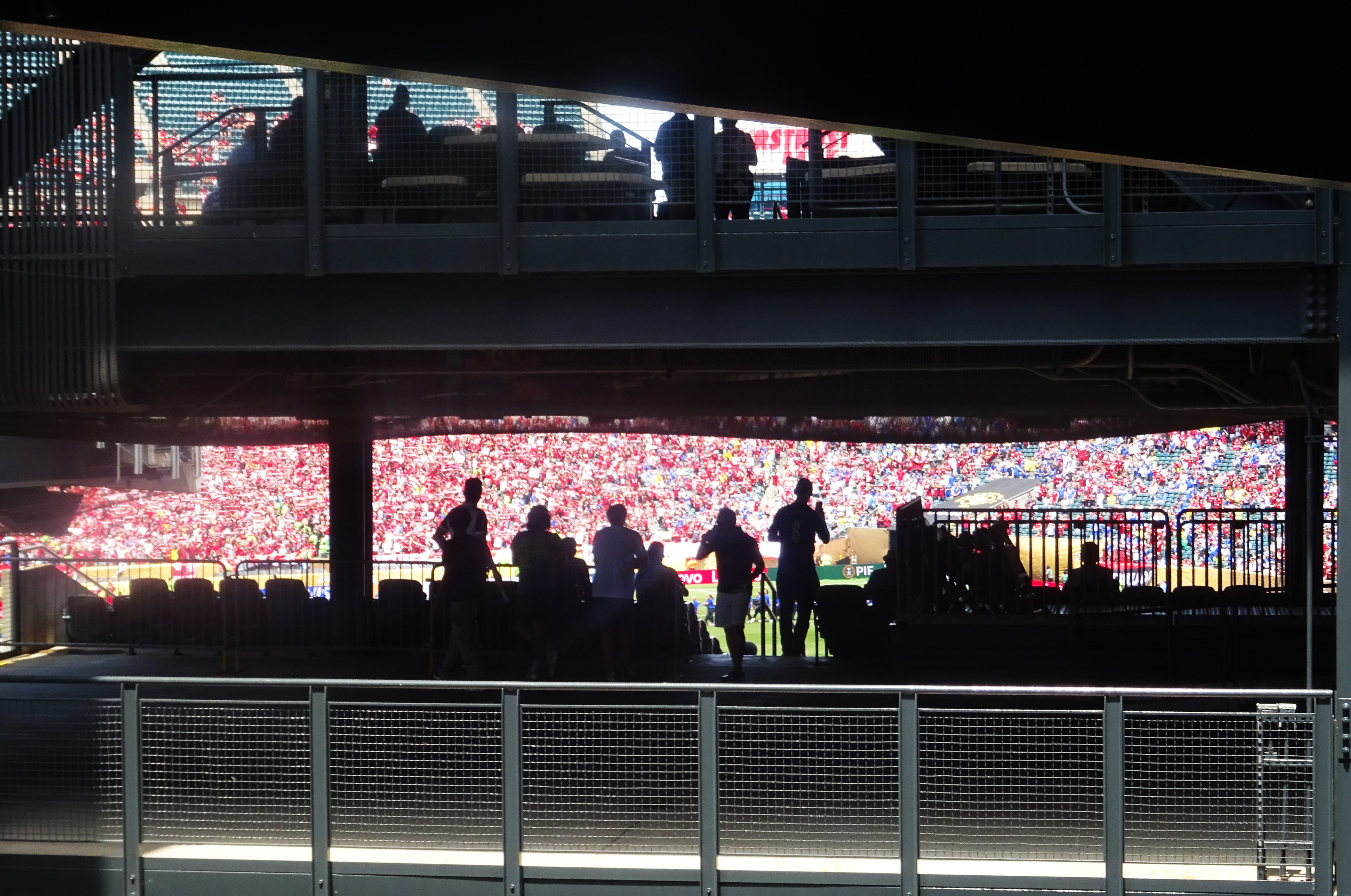 We caught a subway down to the stadium, the sun beating down as we exited, and headed for a quick drink at a huge and impersonal “super bar” that sits close to both the Phillies’ baseball stadium and the Eagles’ NFL stadium. The Flyers’ NHL and the 76ers’ NBA shared stadium is close-by too.