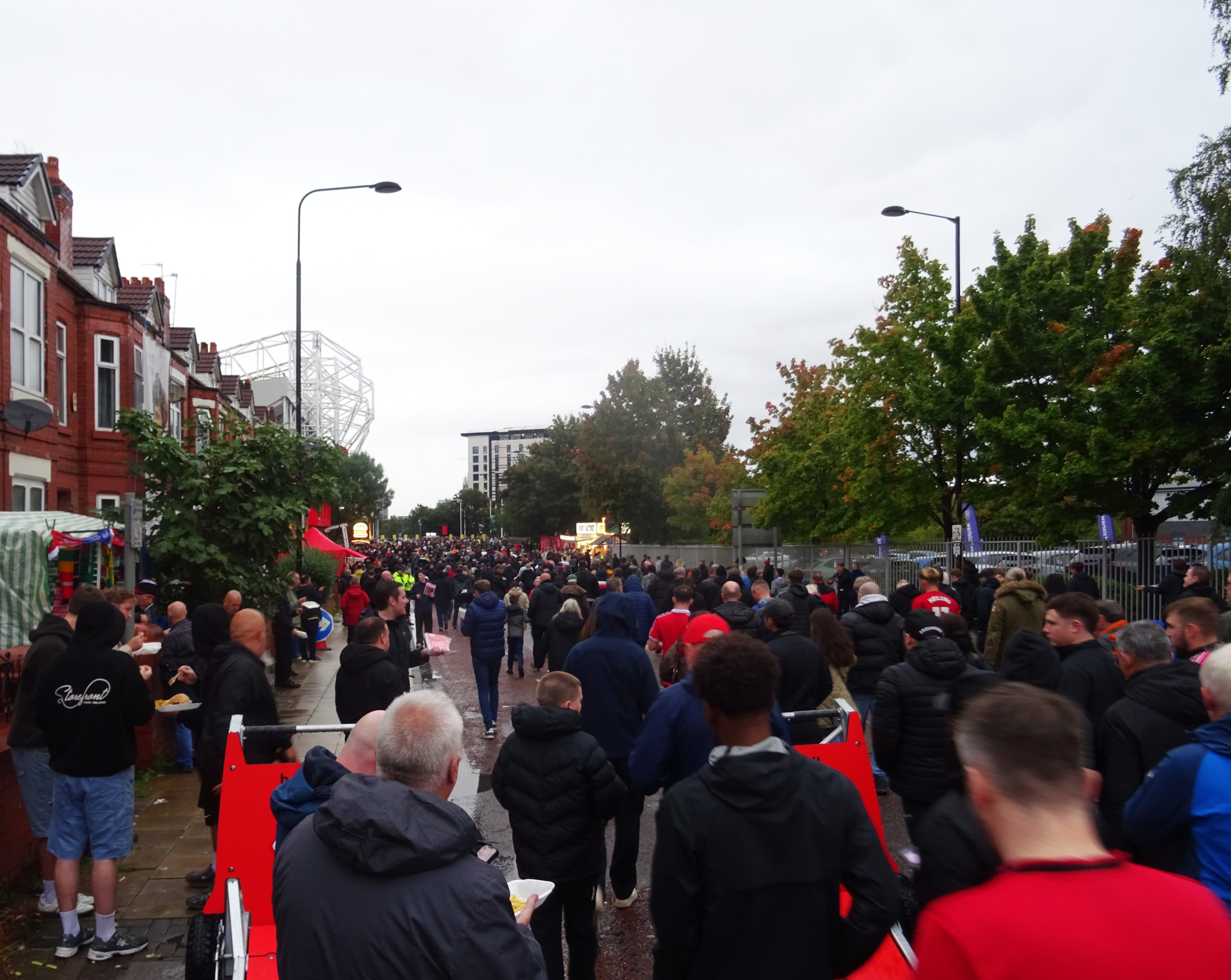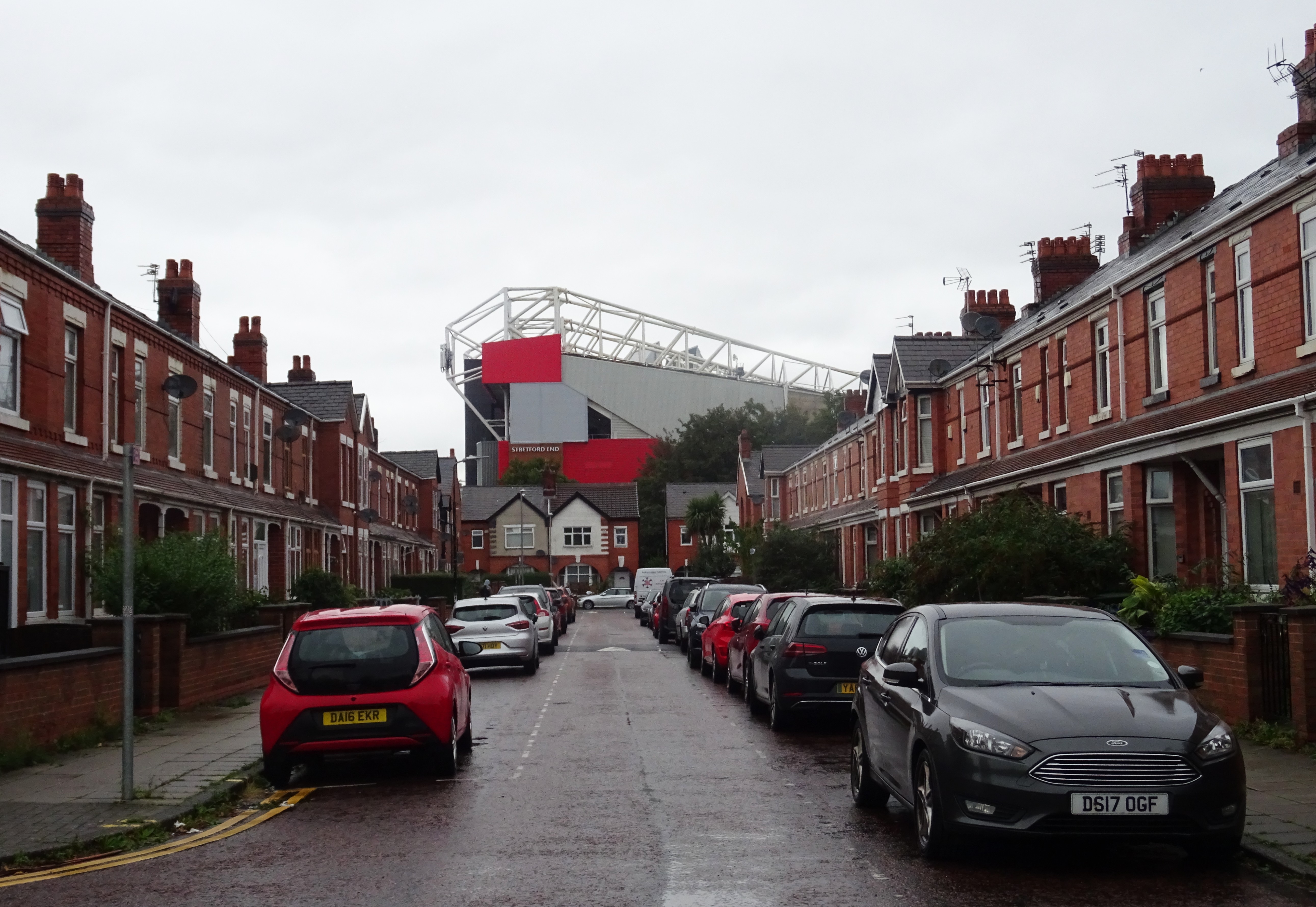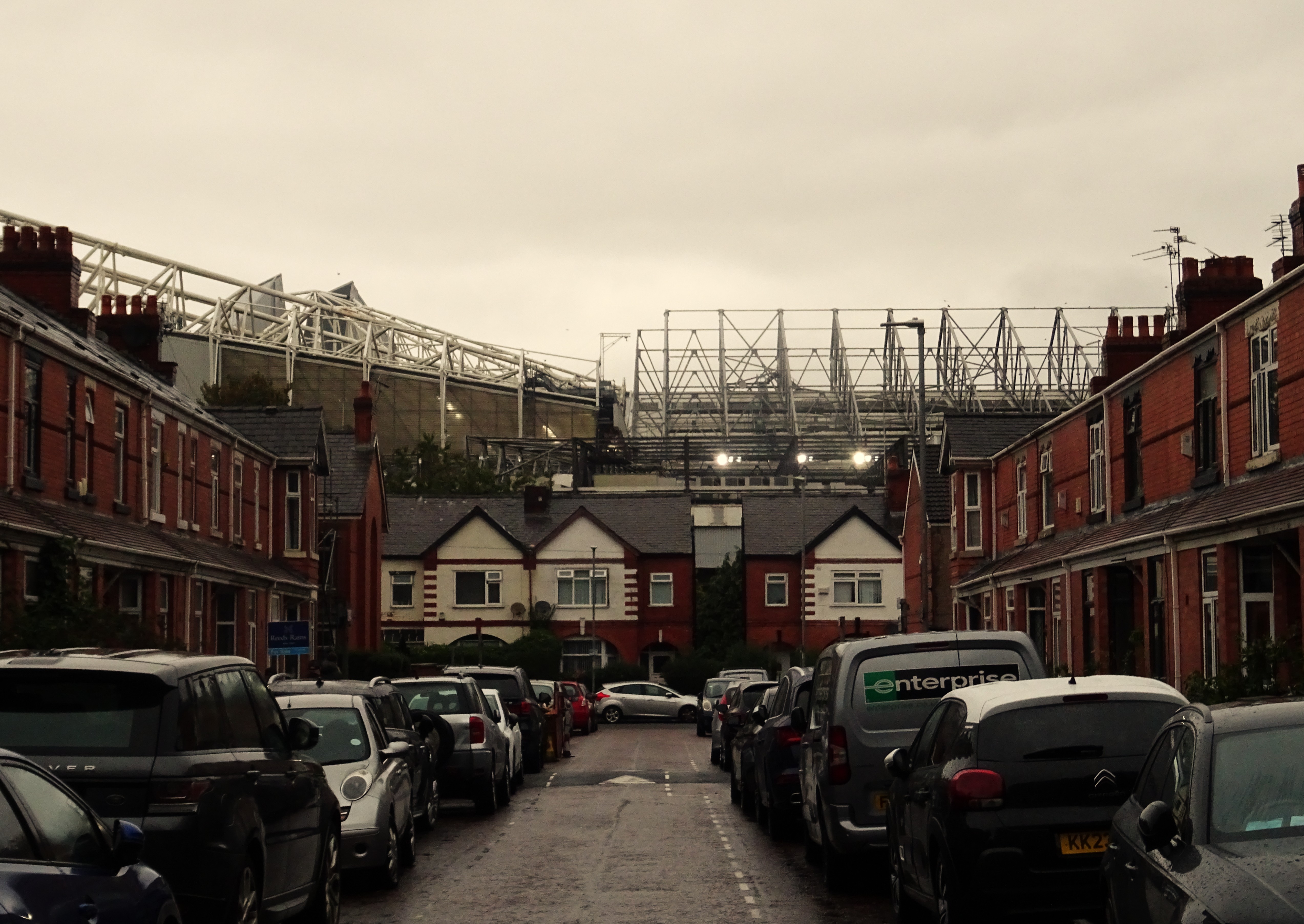 Thankfully, the weather lightened on my twenty-minute walk to Old Trafford, and I decided to take a few photos from a couple of fresh angles, with the huge steel structure of the stadium looking over the terraced houses below.