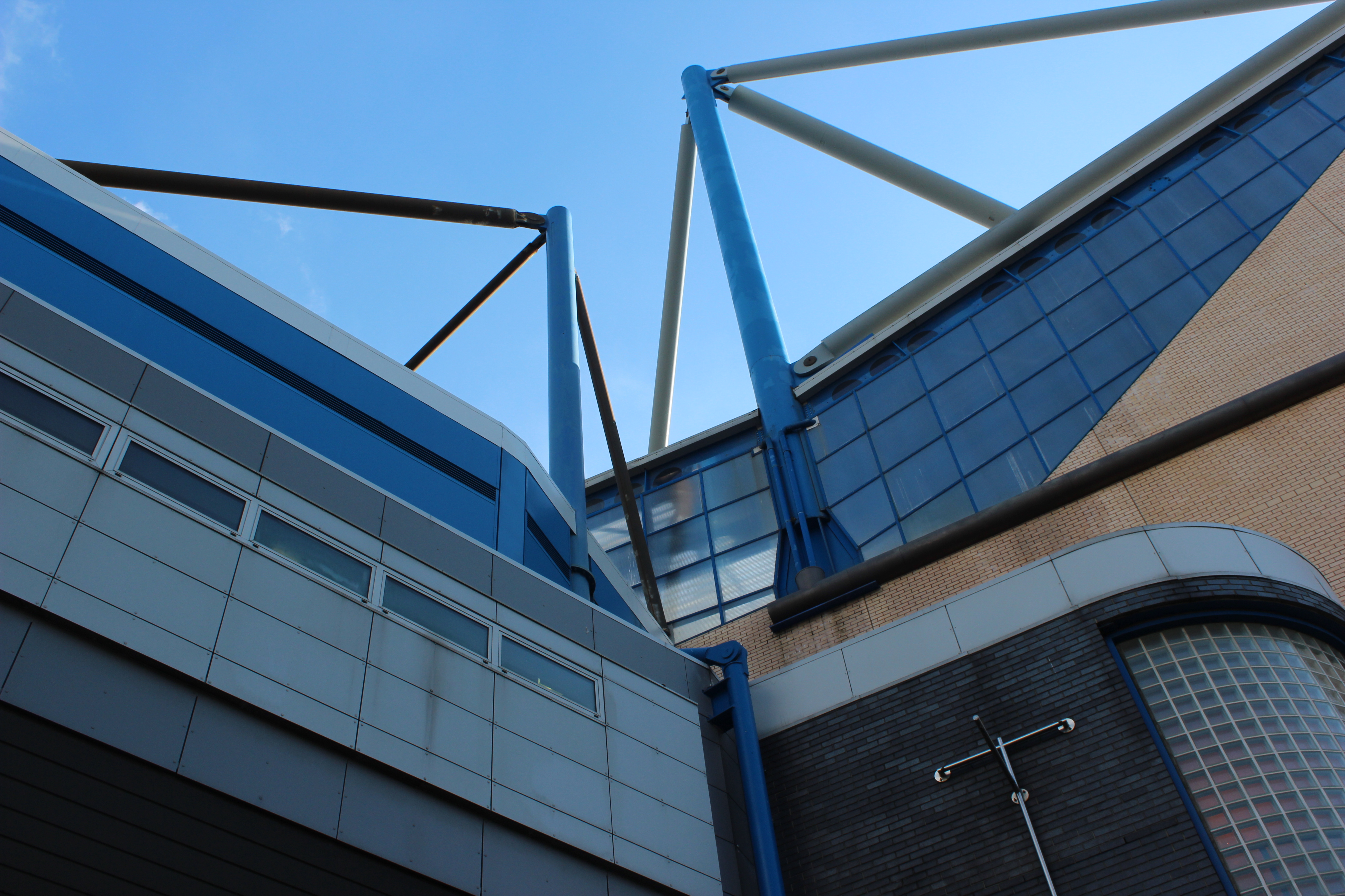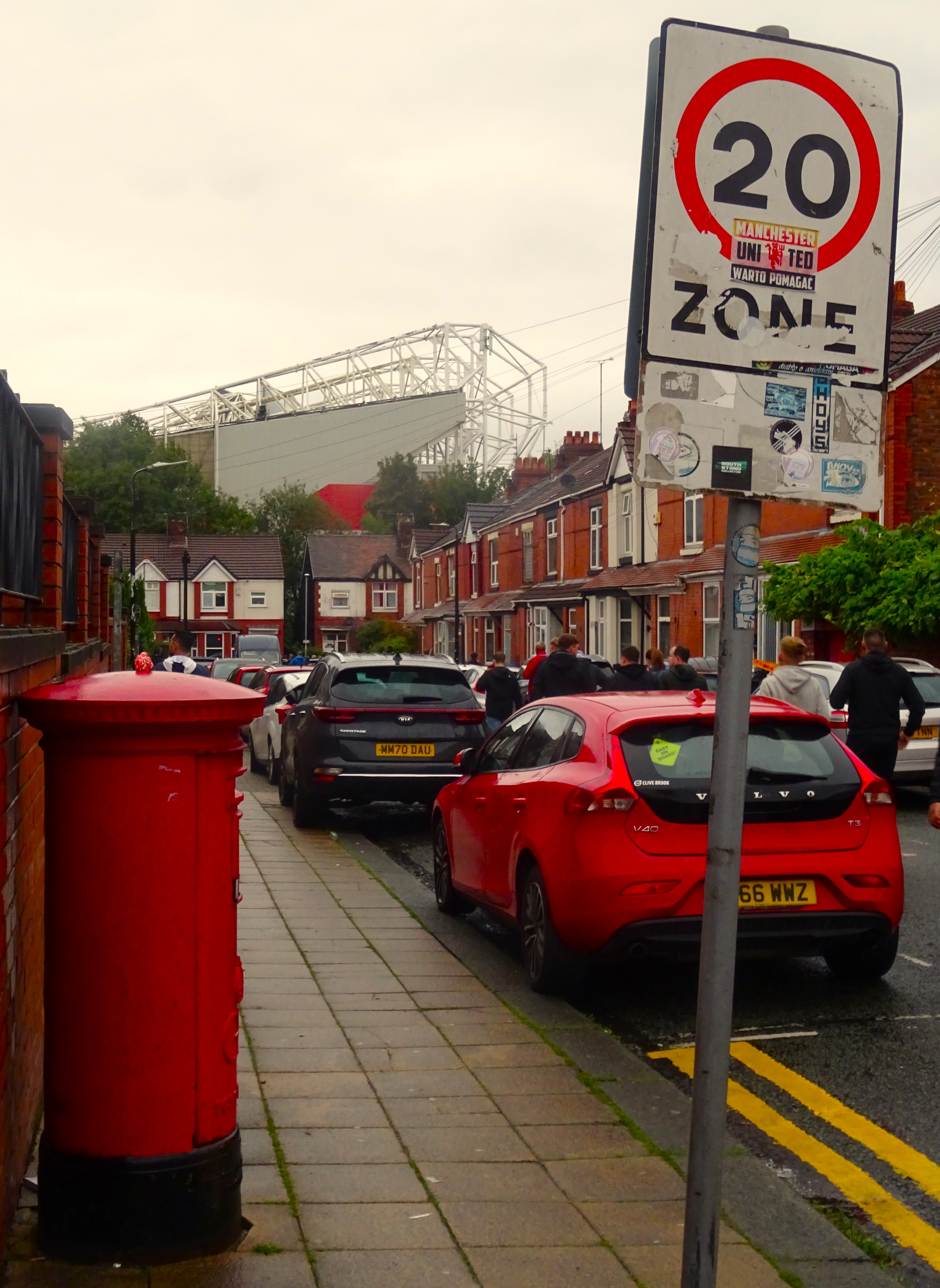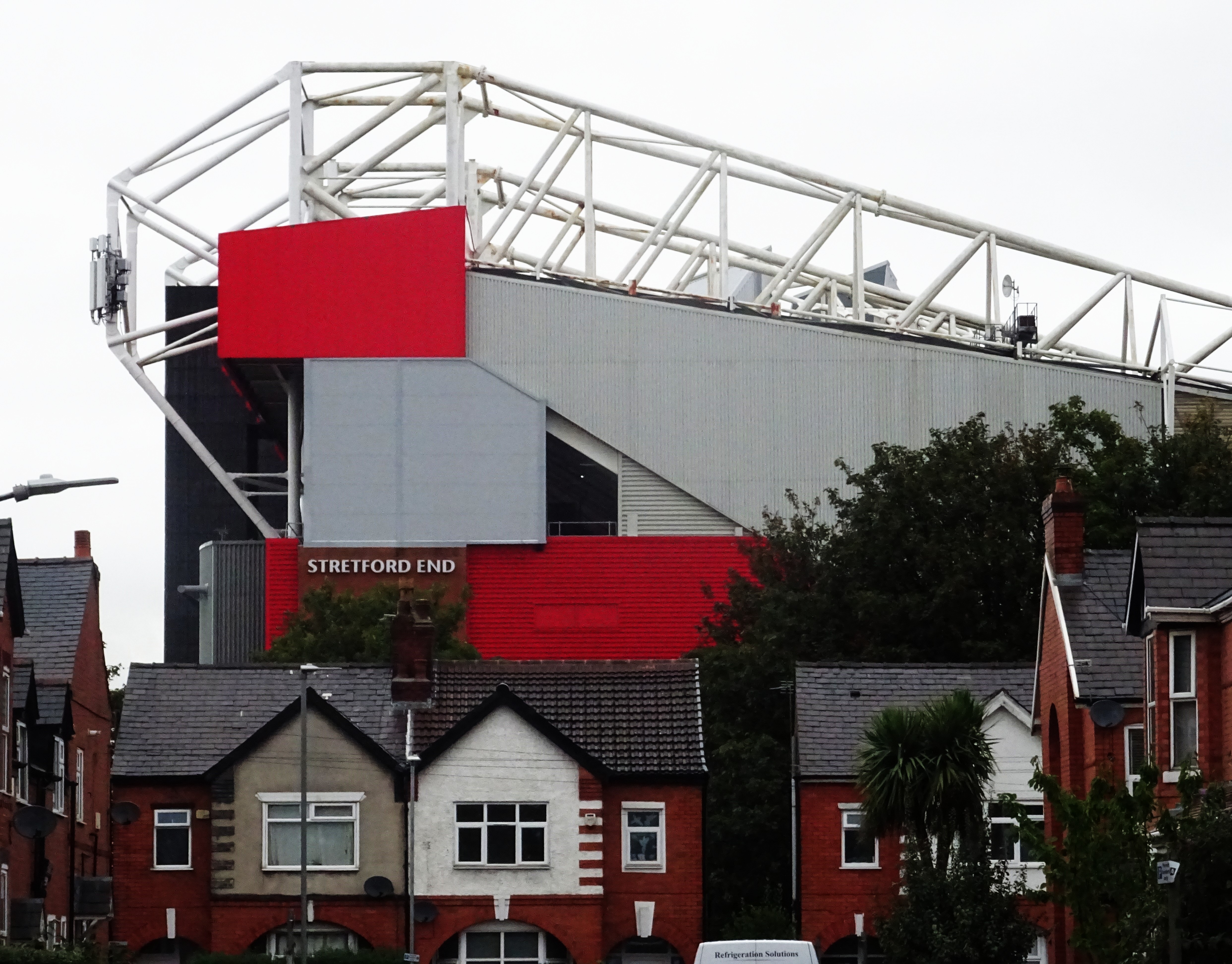 Thankfully, the weather lightened on my twenty-minute walk to Old Trafford, and I decided to take a few photos from a couple of fresh angles, with the huge steel structure of the stadium looking over the terraced houses below.