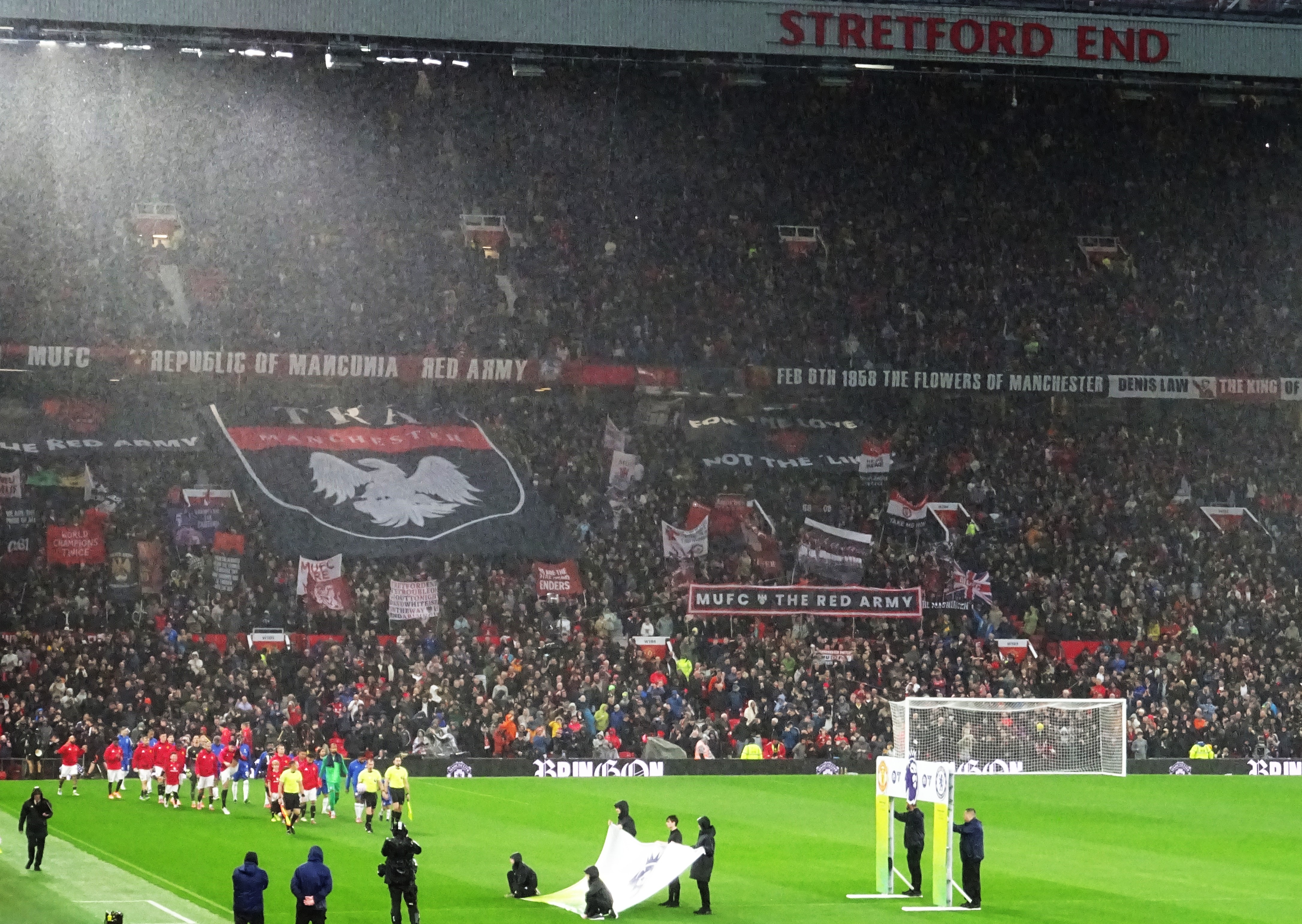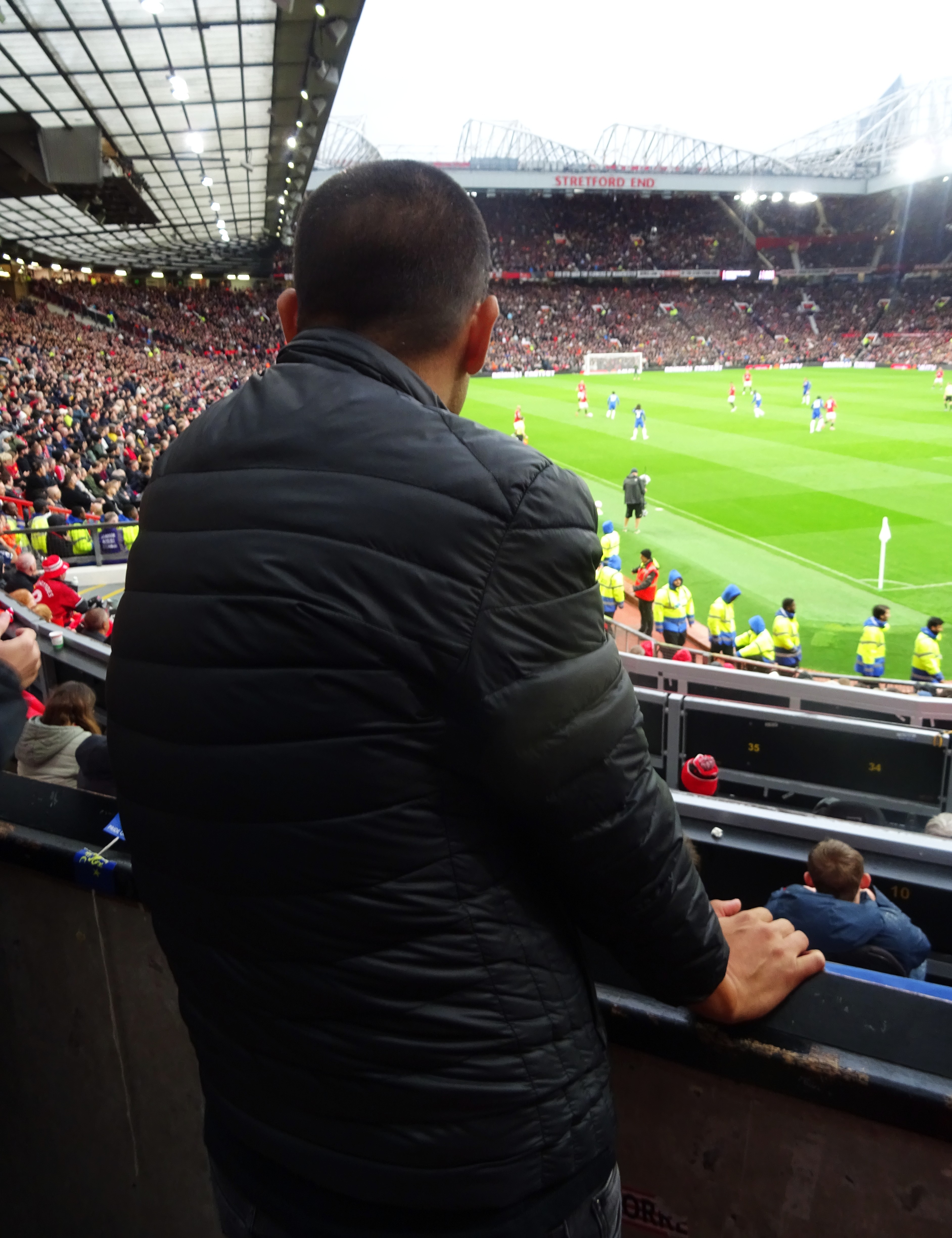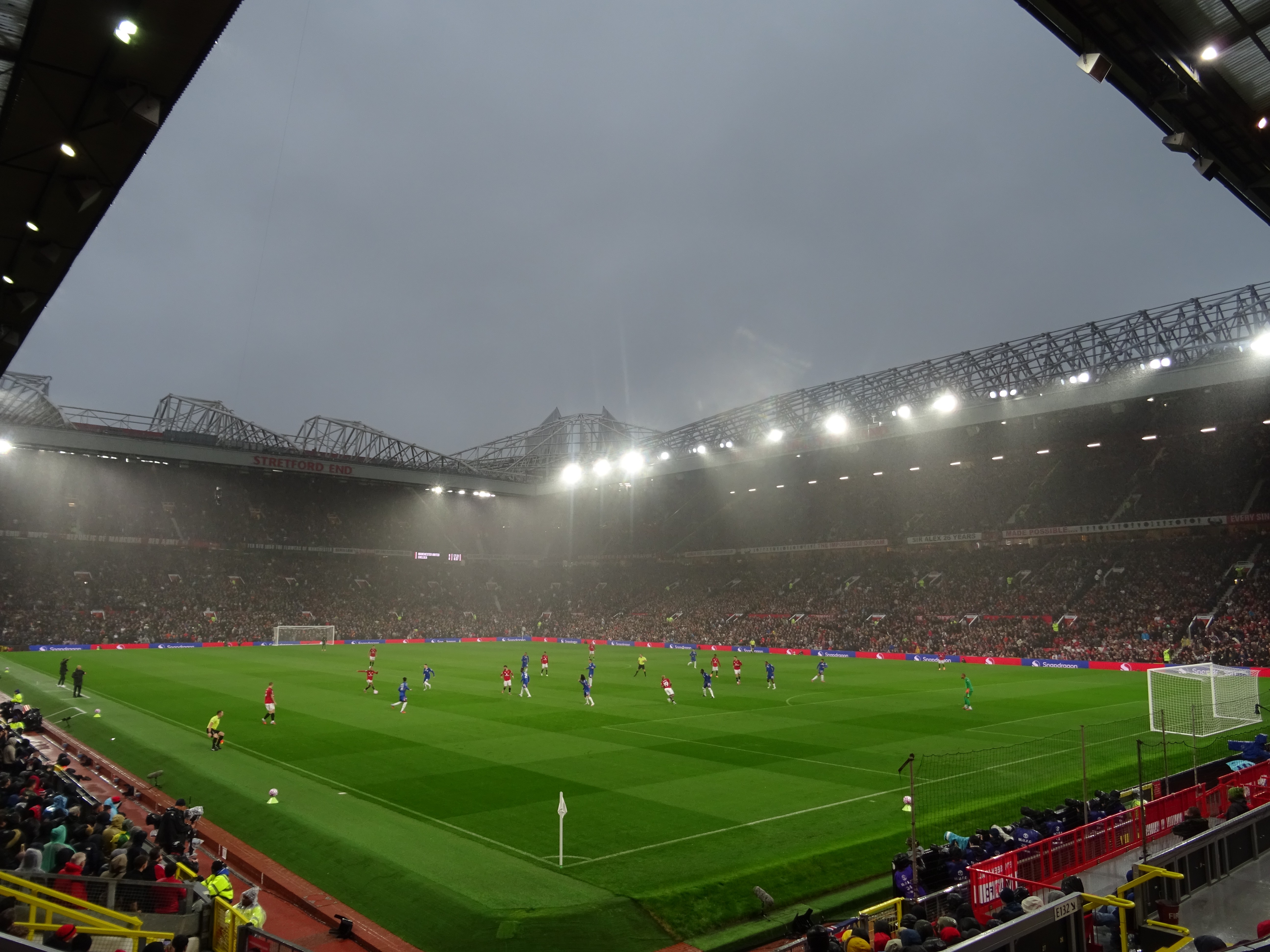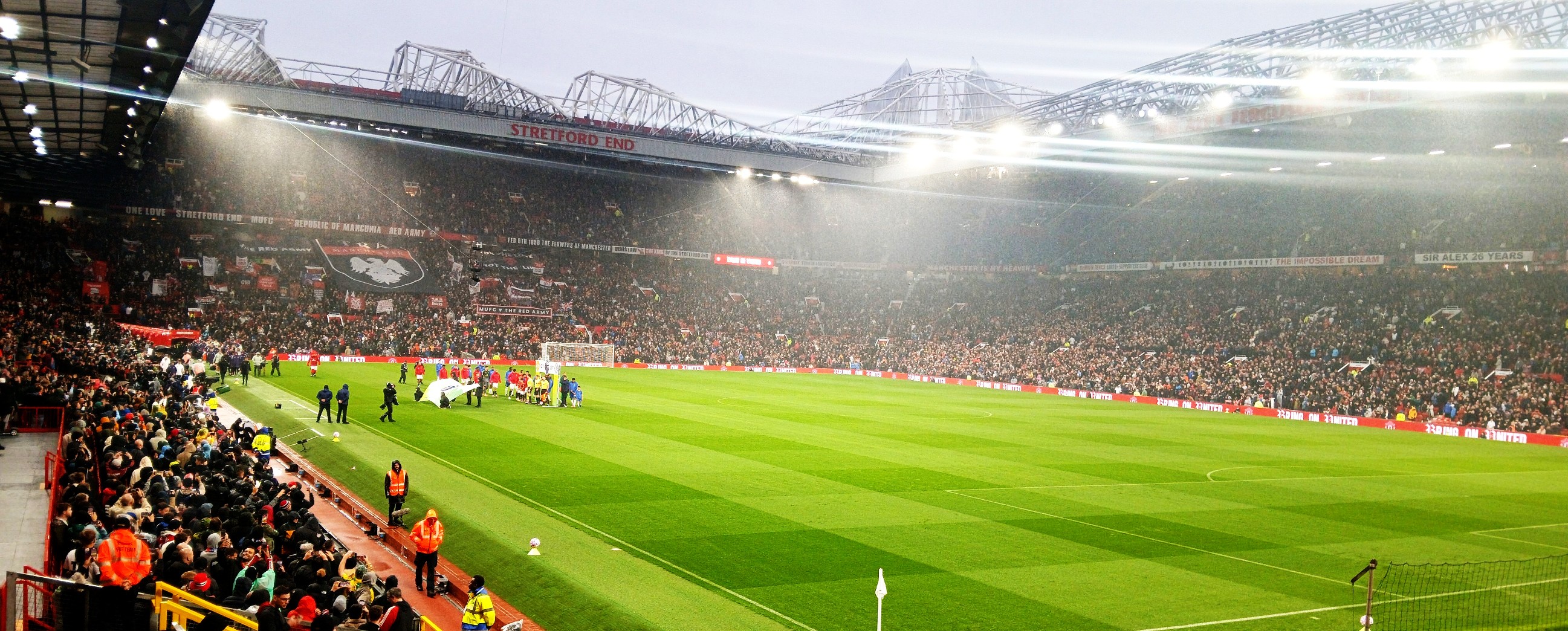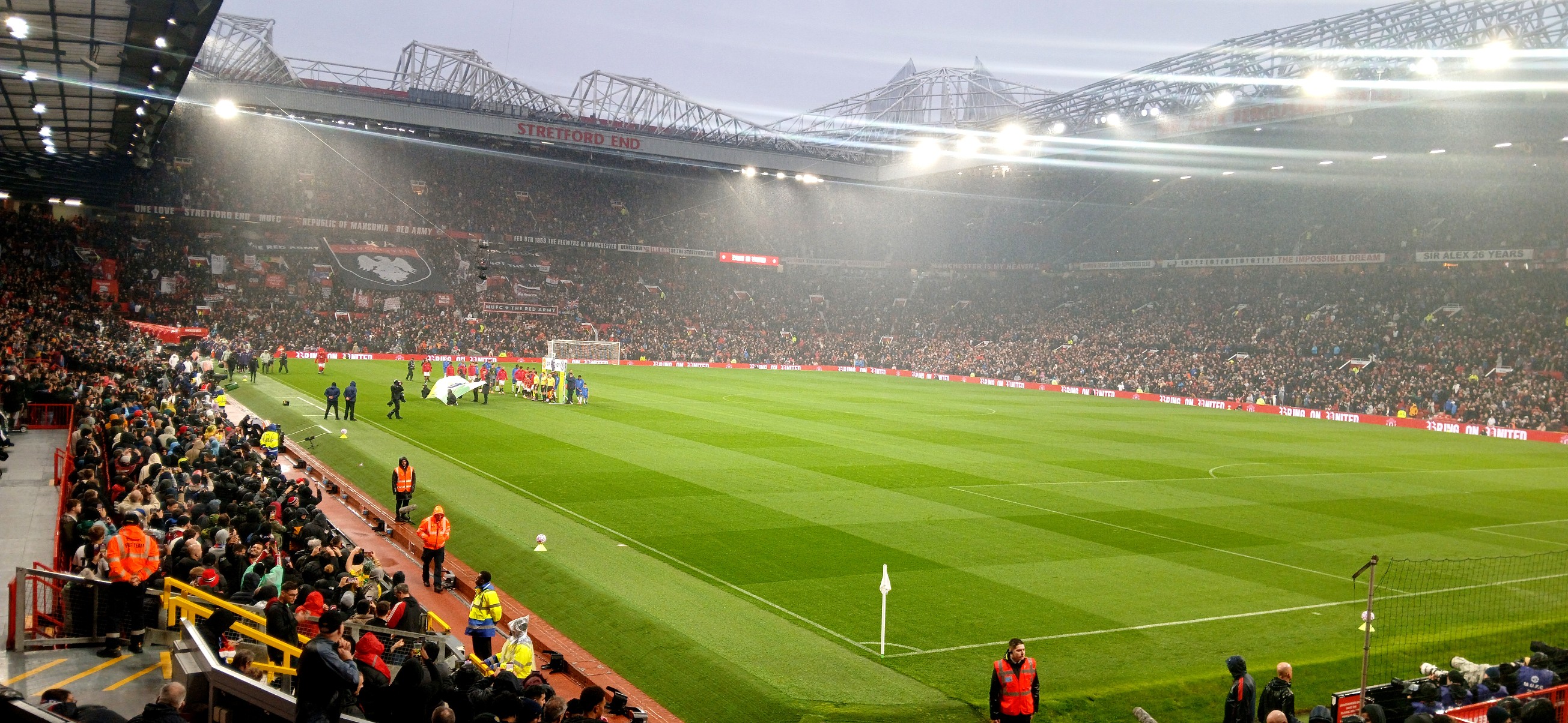 I didn’t know whether to laugh or cry that my seat, in row 2 above the corner flag, had just missed the drip, drip, drip from a hole in the stand a hundred feet above me. Even worse was the fact that two of the disabled spectators in the section right in front of me were experiencing the full effect of a leaky roof too. It seemed that their red United rain jackets would be in for a tough assignment during the early evening’s entertainment.