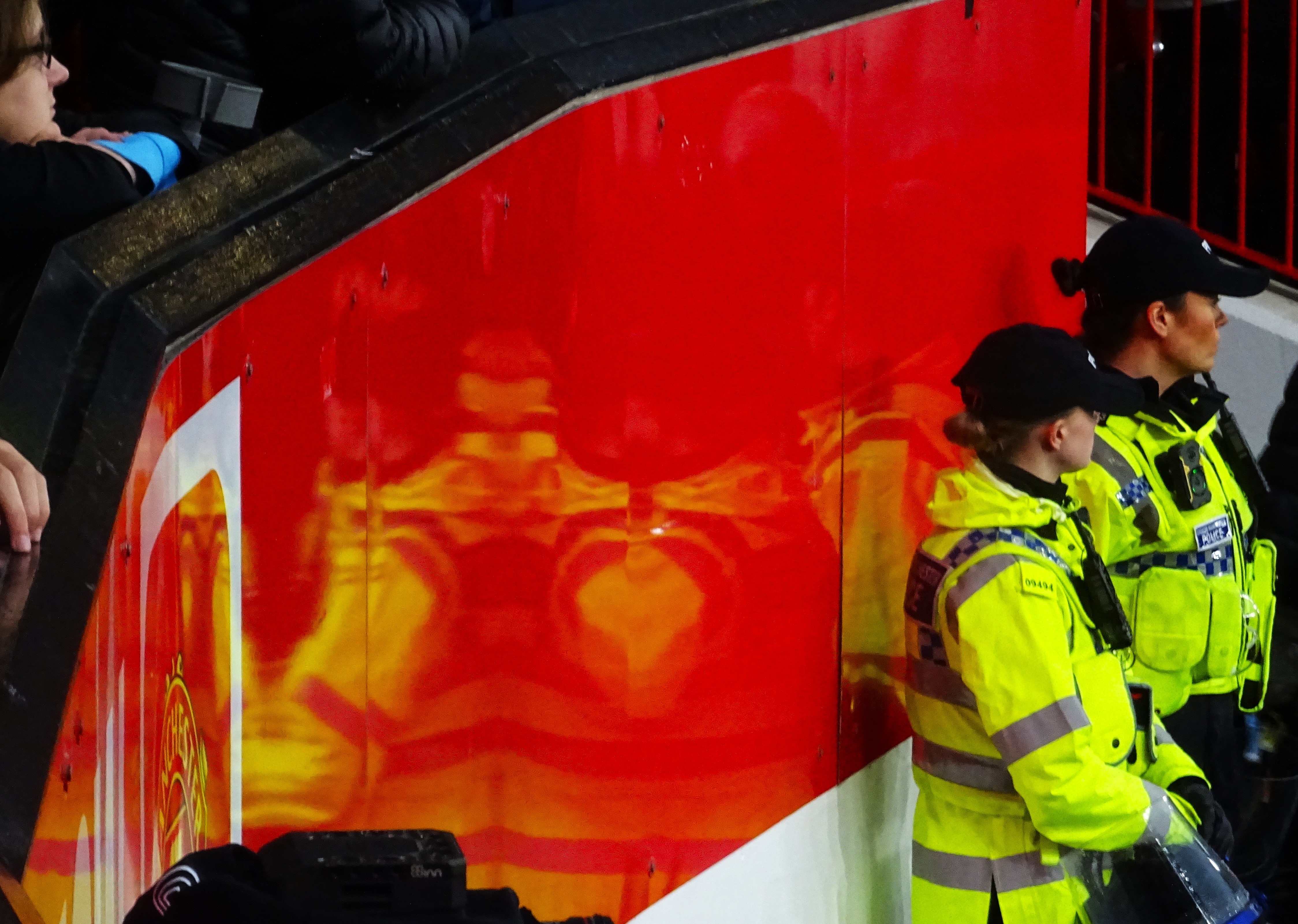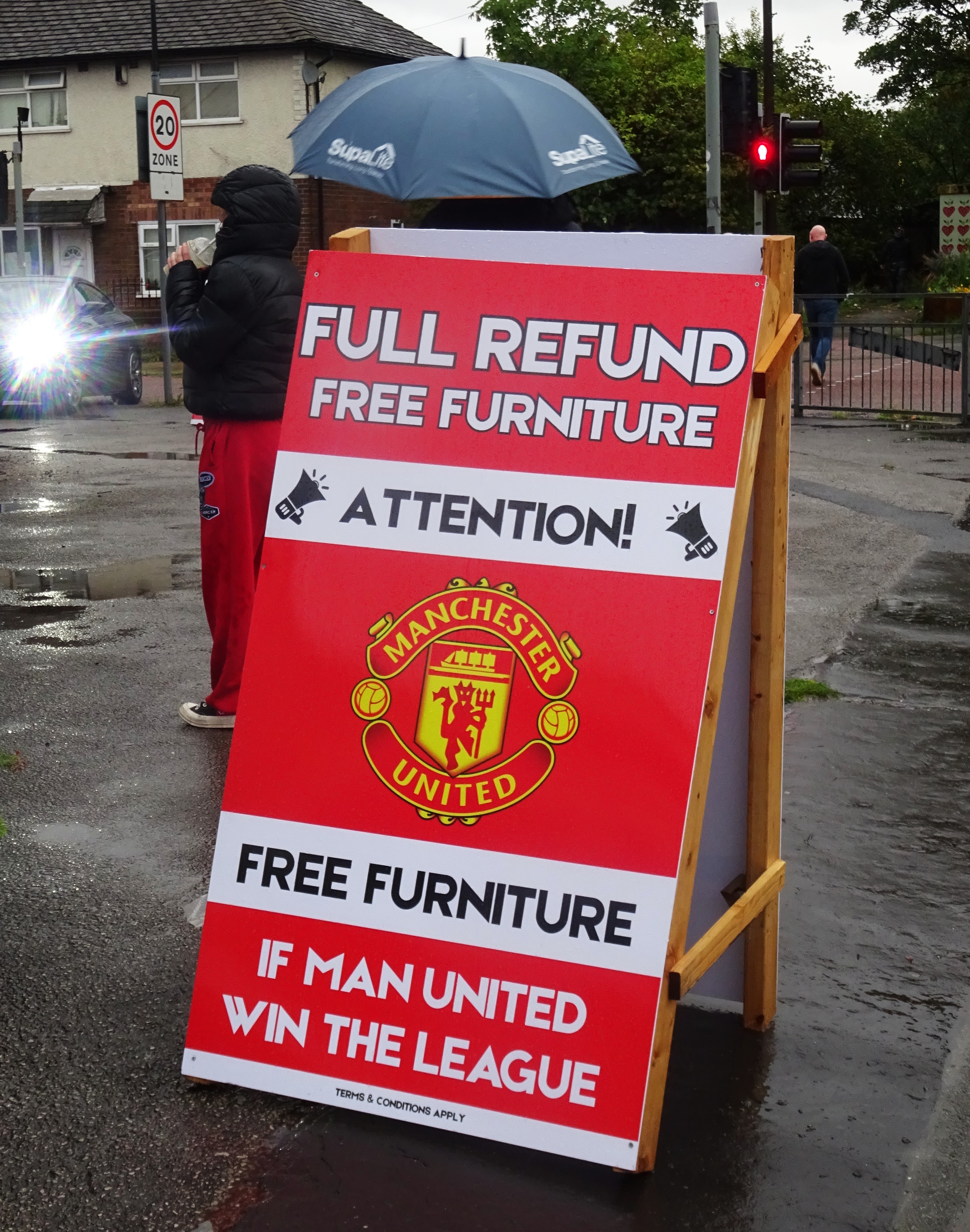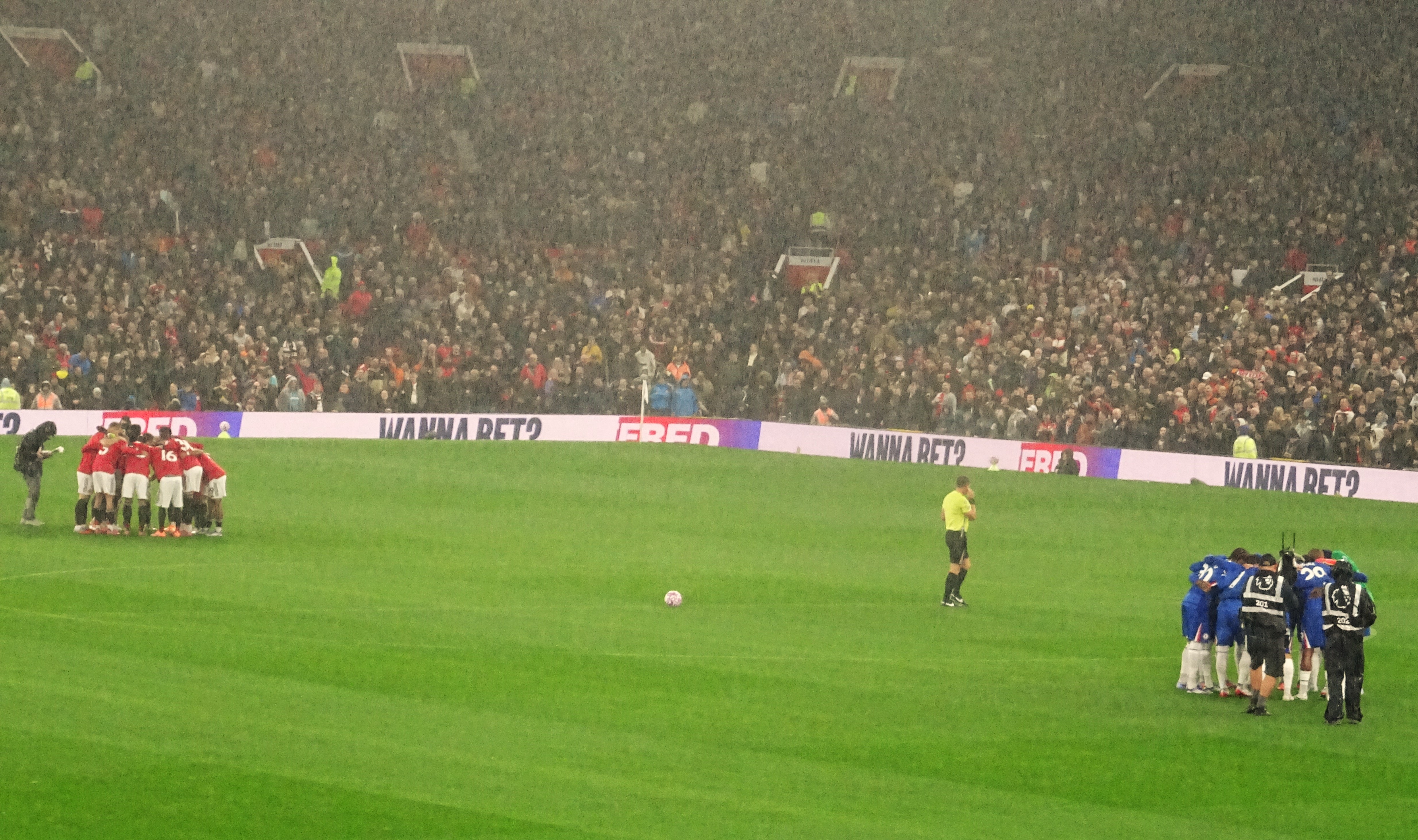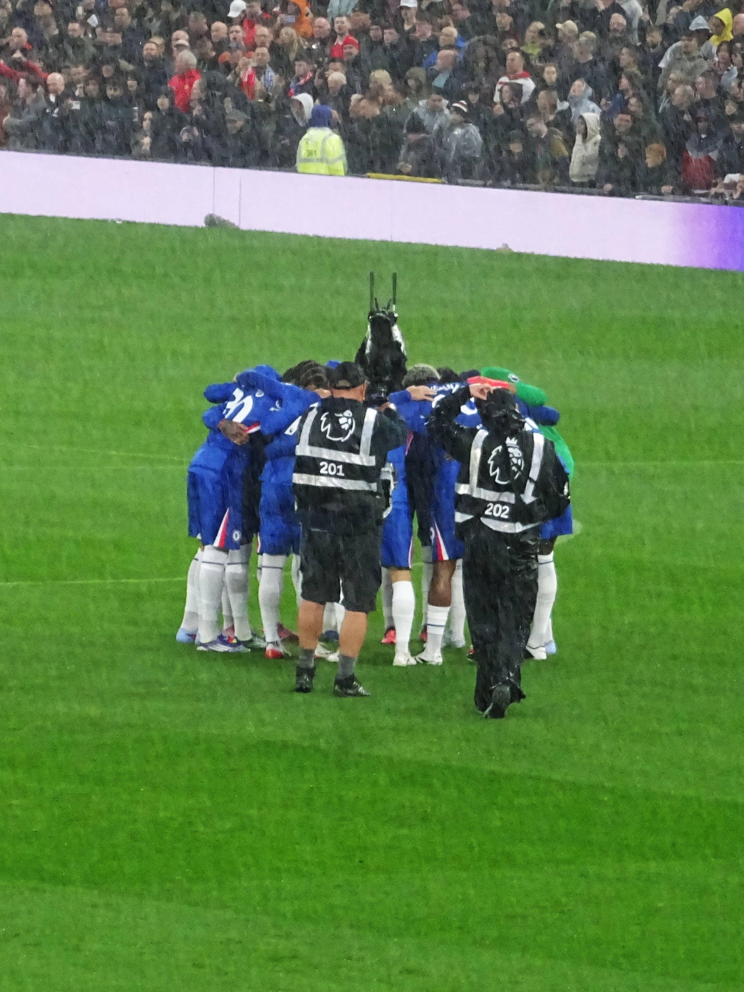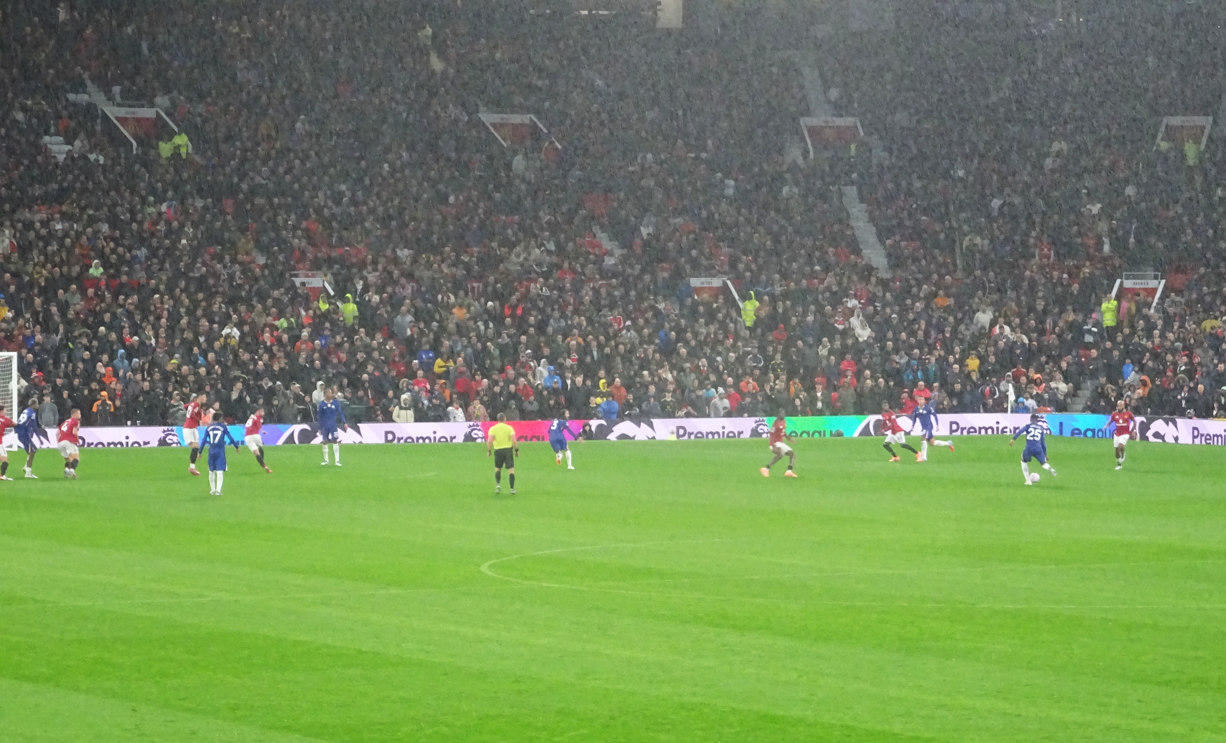 I didn’t know whether to laugh or cry that my seat, in row 2 above the corner flag, had just missed the drip, drip, drip from a hole in the stand a hundred feet above me. Even worse was the fact that two of the disabled spectators in the section right in front of me were experiencing the full effect of a leaky roof too. It seemed that their red United rain jackets would be in for a tough assignment during the early evening’s entertainment.