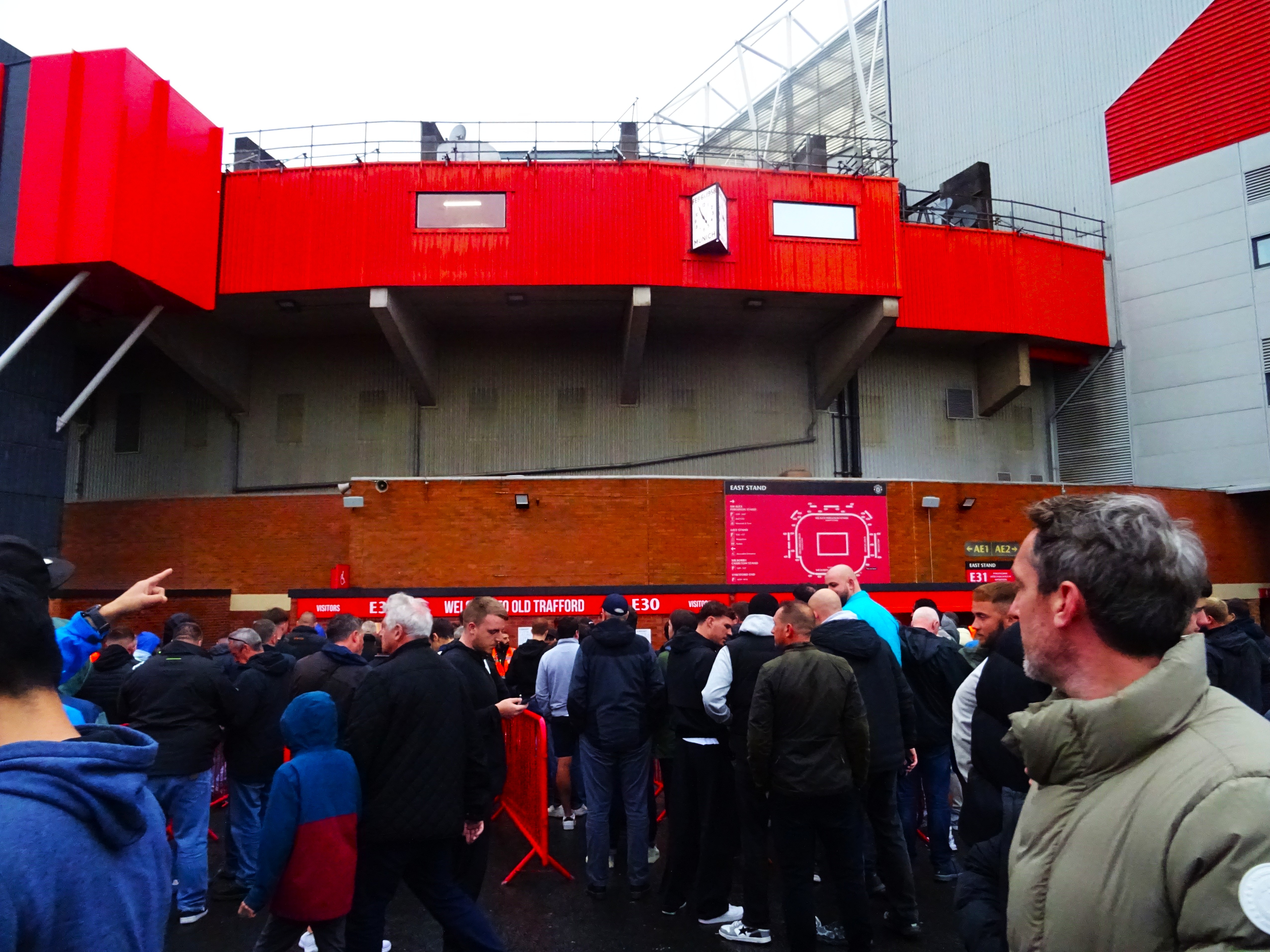 I paid my £10 – it was £15 last season, are United now worth 66% of their 2024 value? – and zipped up my jacket, donned my baseball cap, and away I went, fearing the worst. The rain still lashed down, and I expected to be drenched by the time I reached the familiar slope of the forecourt underneath the Munich clock.