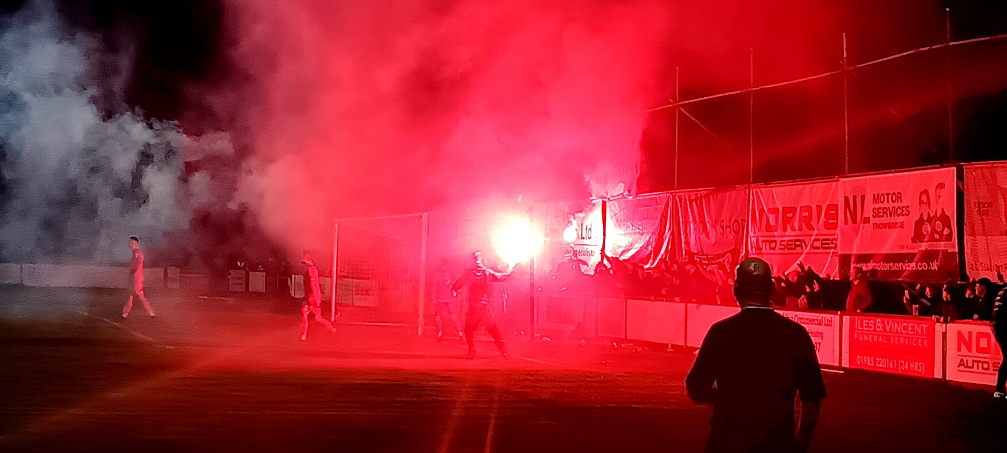 The players reeled away in ecstasy and the travelling Frome support let off a few red flares, as they had done at kick-off.
