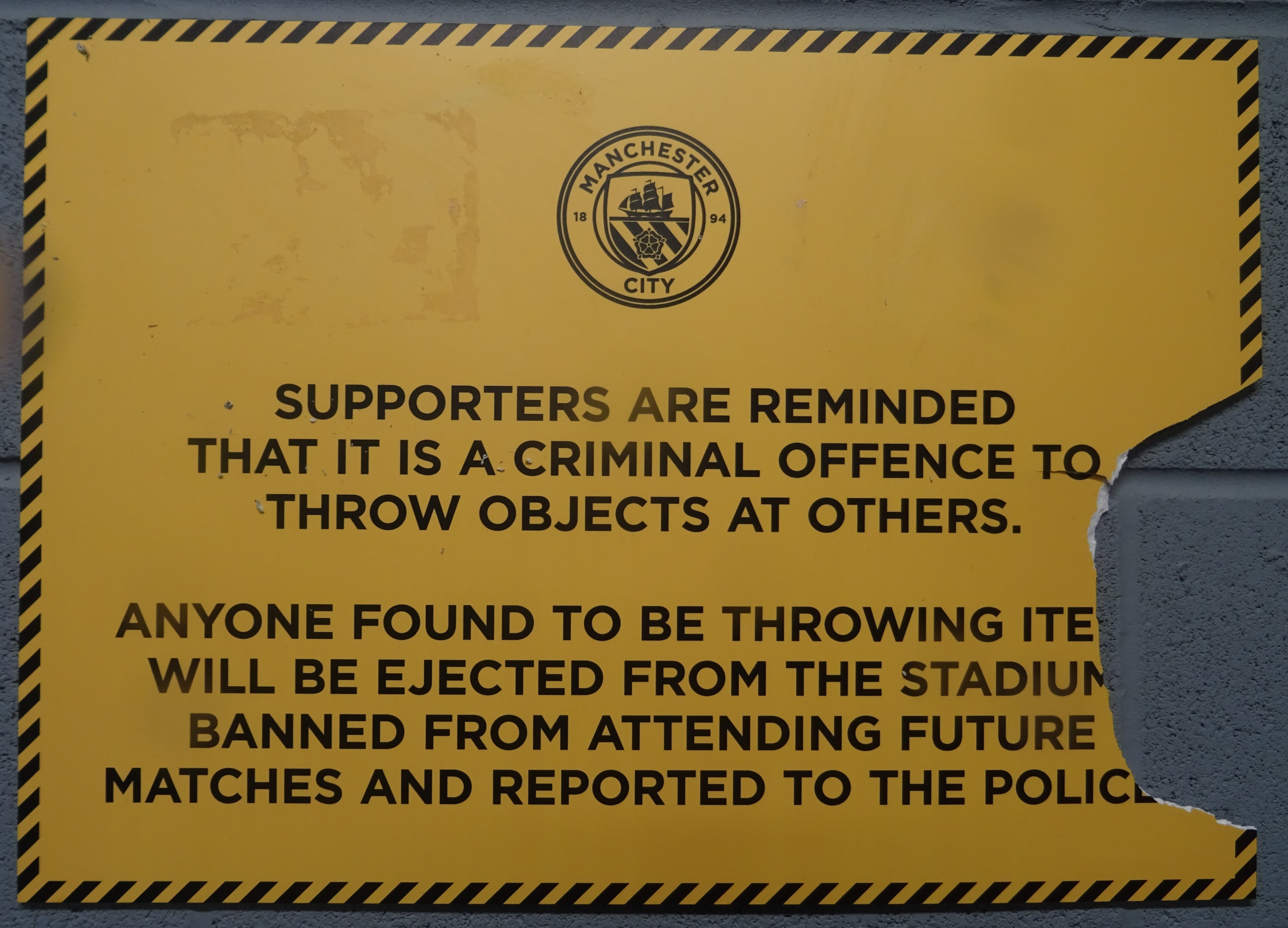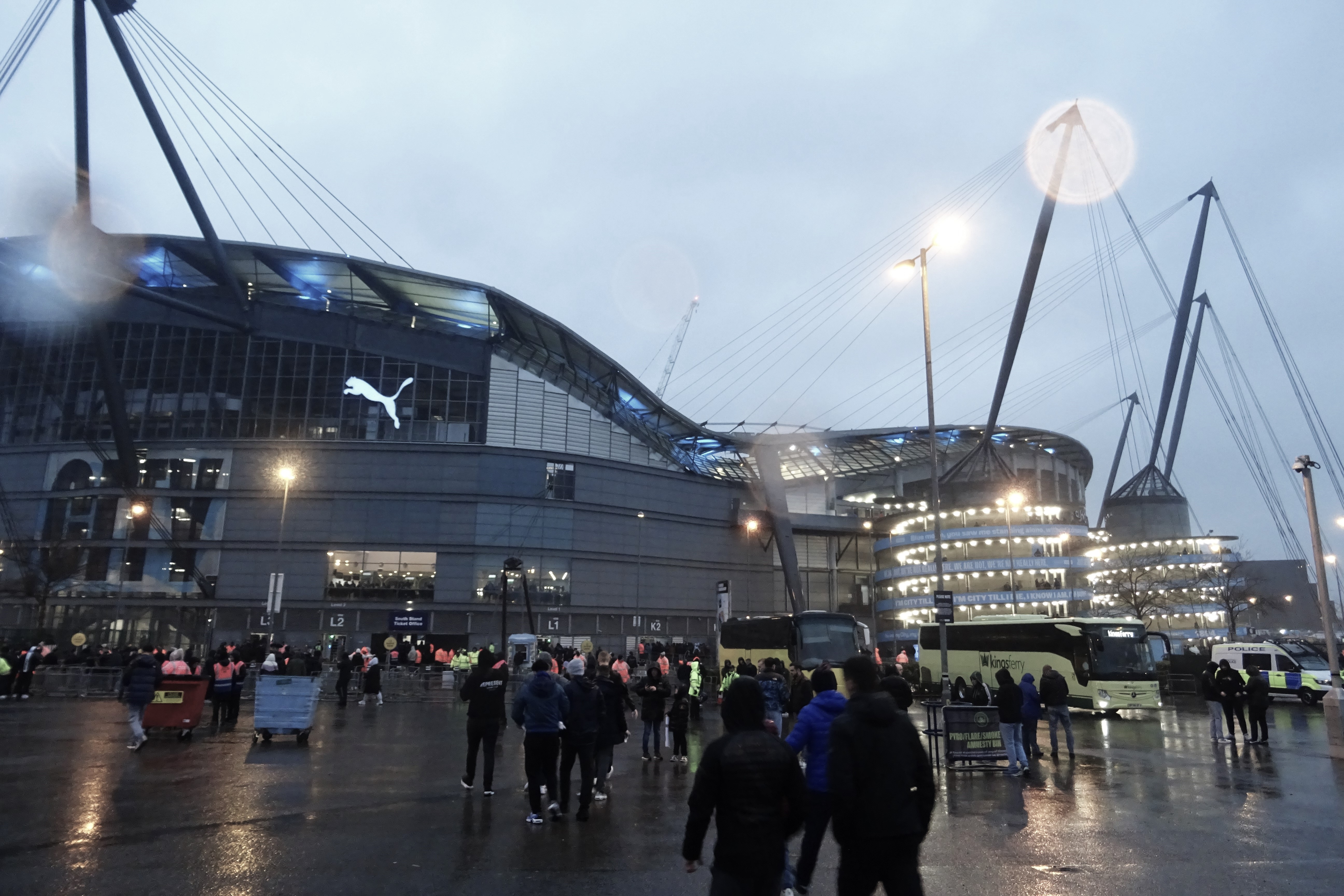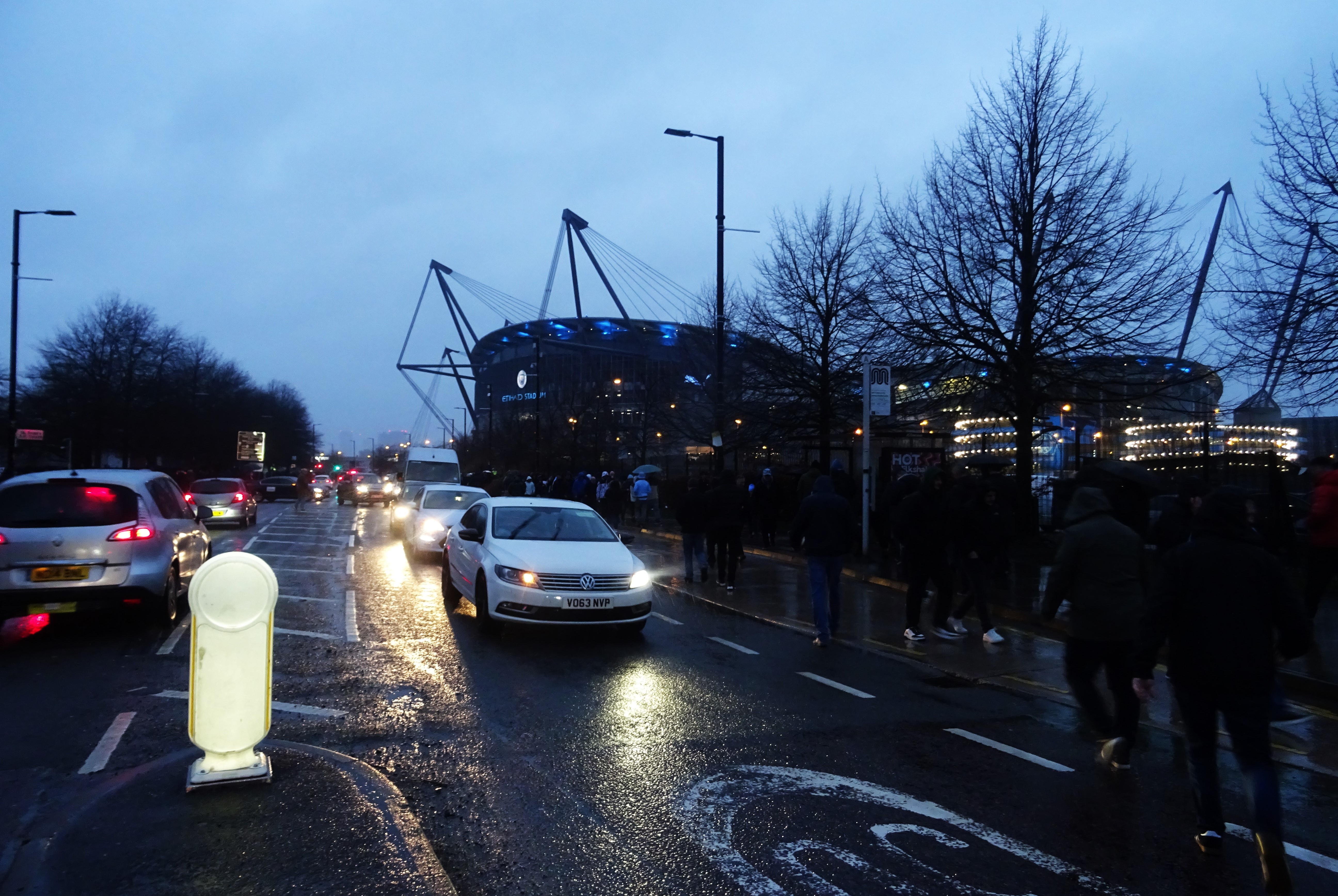 I set off for the Etihad at 3.45pm. This is a familiar route these days. In past the airport, around the M60 Orbital, through Stockport, then a jagged cut through towards the stadium, along surprisingly wide roads. It was lashing down as I dropped the boys off outside the away entrance at “Mr. Mac’s Stadium Chippy.” I backtracked to park up at our usual spot opposite the “The Grove” public house where we spent a miserable hour after last season’s away game.
