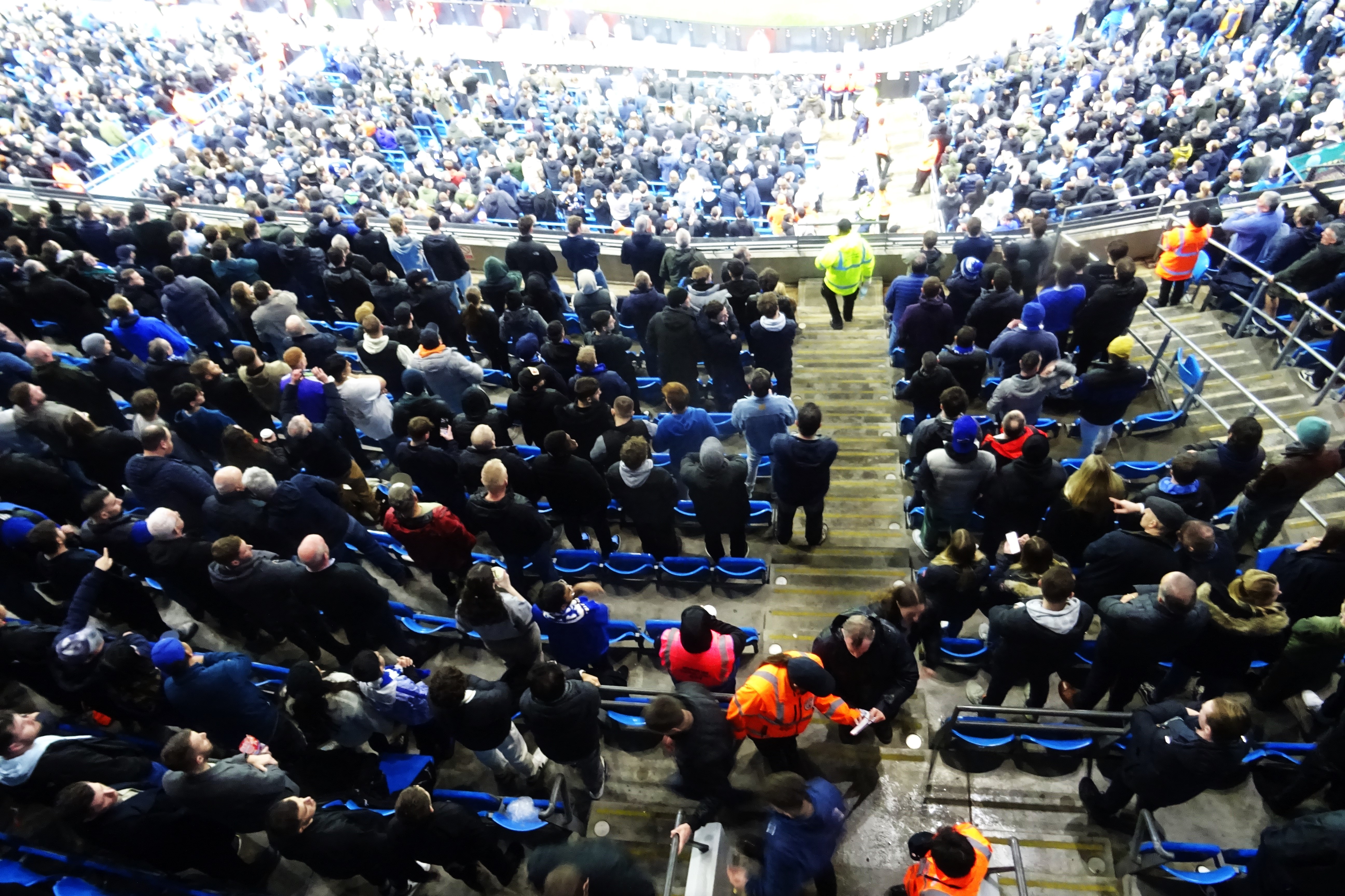 I was alongside Parky – and Gal, and John – in effectively the front row of “Level Three” aka the Upper Tier. We were right next to the wall of the stand, beyond a void that housed only security staff, a few Old Bill and, oddly, a load of sky blue seats stacked up in neat rows. PD and Glenn were just a few rows behind us, again right next to the wall. This was Glenn’s first visit to City since a game in September 2008, a nice 3-1 win.