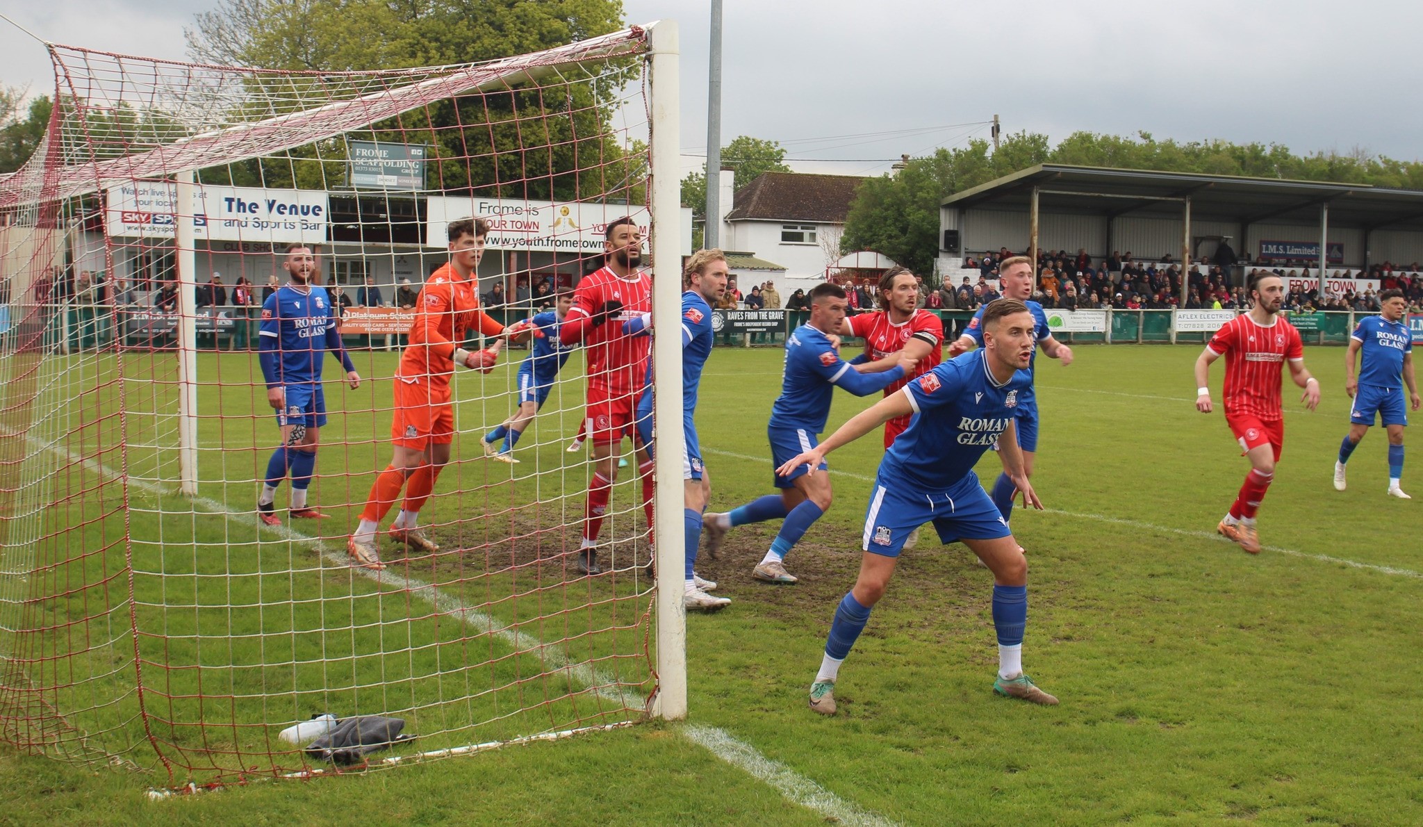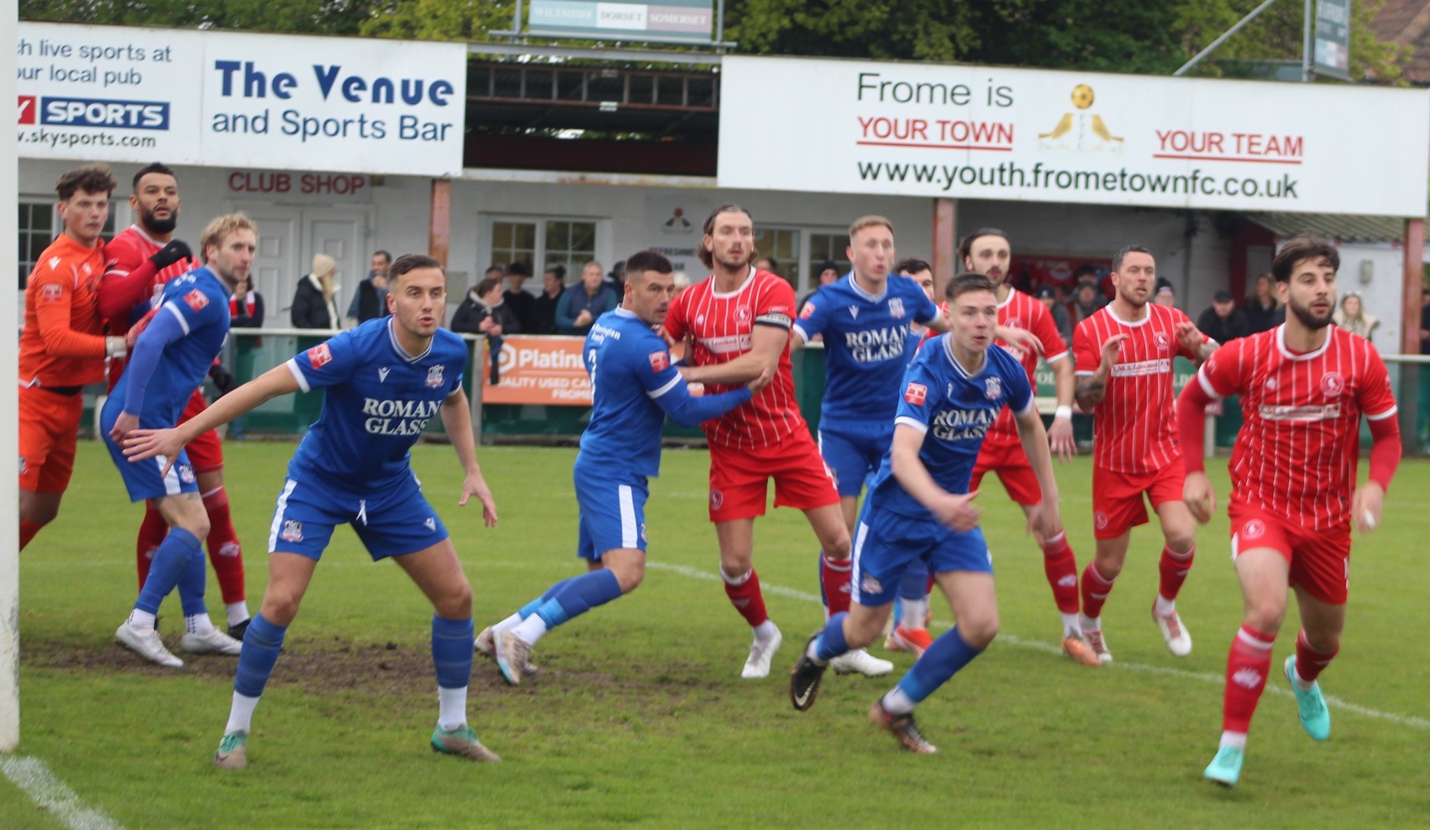 After Tuesday’s game at Tavistock. when the home side inflicted a 3-2 defeat to Southern League South league leaders Wimborne Town, all eyes were on Frome Town’s final game of the regular season against Bristol Manor Farm. A win for Frome and anything but a win for Wimborne at nearby Melksham Town would result in my local team returning to the Southern League Premier South for the first time since relegation in 2019.